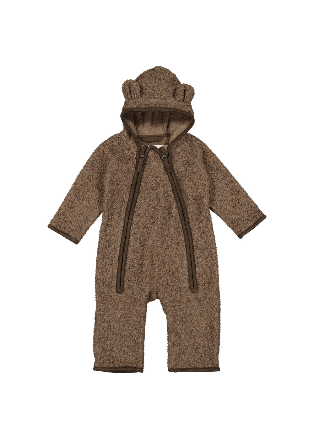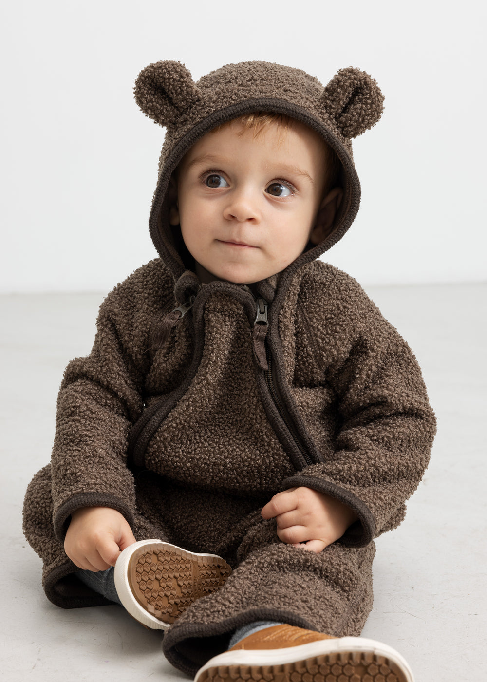 Teddy dragt med fleece på indersiden, lynlåslukning i begge sider samt en hætte med søde øre. Teddy dragten er både varm, blød og behagelig at have på.