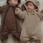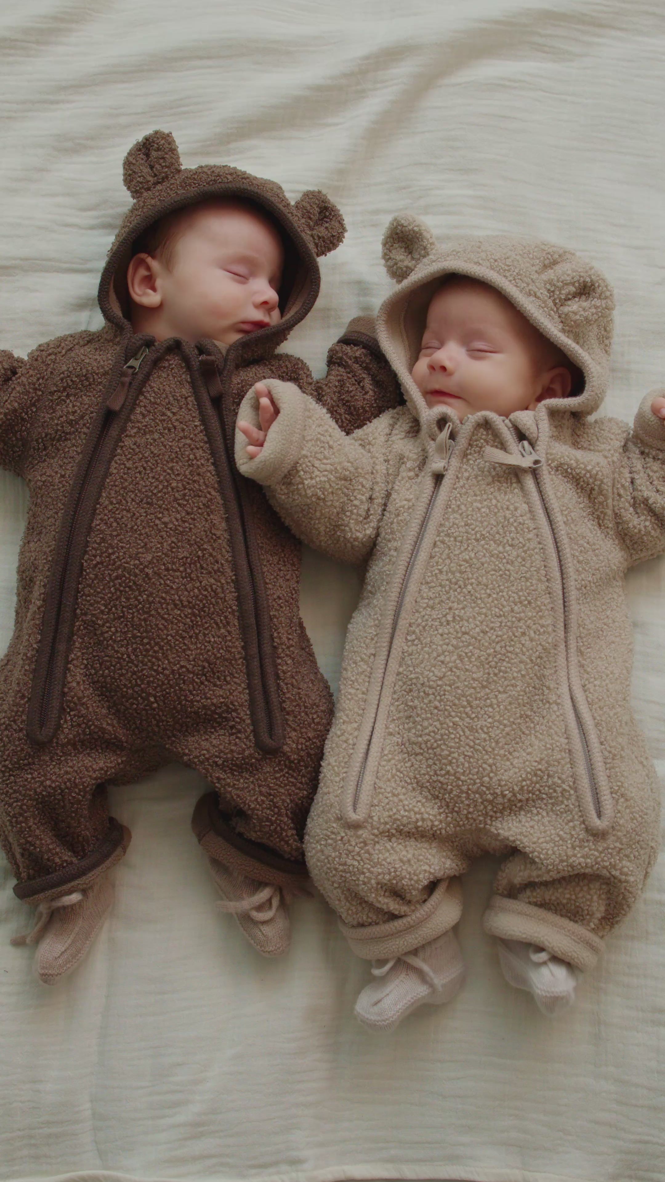 To babyer liggende iført teddyheldragter i lyse og mørke brune nuancer