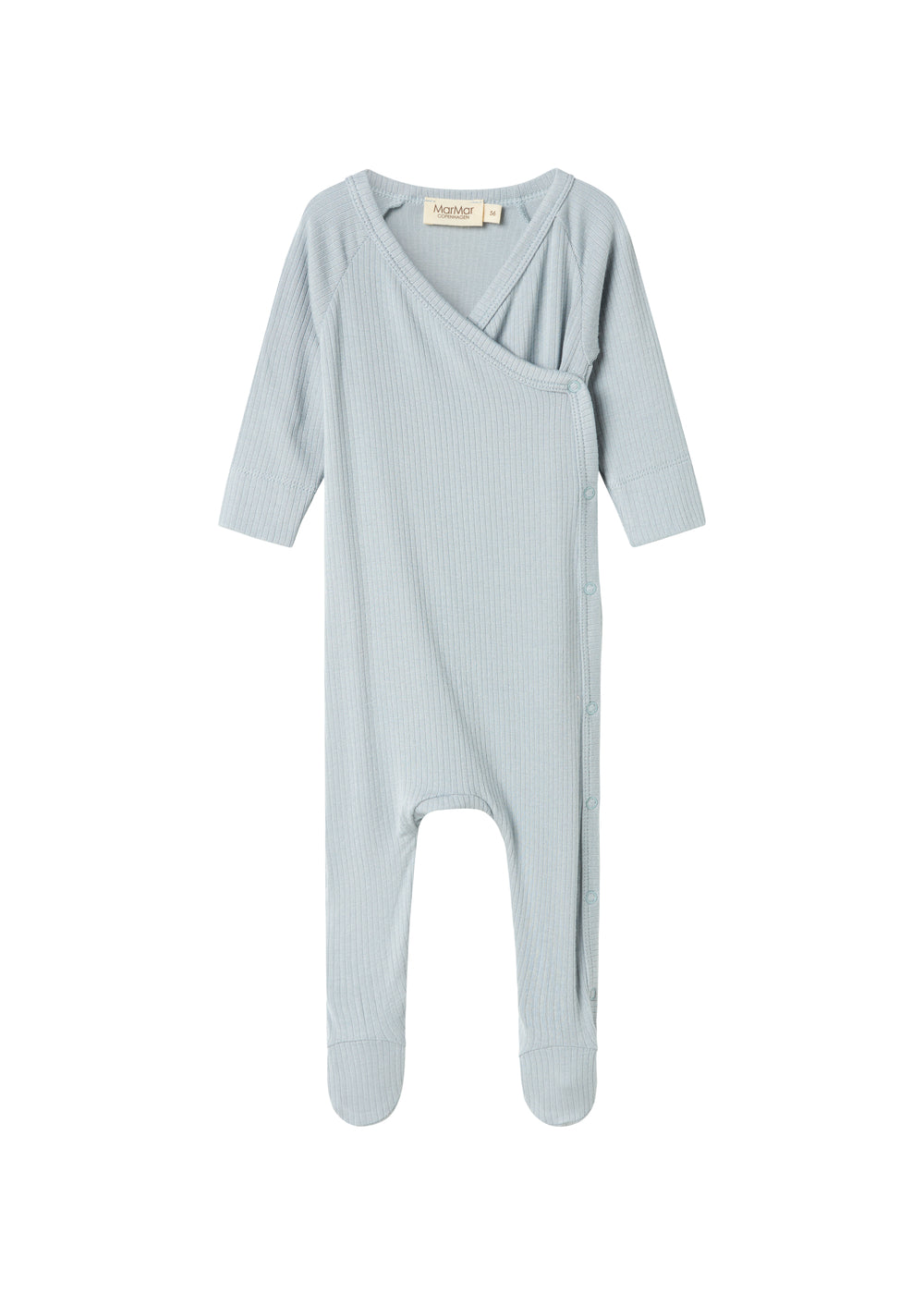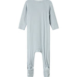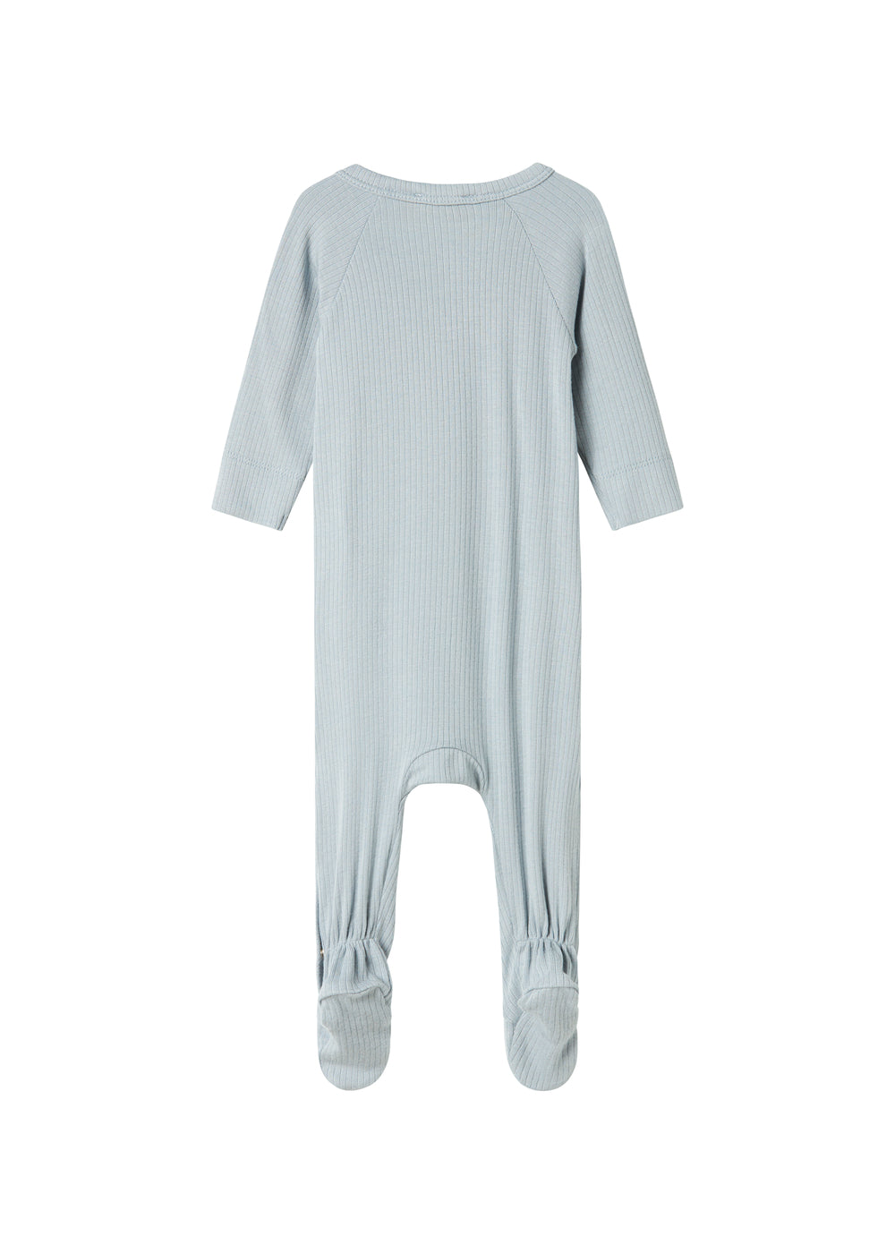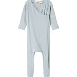 Langærmet heldragt med fødder til nyfødte. Heldragten har slå-om-lukning og lukkes med trykknapper fra halsen og ned langs det ene ben. Heldragten er utrolig blød, meget strækbar og behagelig at have på.