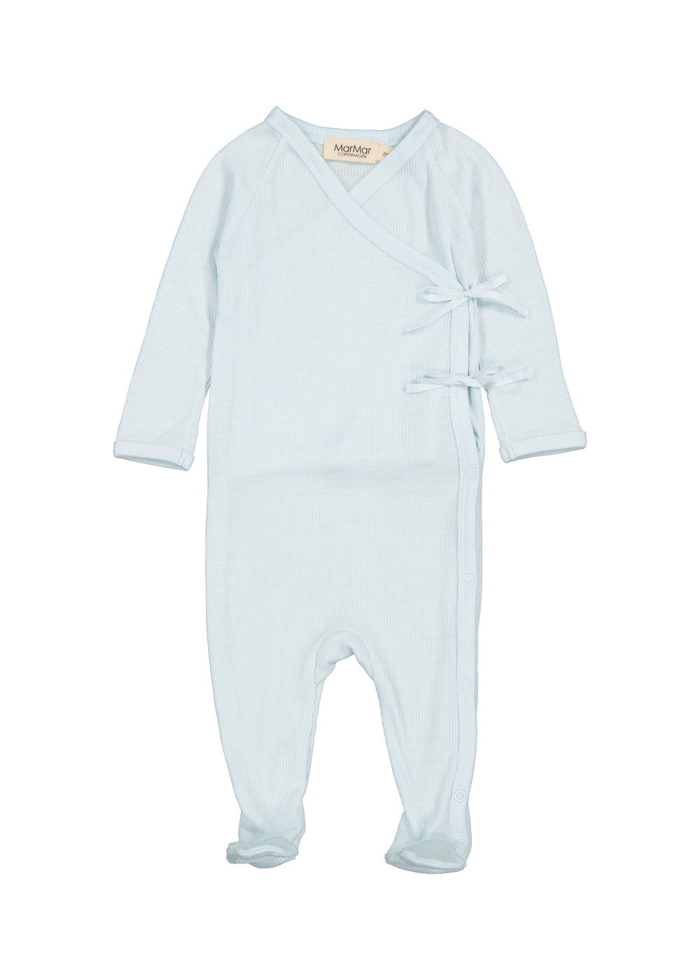 Langærmet heldragt med fødder til de mindste i 100% merino uld. Heldragten har slå-om-lukning og lukkes med trykknapper og bindebånd fra halsen og ned langs det ene ben.