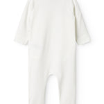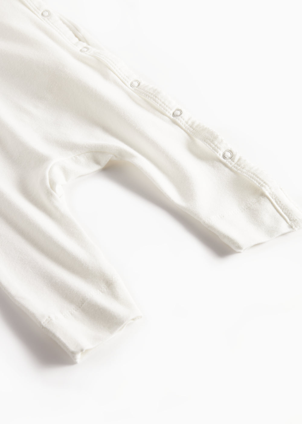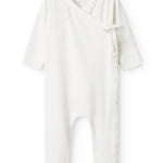 Langærmet heldragt med slå-om-lukning, heldragten lukkes med trykknapper og bindebånd fra halsen og ned langs det ene ben.