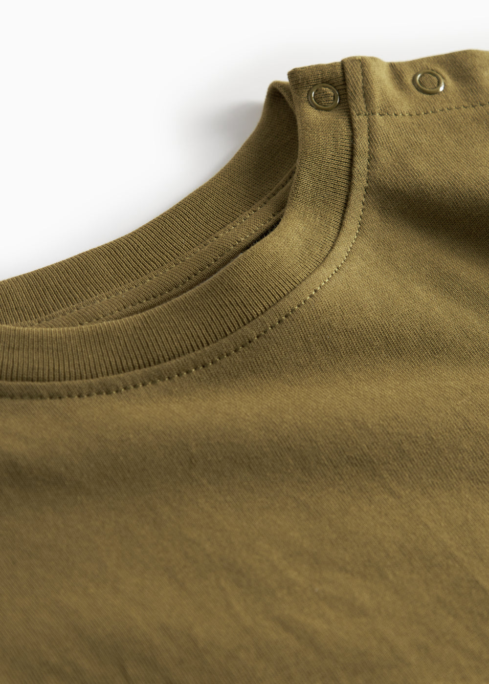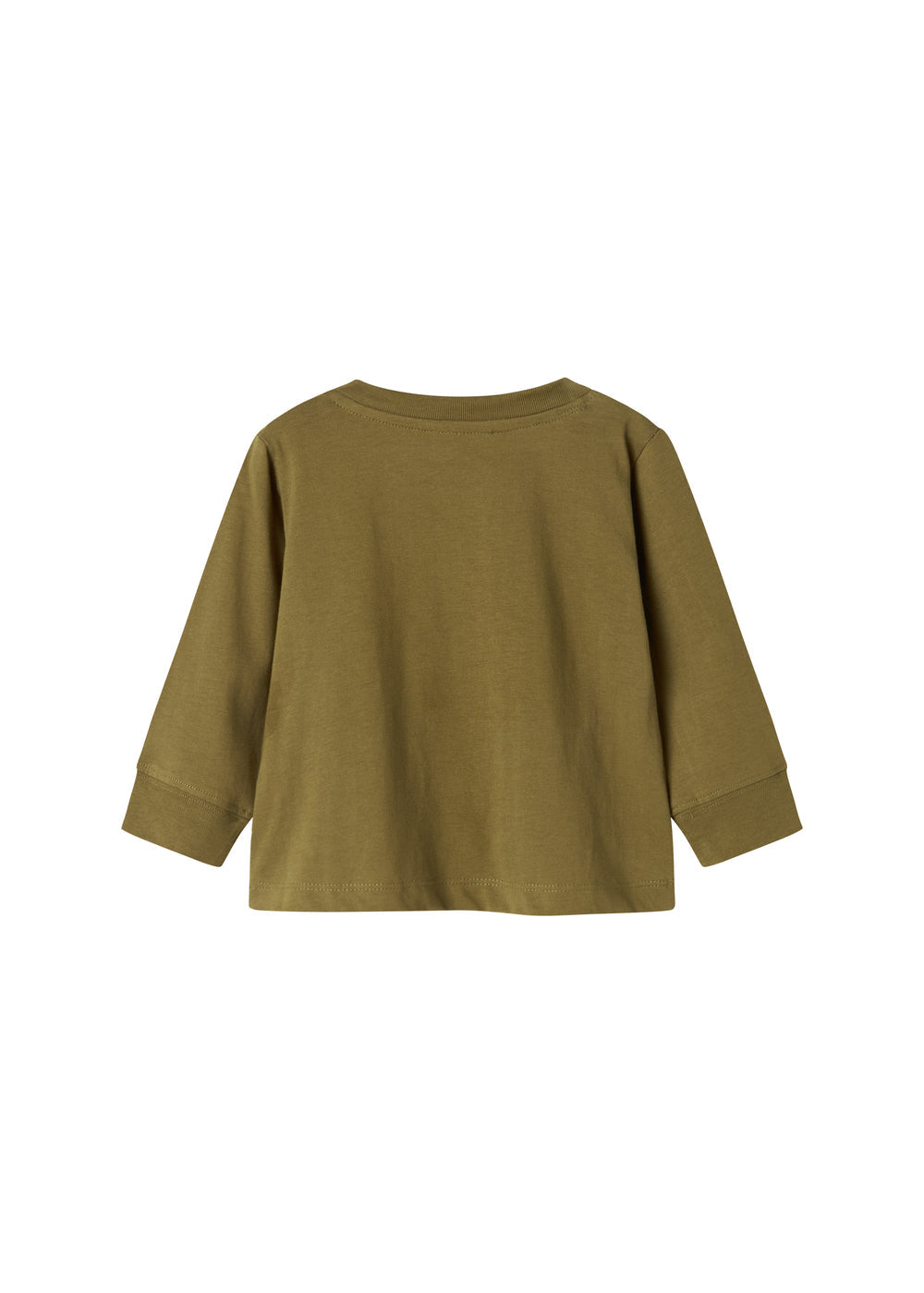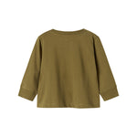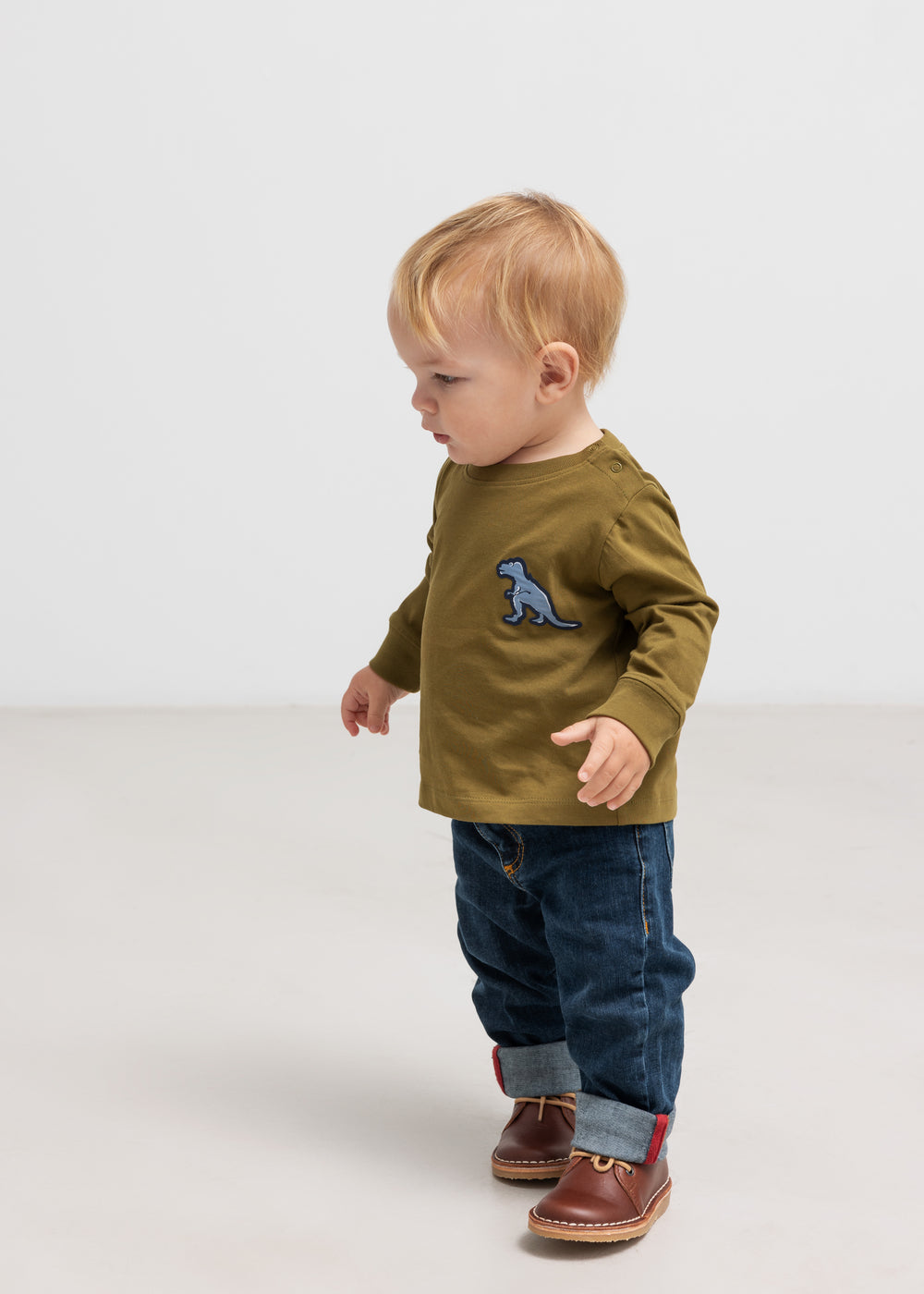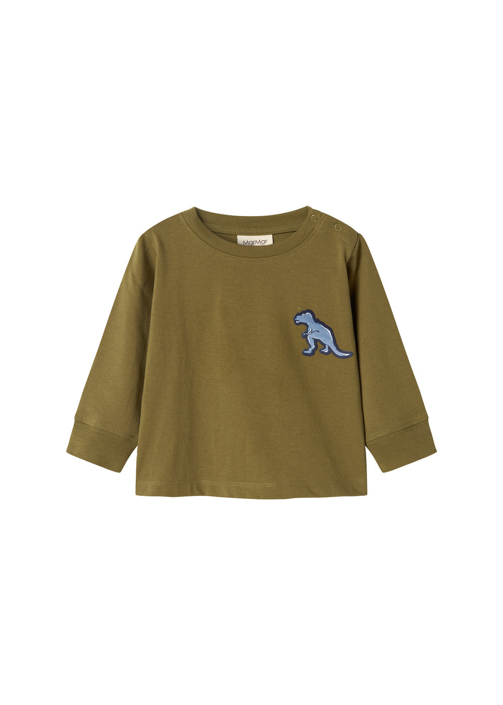 Langærmet t-shirt til baby med tryk knaplukning foran venstre skulder og med sej dinosaur lap på det ene bryst.