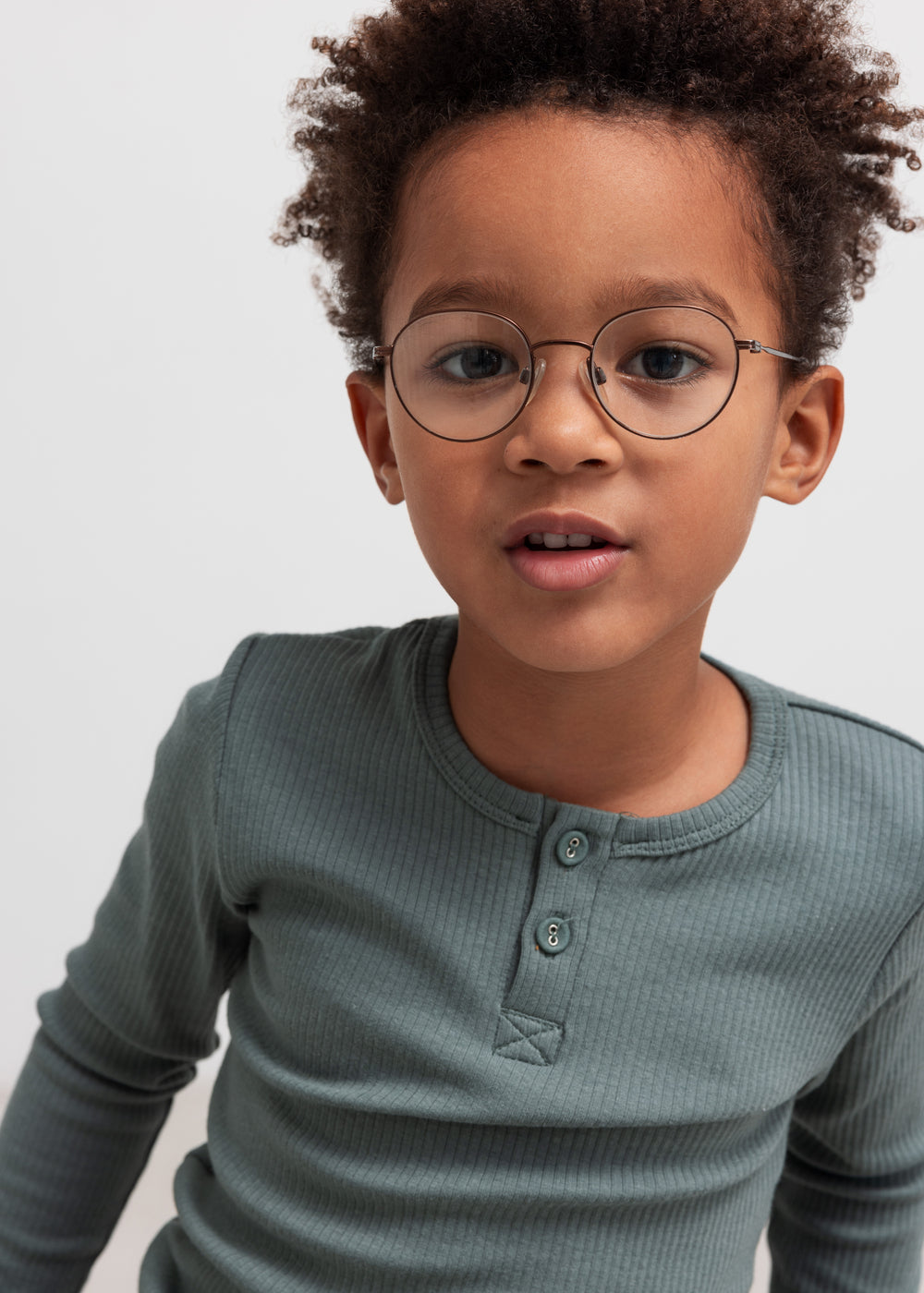 Dreng iført grøn ribbstikket t-shirt med knapper og briller