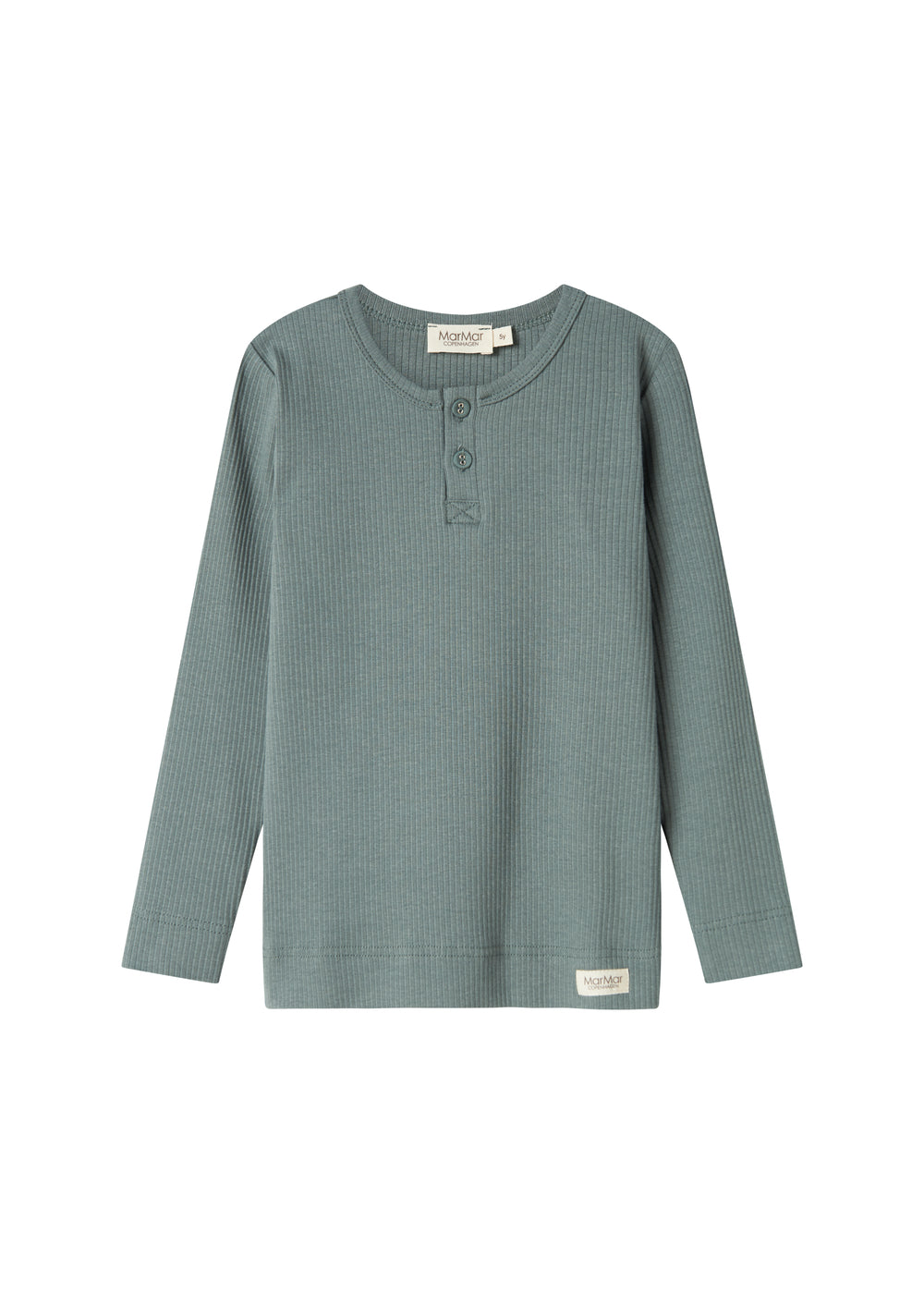 Langærmet t-shirt til børn med stolpe knaplukning. T-shirten er ribstrikket, blød, strækbar og behagelig at have på.