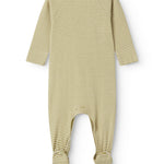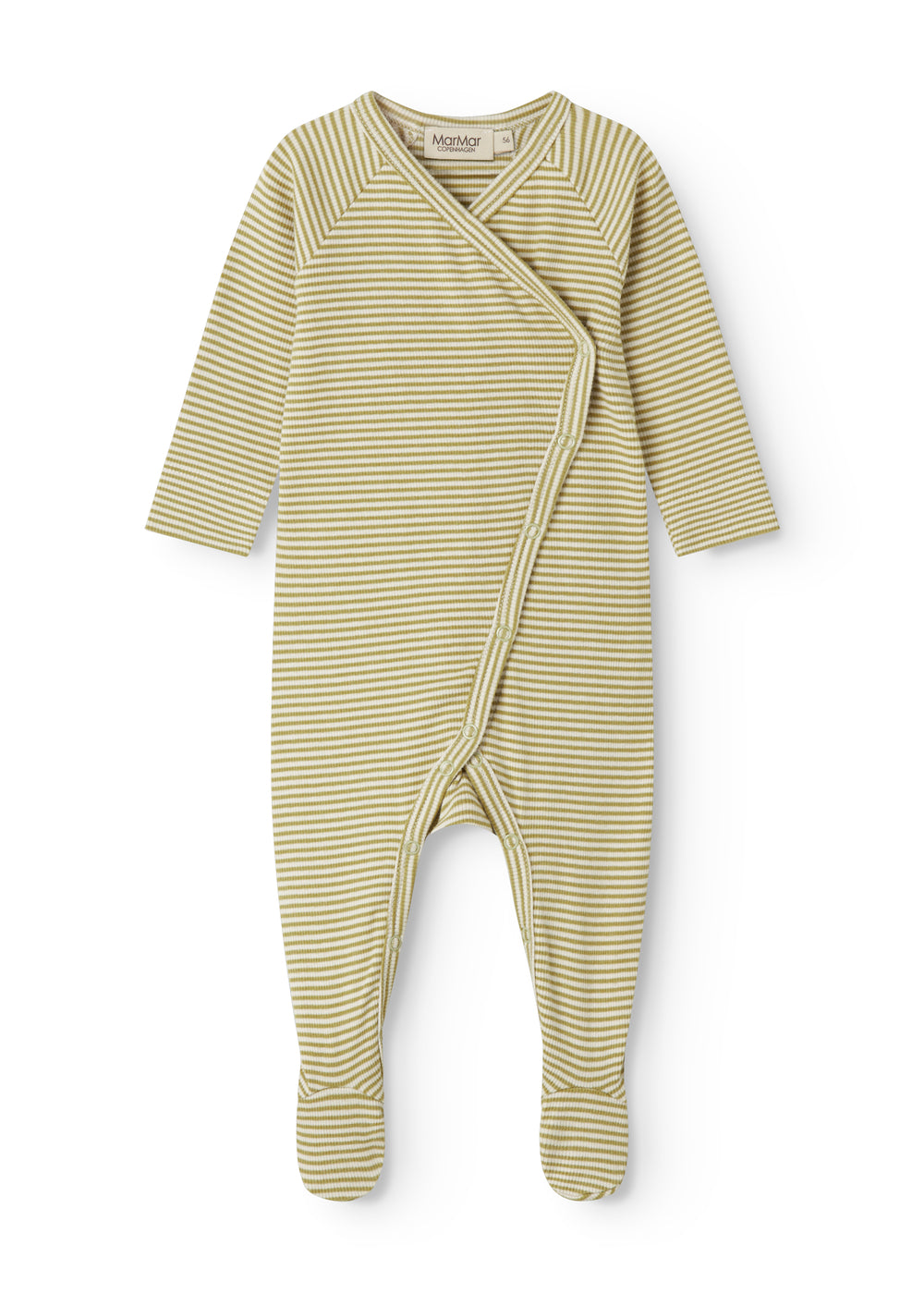 Langærmet heldragt med fødder og fine striber. Heldragten har en praktisk slå-om-lukning, der lukkes med små diskrete trykknapper hele vejen ned samt mellem benene for nem bleskiftning. Heldragten er både blød, strækbar og behagelig at have på.
