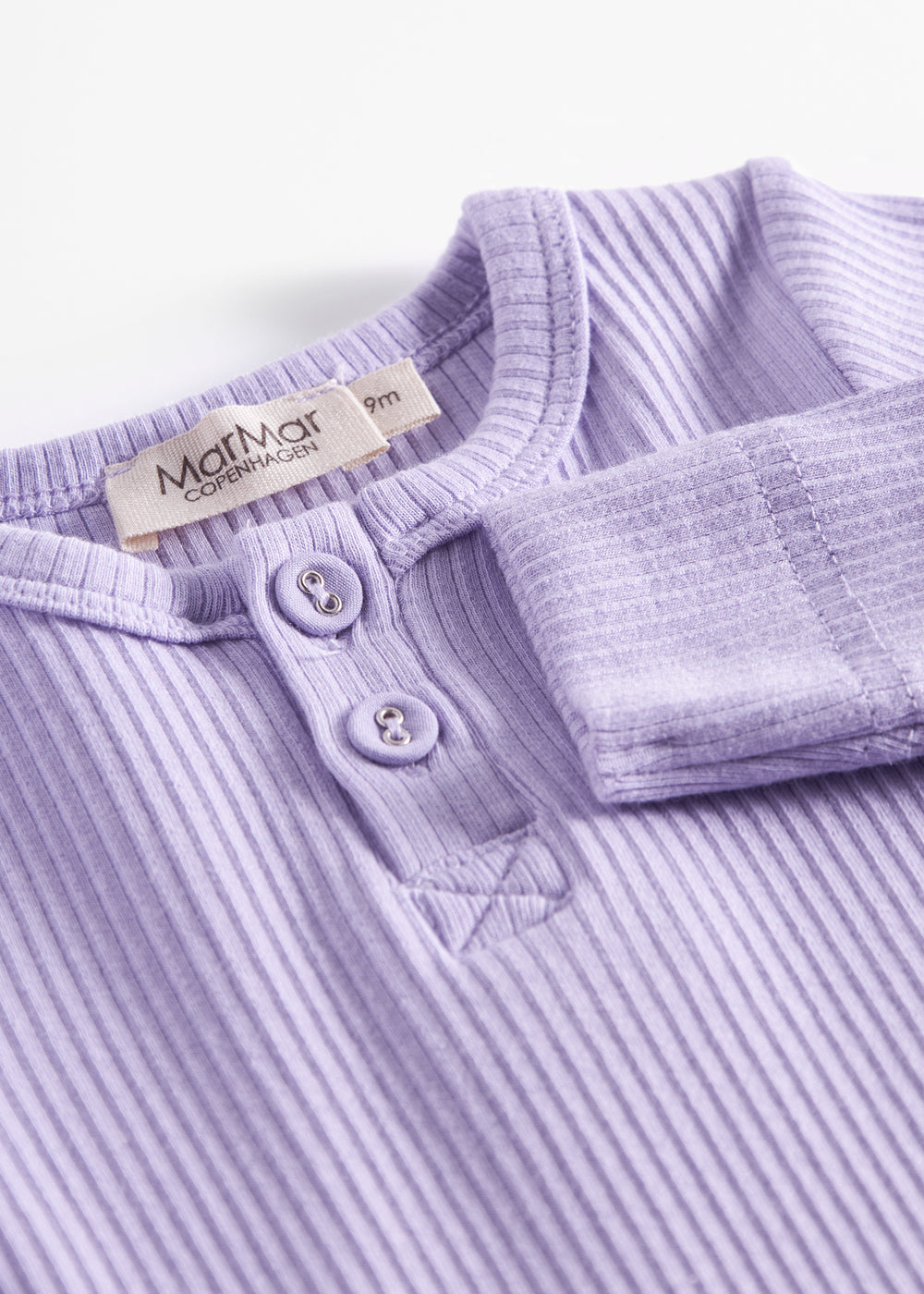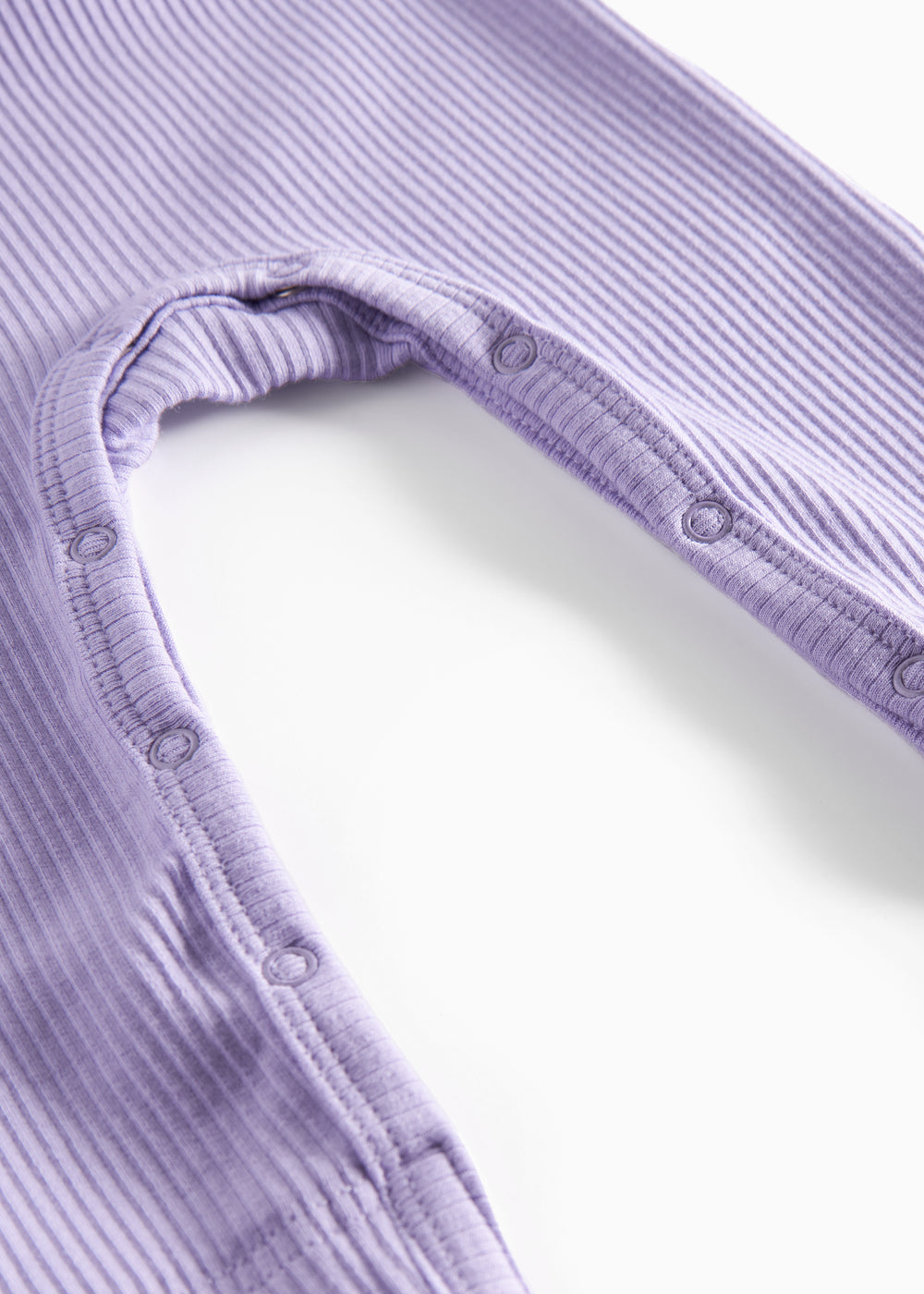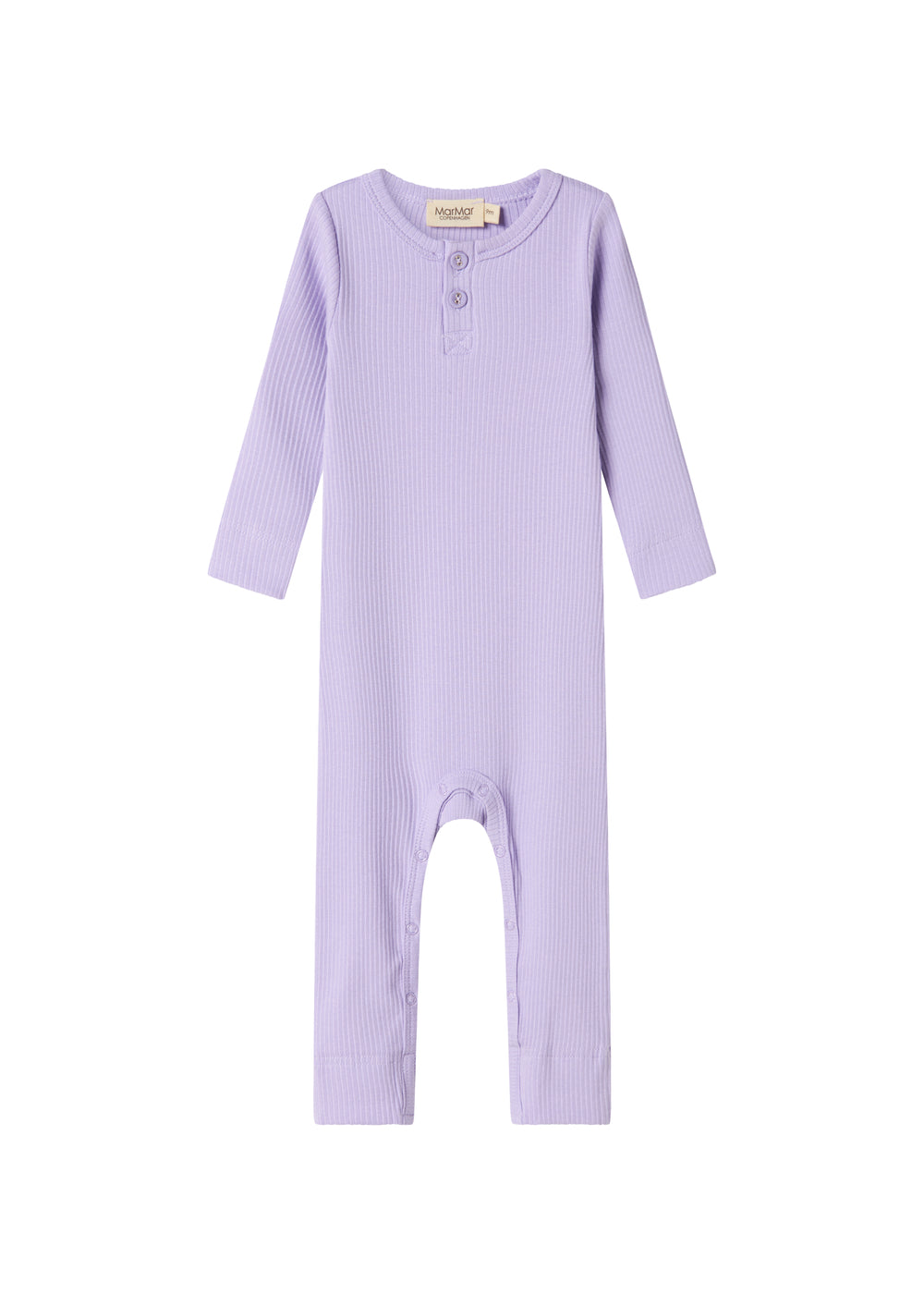 Heldragt til baby med stolpe knaplukning, der bliver lukket med trykknapper mellem benene for nem bleskiftning. Heldragten er ribstrikket, blød, strækbar og behagelig at have på.