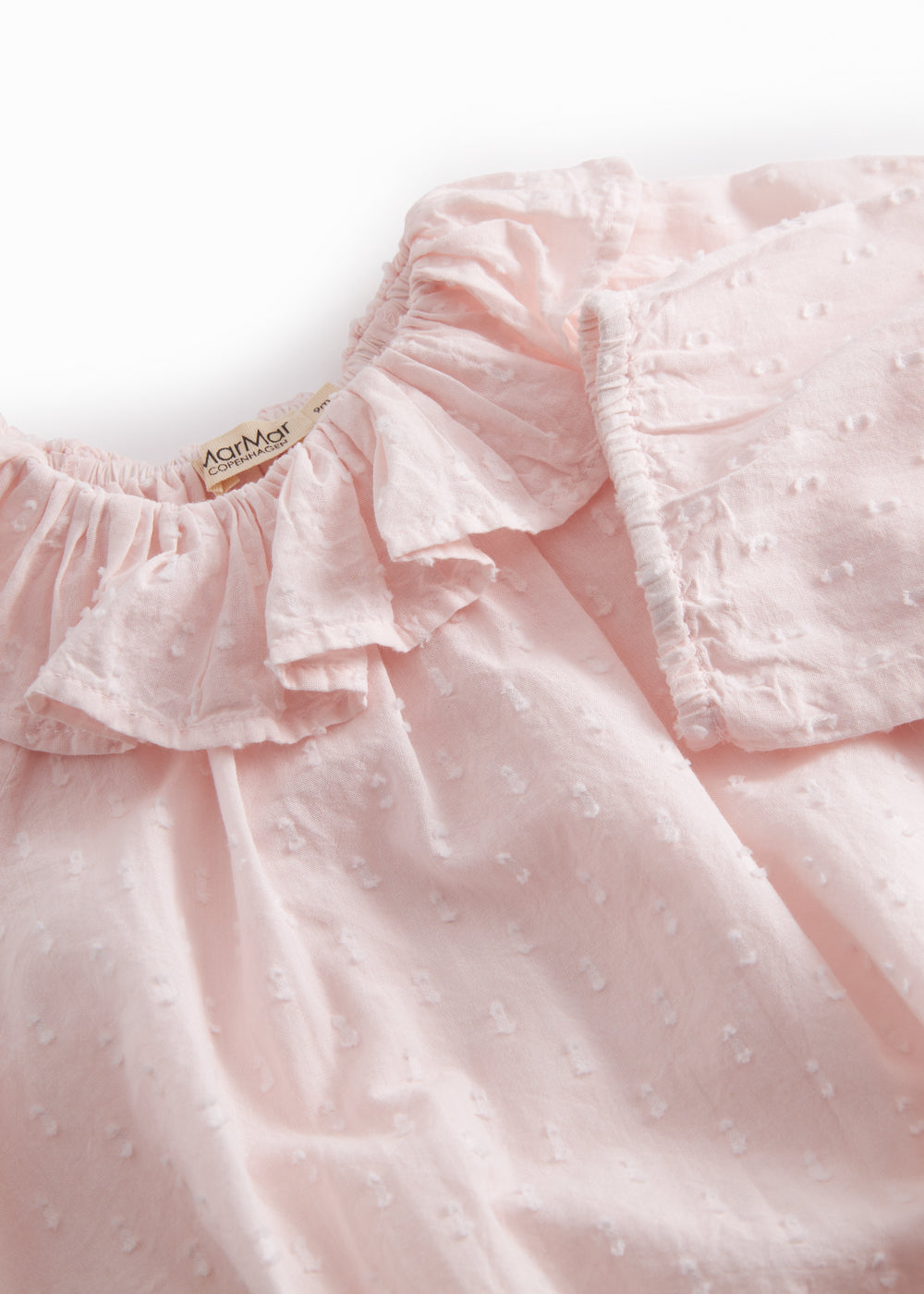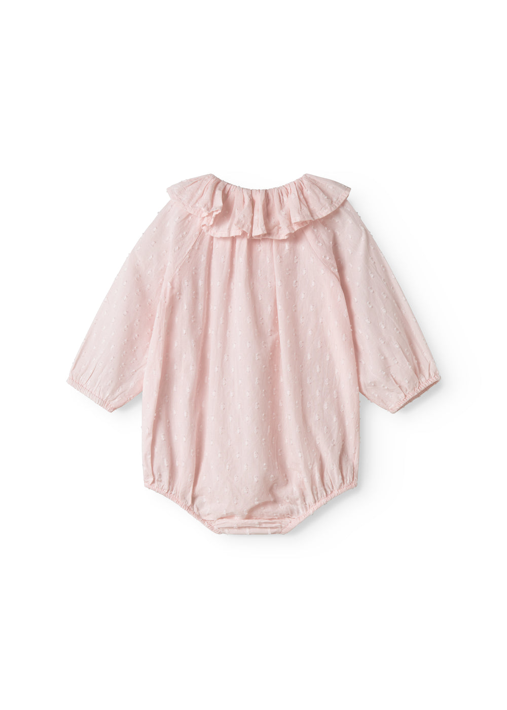 Løstsiddende baby heldragt med dobby detaljer. Heldragten har lange ærmer og flæsekrave. Heldragten bliver lukket mellem benene for nem bleskiftning.