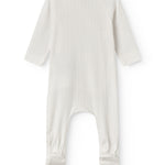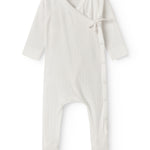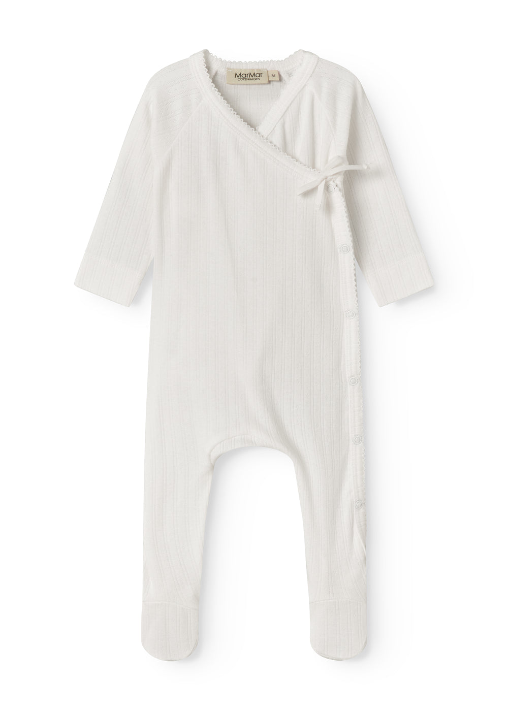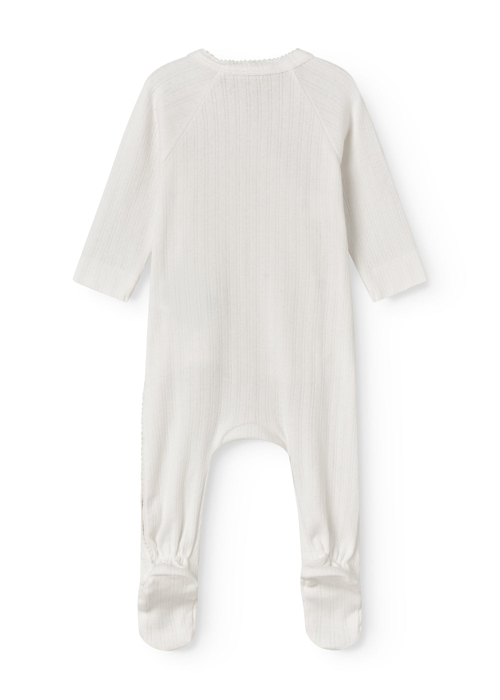 Langærmet pointelle heldragt med fødder til nyfødte. Heldragten har slå-om-lukning, picotkanter og lukkes med trykknapper og bindebånd fra halsen og ned langs det ene ben. Heldragten er blød, strækbar og behagelig at have på.