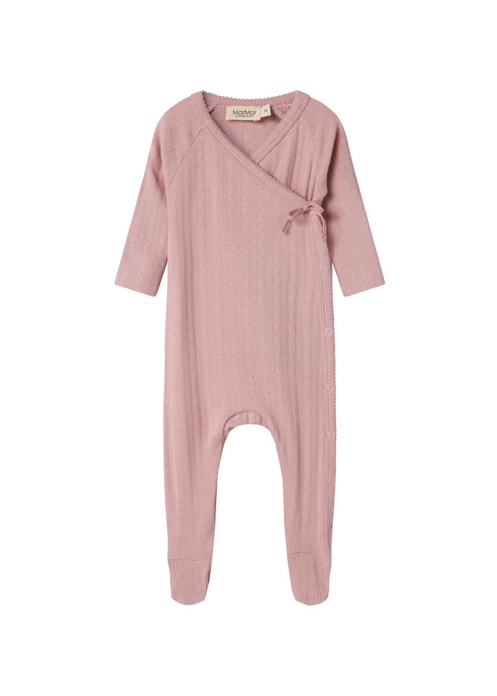 Langærmet pointelle heldragt med fødder til nyfødte. Heldragten har slå-om-lukning, picotkanter og lukkes med trykknapper og bindebånd fra halsen og ned langs det ene ben. Heldragten er blød, strækbar og behagelig at have på.