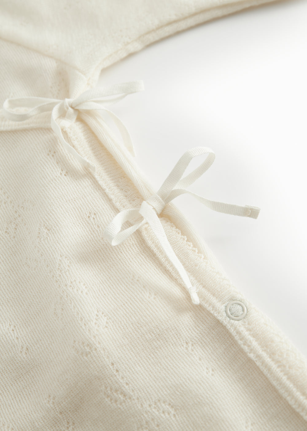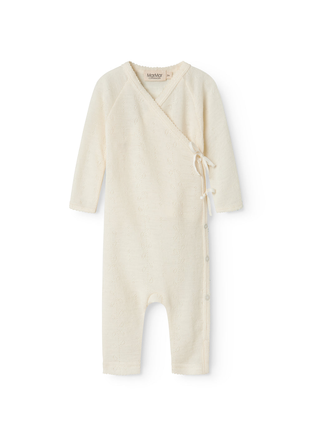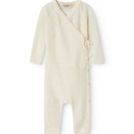 Langærmet heldragt til nyfødte. Heldragten har slå-om-lukning. Lukkes med trykknapper og bindebånd