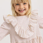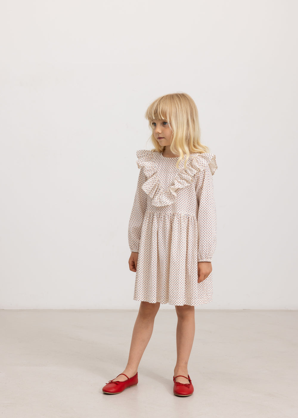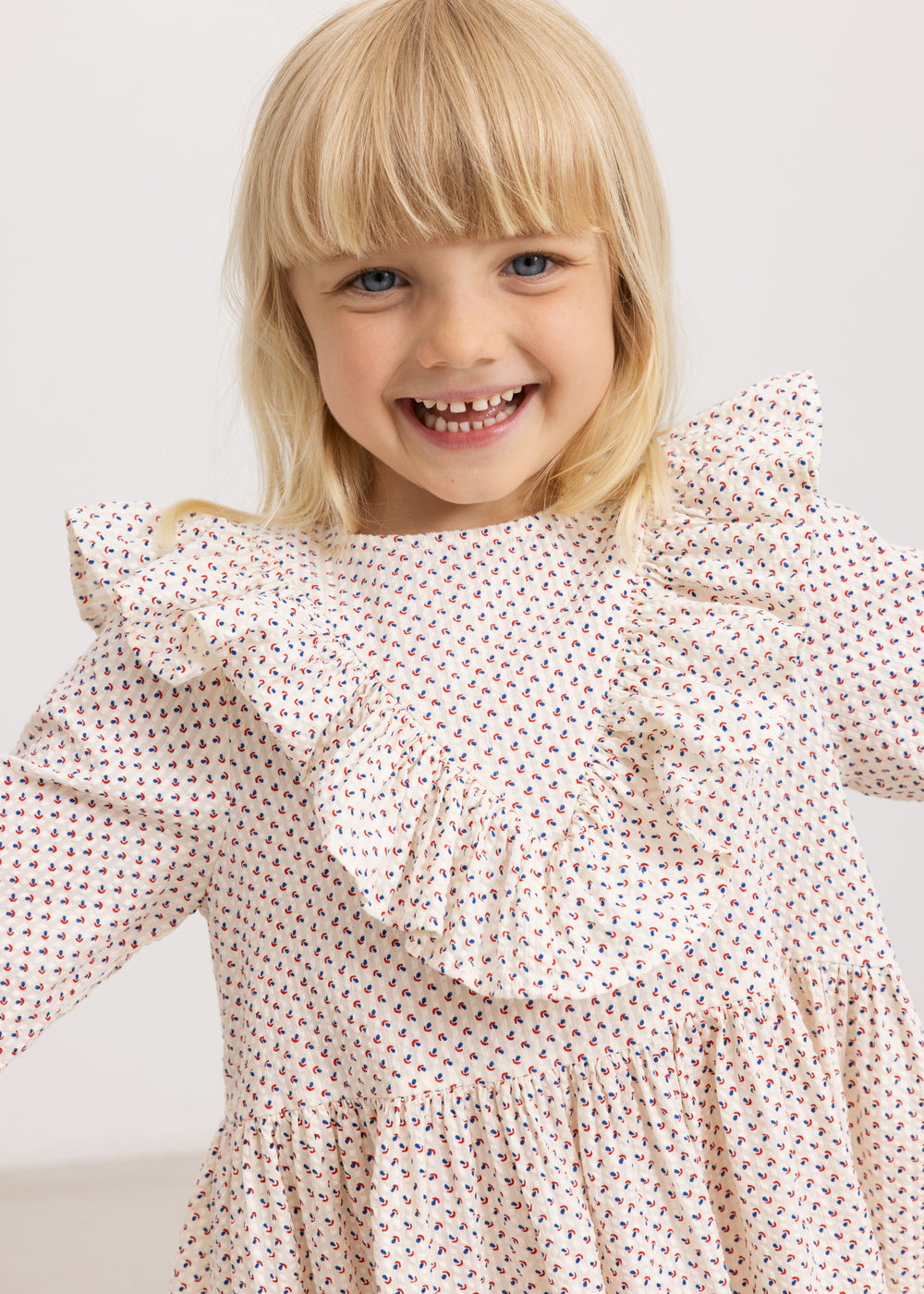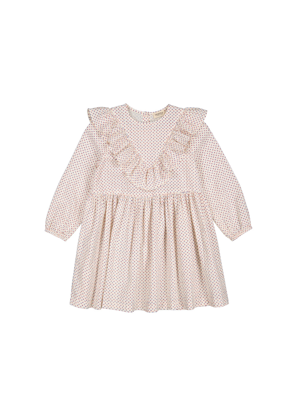 Behagelig langærmet bæk og bølge kjole med god pasform og sød flæse krave. Kjolen har knaplukning på ryggen og længden går til over knæene