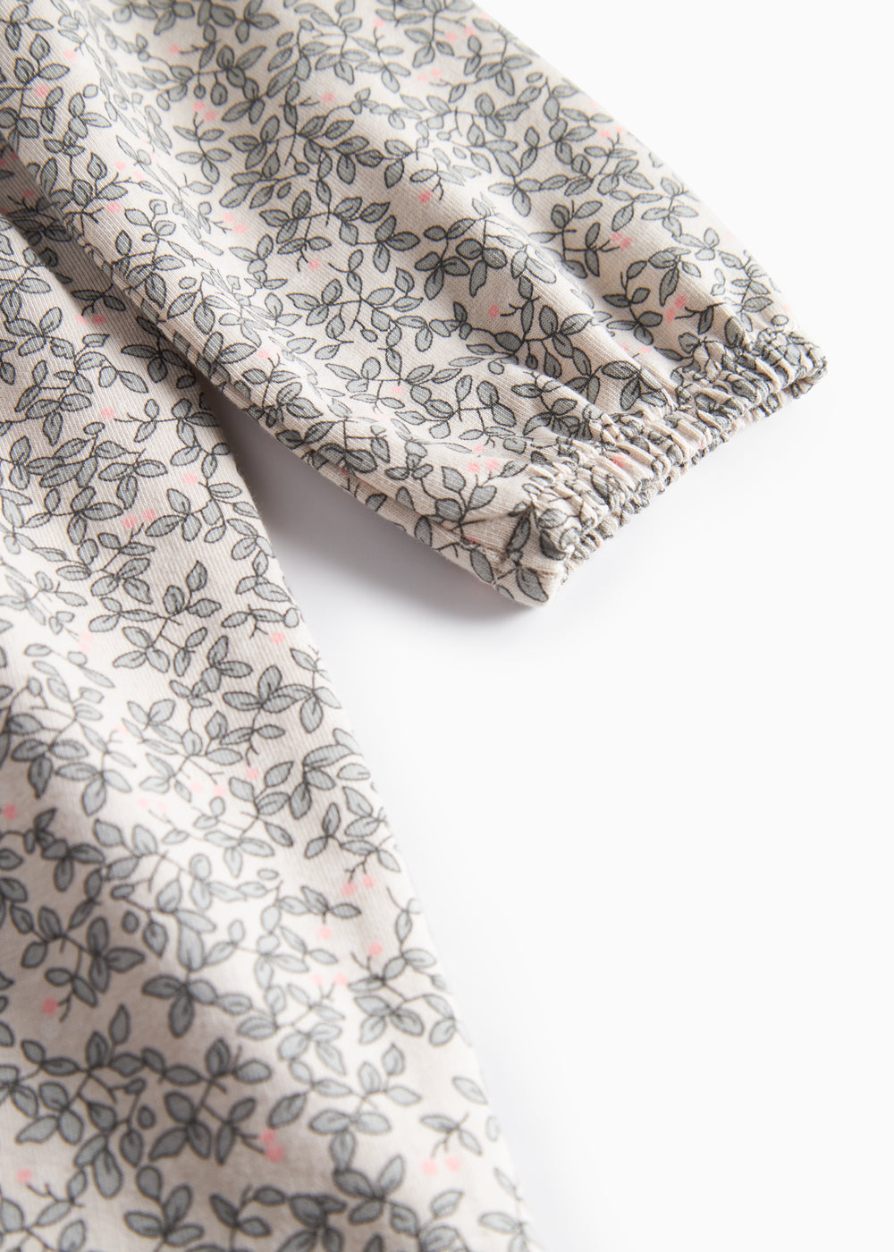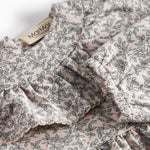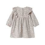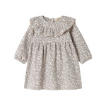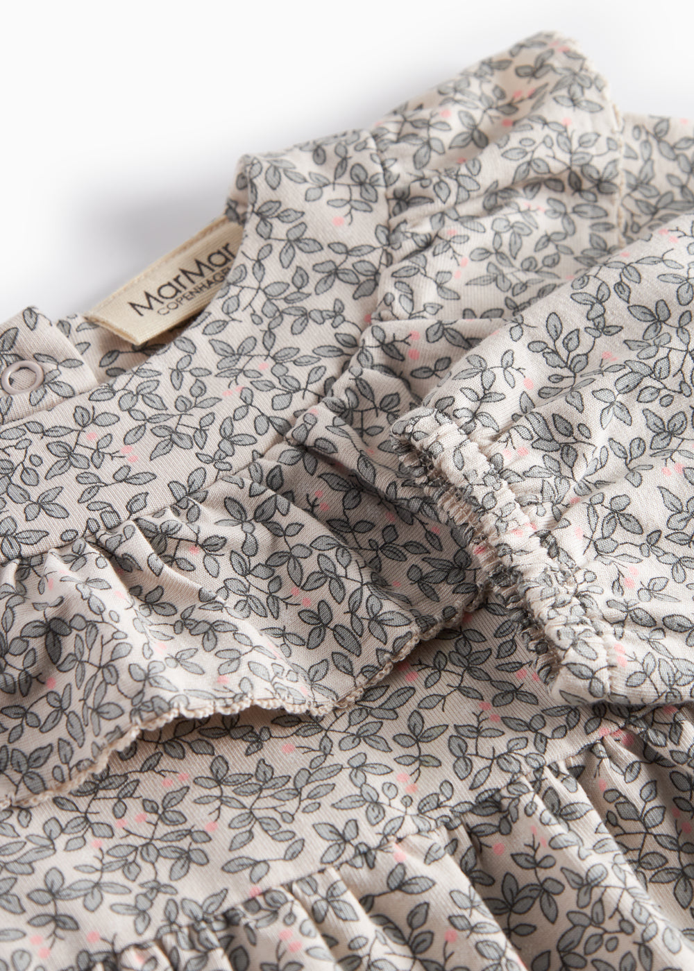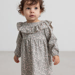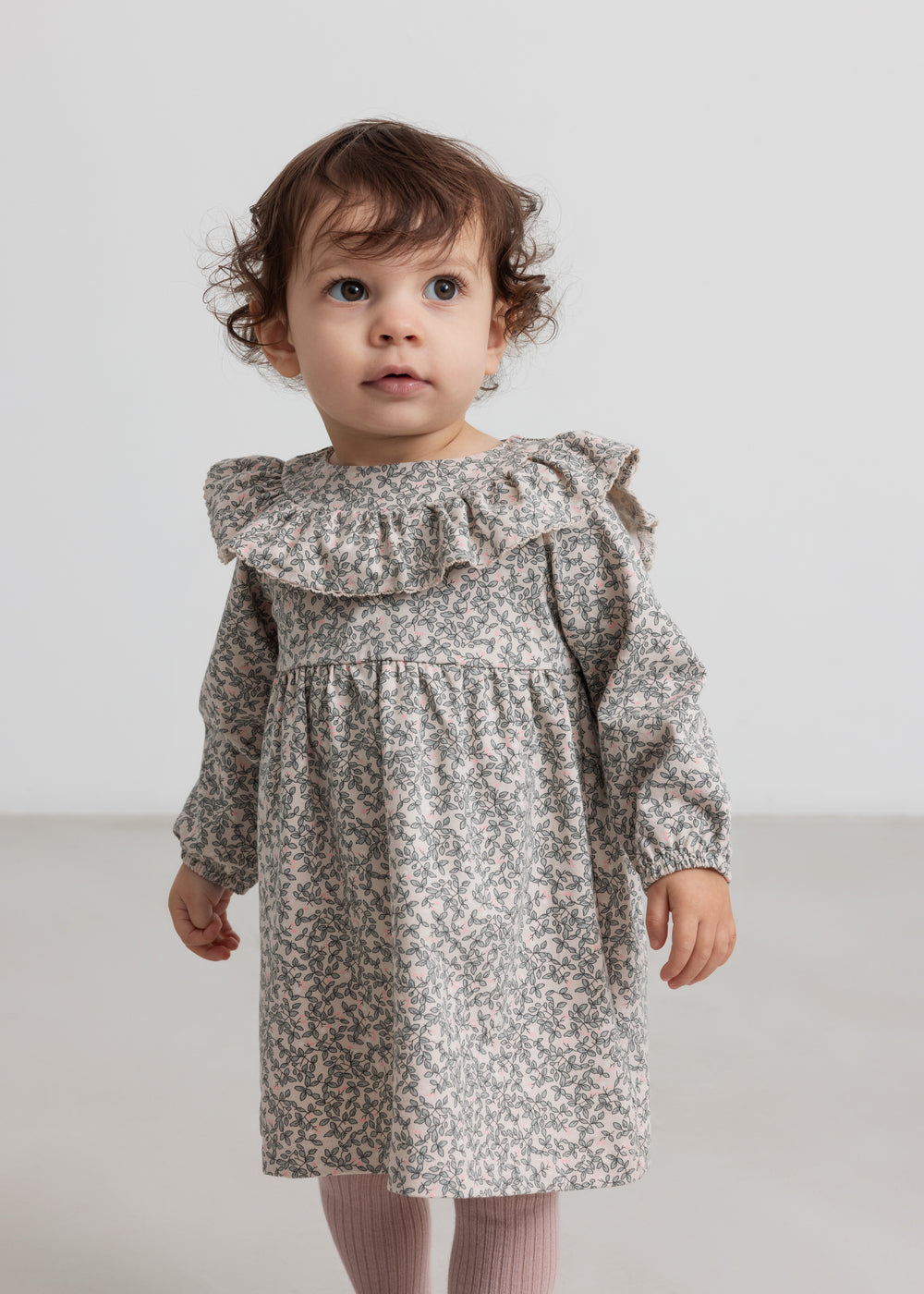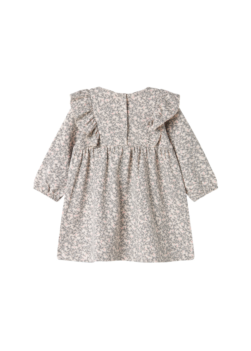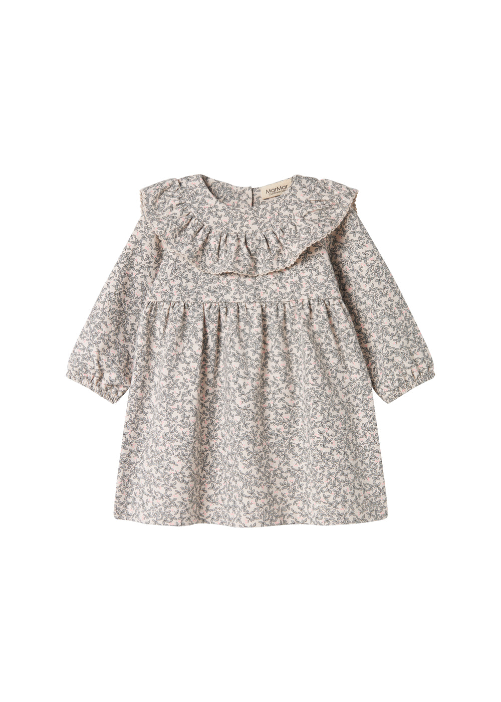 Langærmet baby kjole i en løs pasform med et flot kirsebærmønster og en fin krave med picotkanter. Kjolen har peplum, elastik i ærme og lukkes med knaplukning på ryggen. Kjolens længde går til over knæet. Kjolen er både blød, strækbar og behagelig at have på.