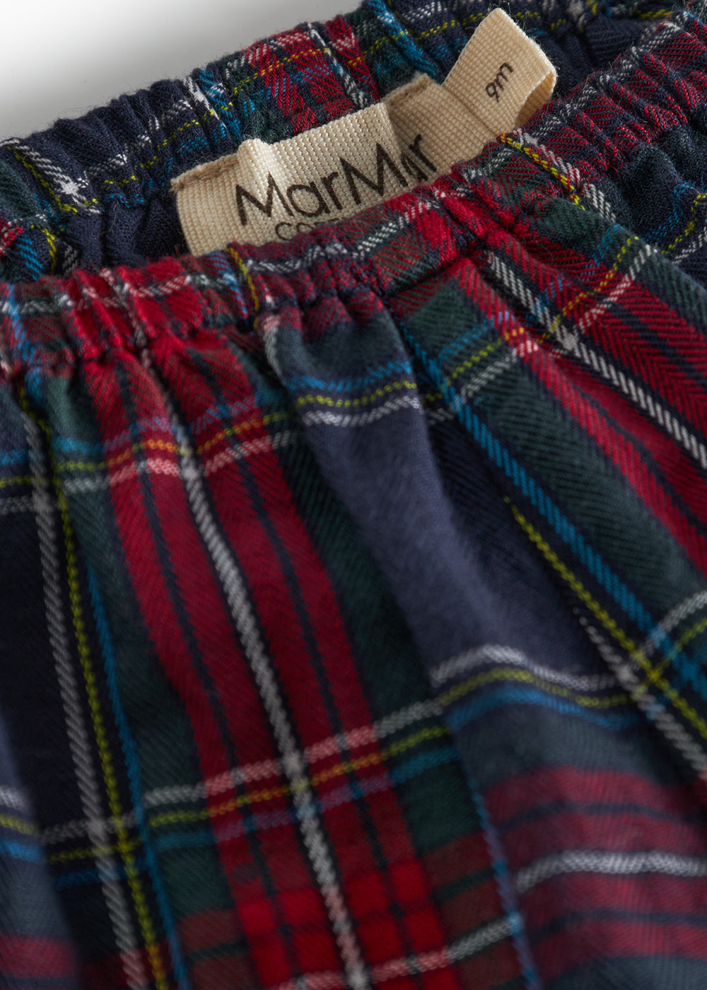Mørkeblå og rød ternede bloomers med elastisk talje og benåbninger til baby