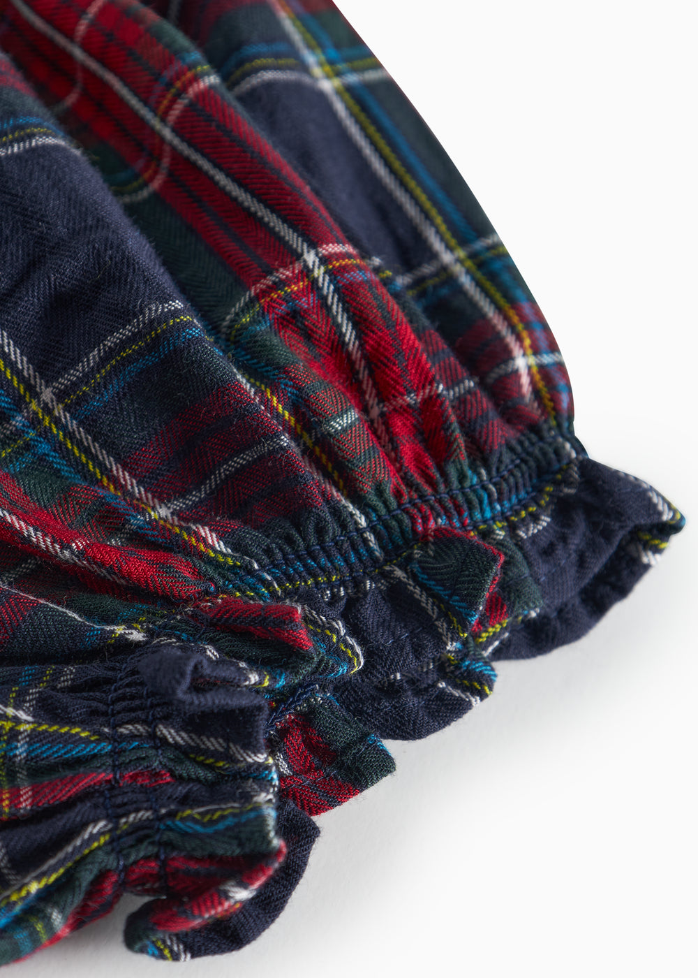 Baby iført mørkeblå og rød ternede bloomers og matchende juleskjorte