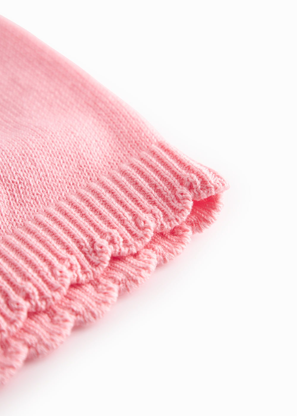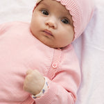 Enkel strik babyhue med bølgede kanter. Strikhuen er glatstrikket og er behagelig og let at have på.