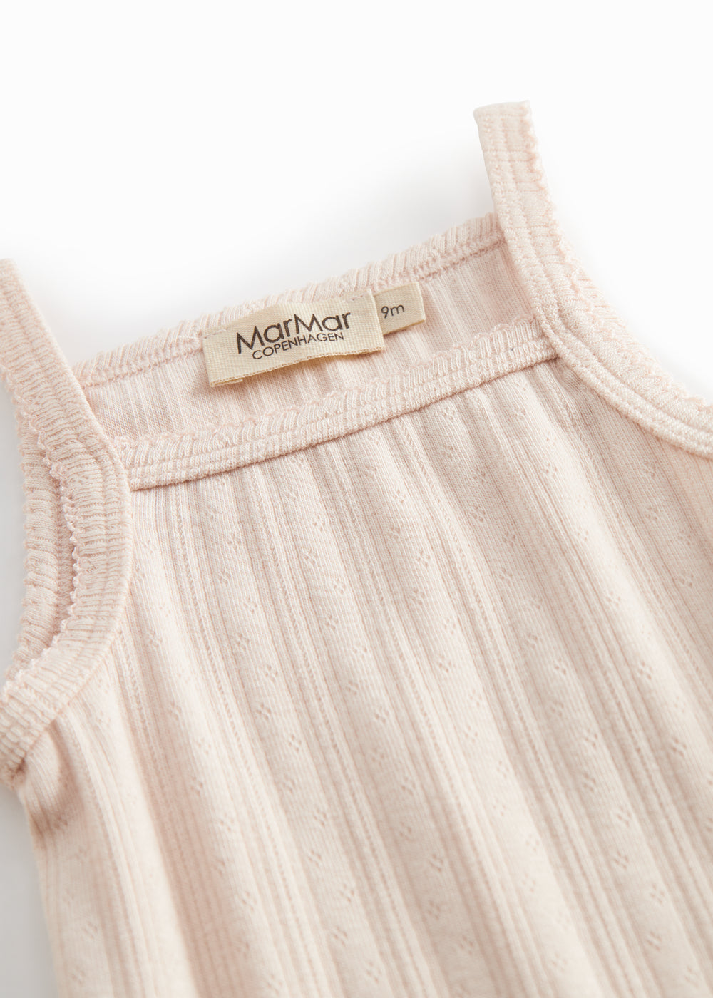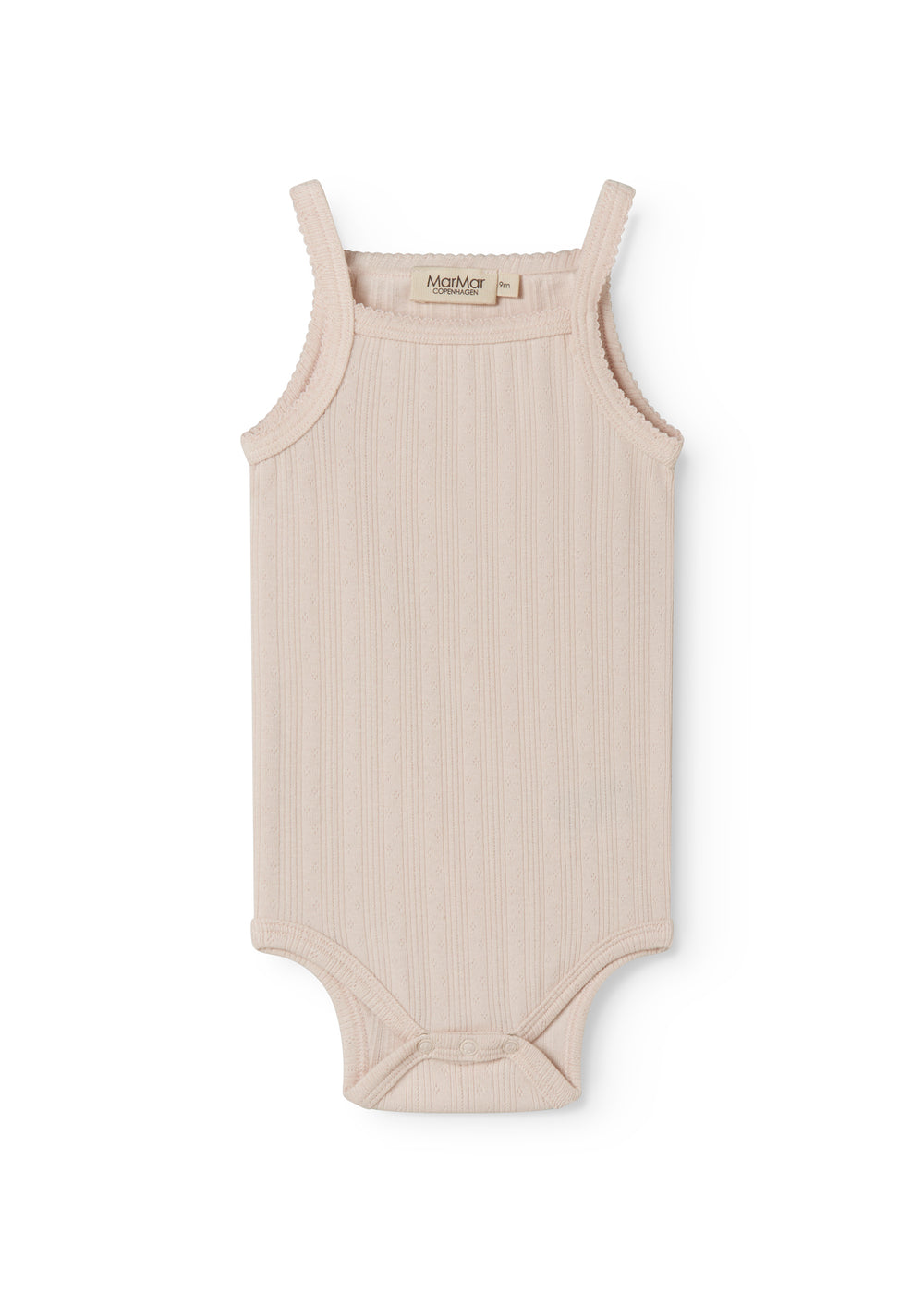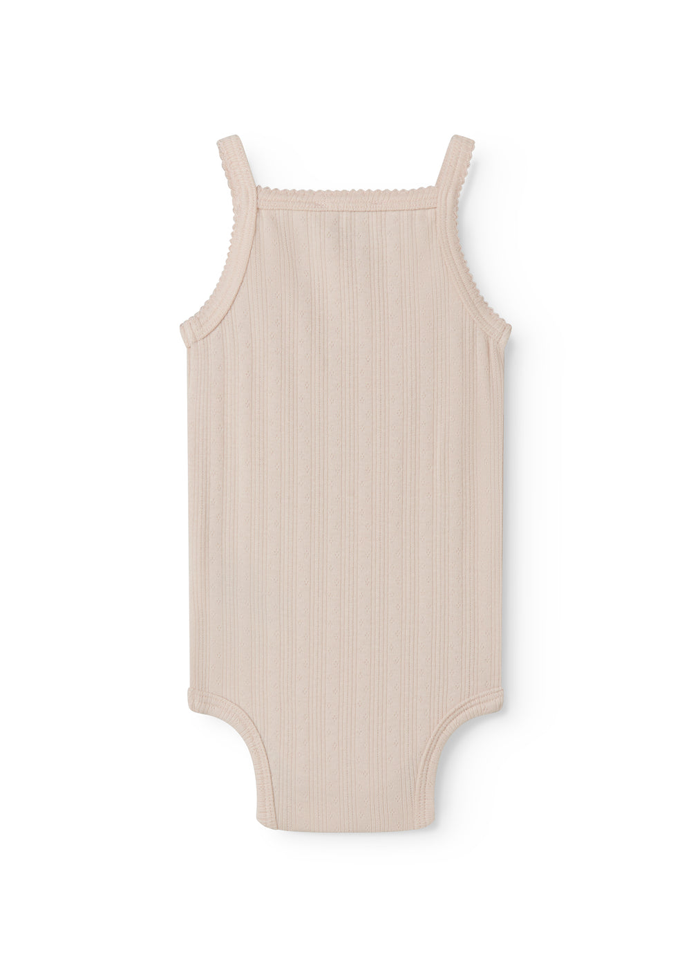 Bodystocking uden ærmer med stropper og pointelle detaljer, der bliver lukket med trykknapper mellem benene for nem bleskiftning. Bodystockingen har picotkanter og er blød, strækbar og behagelig at have på.