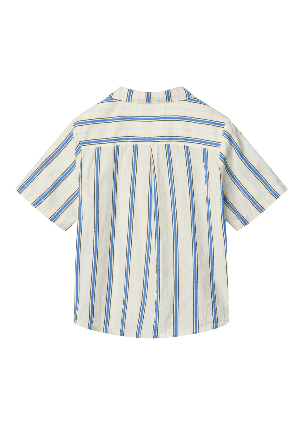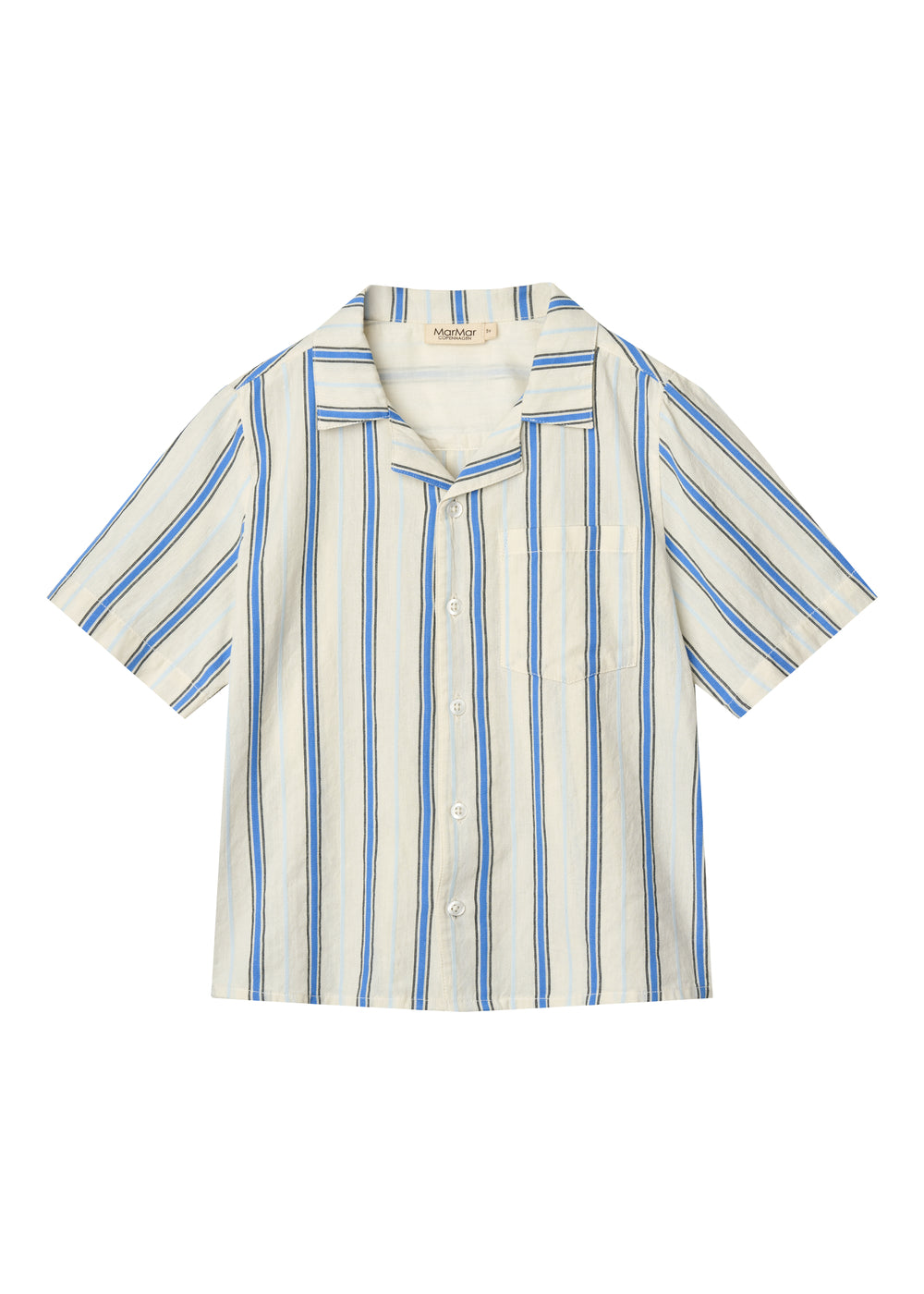 Kortærmet skjorte med fine striber, krave, knaplukning og en lille lomme foran. Skjorten er i en let og blød bomulds kvalitet