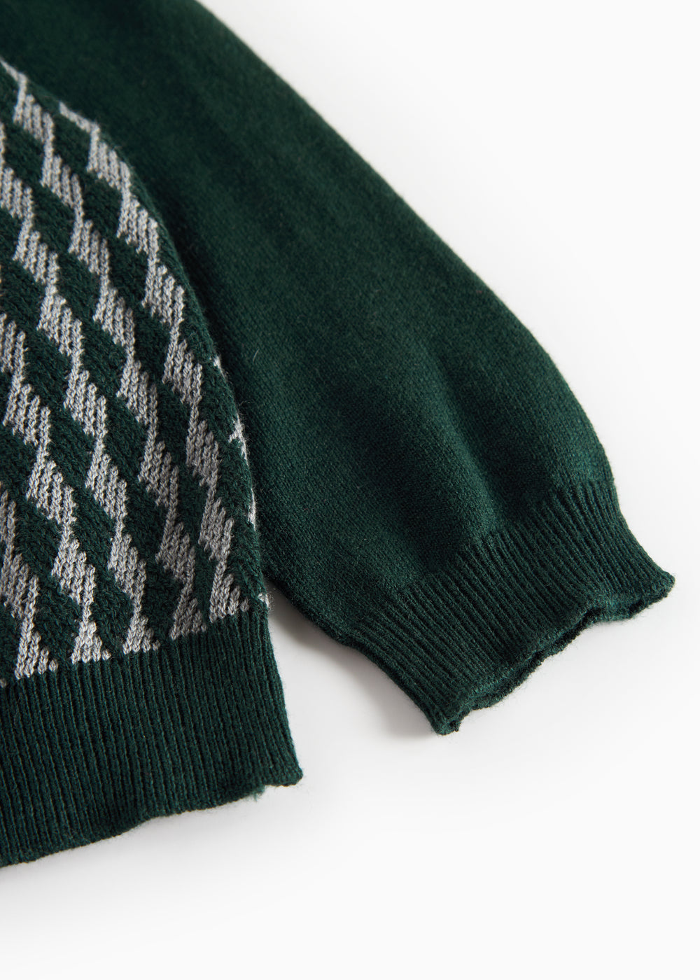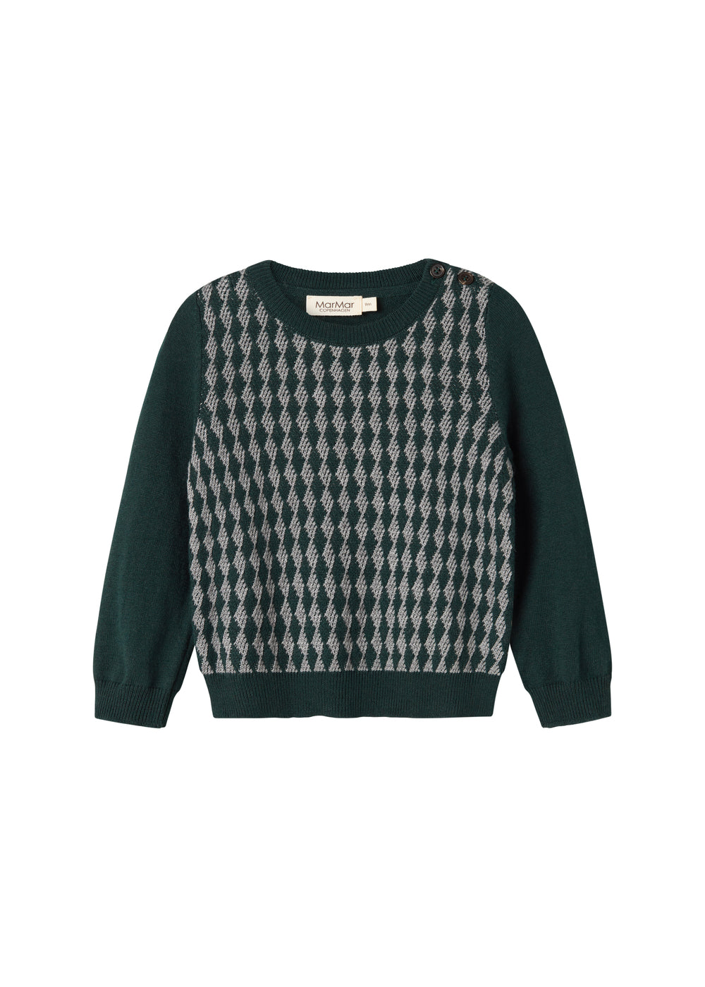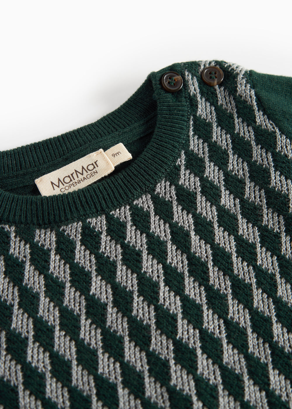 Langærmet striktrøje til baby med knaplukning på venstre skulder. Striktrøjen har et fint harlekin mønster og ribkanter ved ærmer og forneden som sikrer en god pasform. Trøjen er både blød og behagelig at have på.
