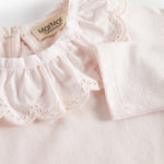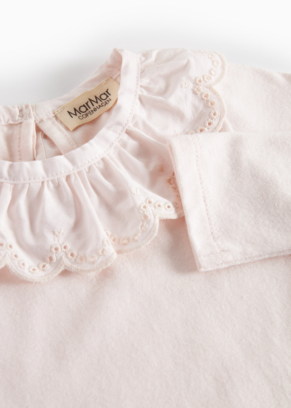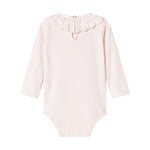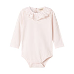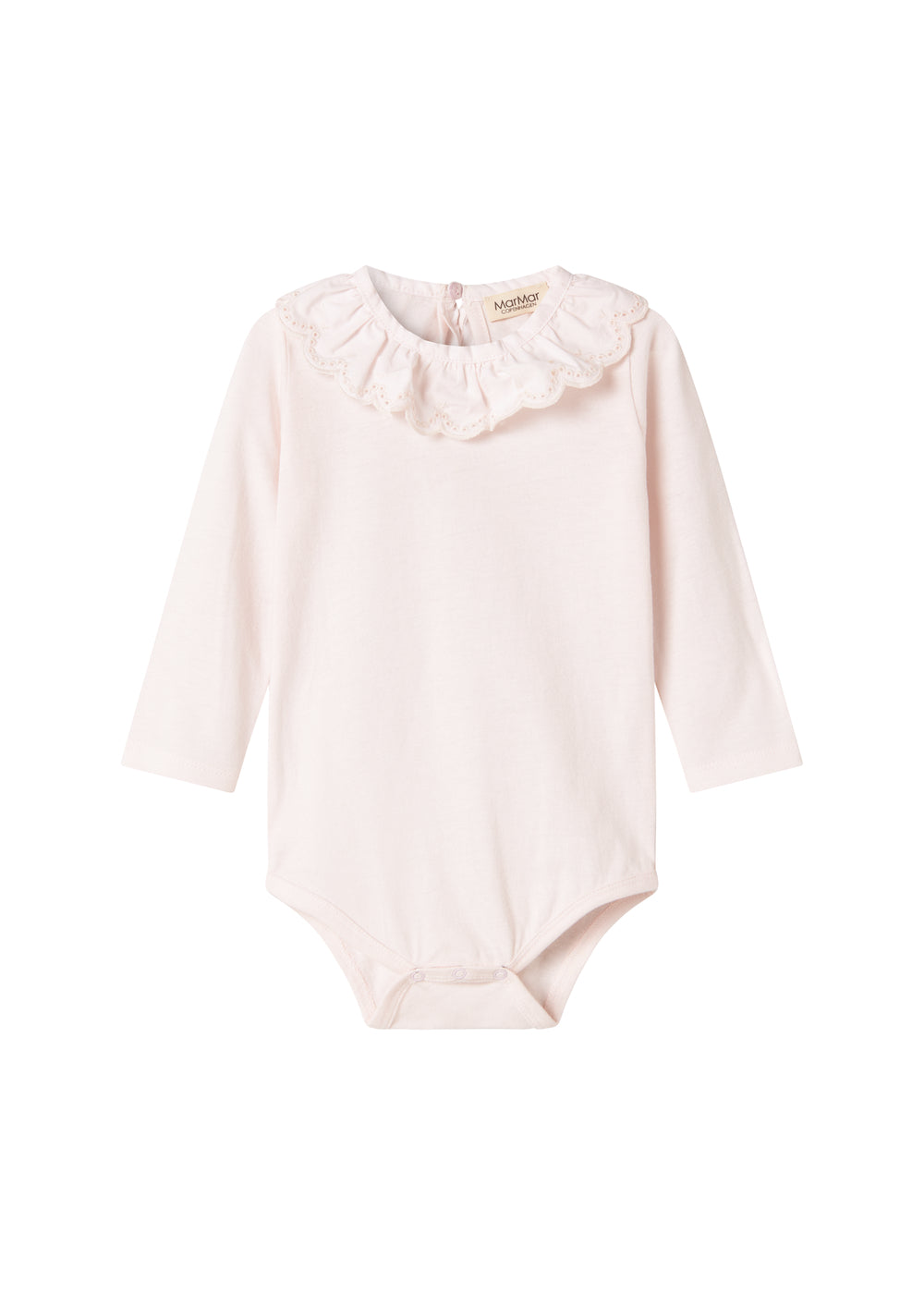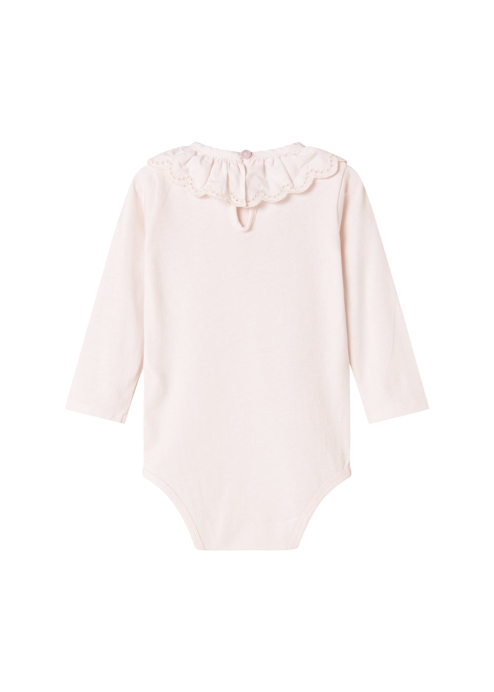 Langærmet bodystocking med rund krave og hulmønster detaljer. Bodystockingen lukkes med knaplukning bagpå. Bodystockingen er både blød, strækbar og behagelig at have på.