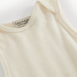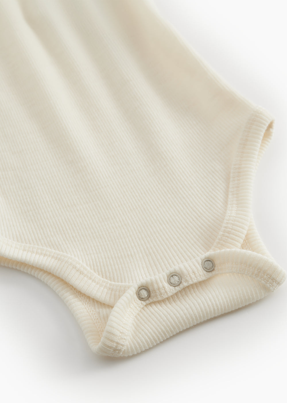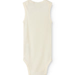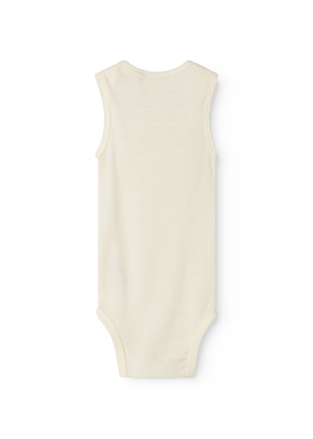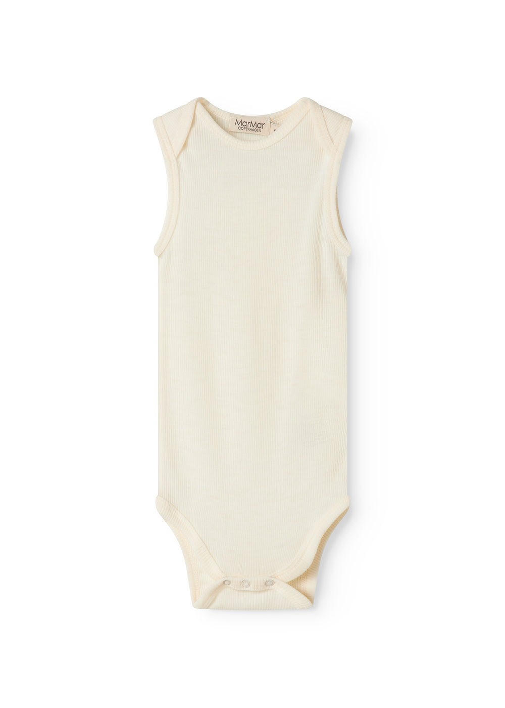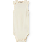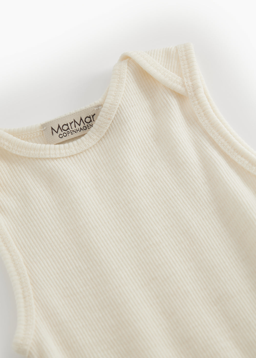 Bodystocking uden ærmer, med smart halsåbning uden knapper som let kan trækkes nedover kroppen. Lukkes med trykknapper på mellem benene for nem bleskiftning.