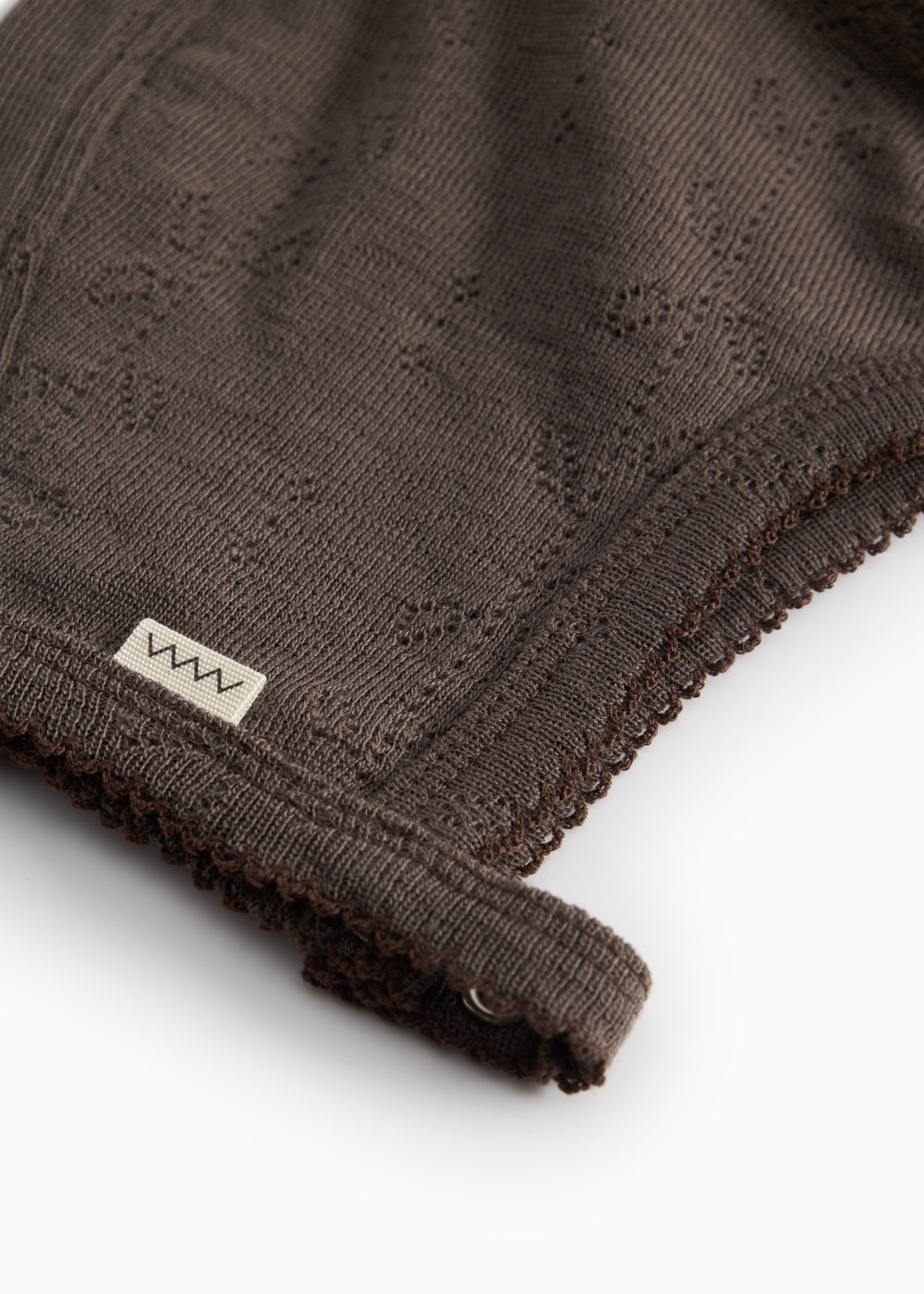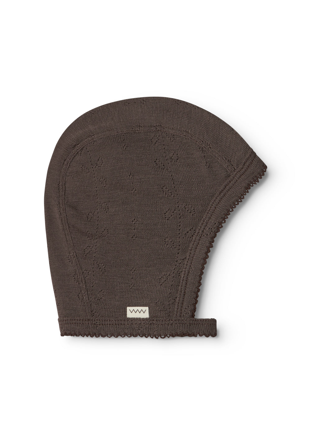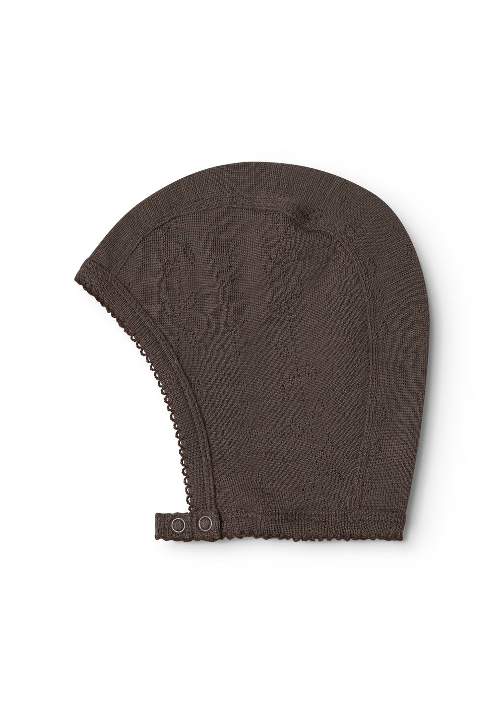 Fin lille hjelm som lukkes med trykknap i 2 længder.