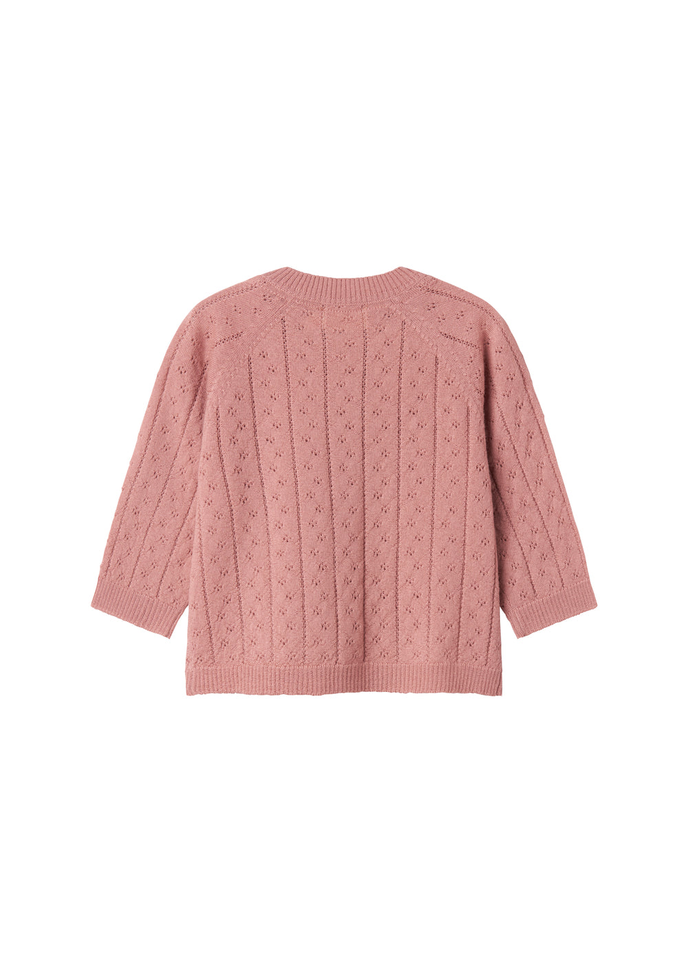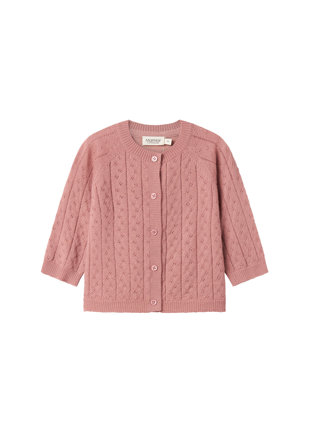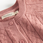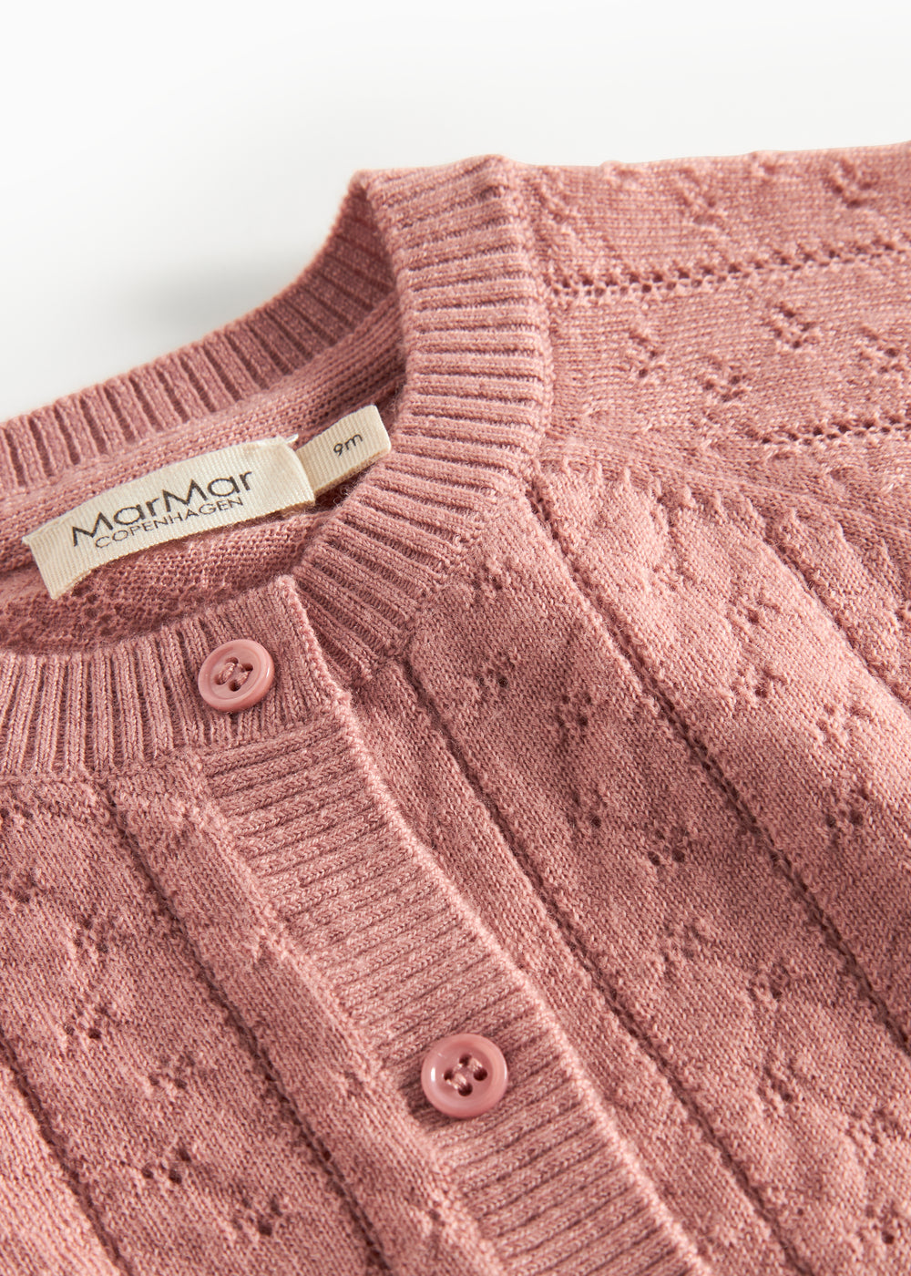 Strik cardigan med knaplukning, pointelle detaljer og rib detaljer ved hals, ærmer og bund for et behageligt fit. Cardiganen er i merinould og er både varm, blød og behagelig at have på.