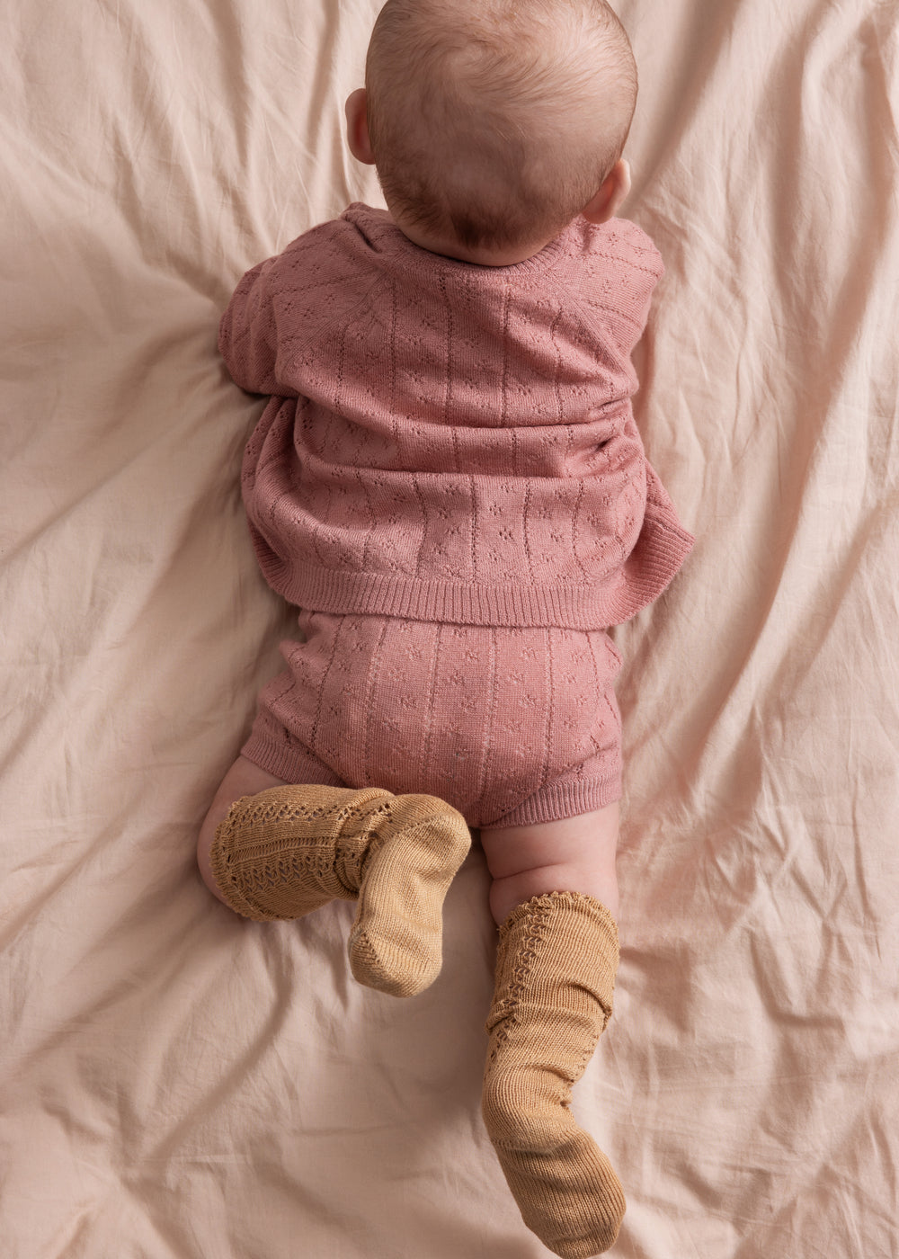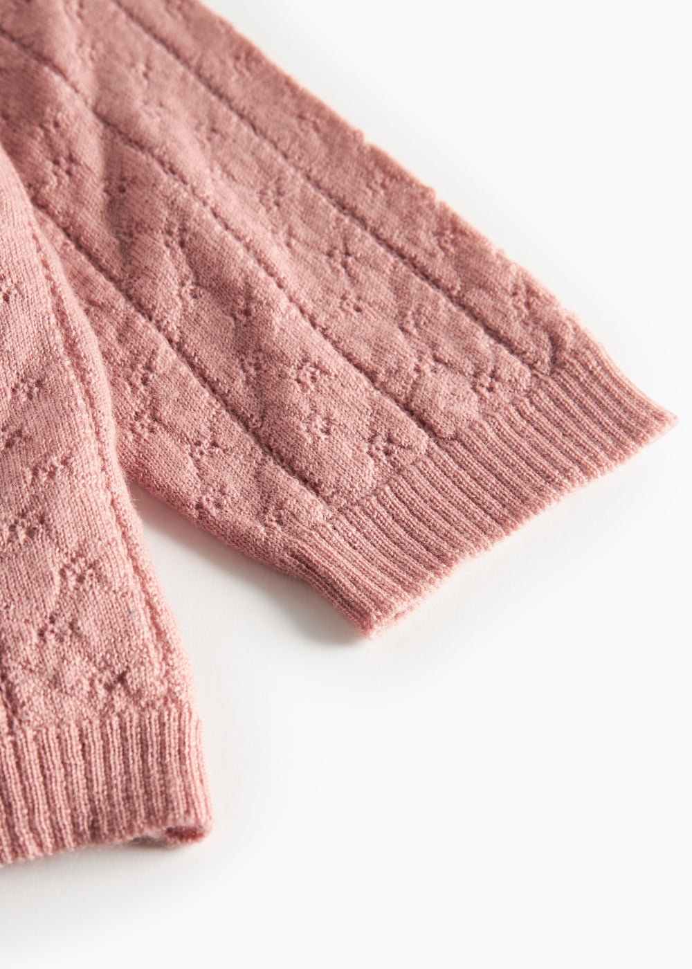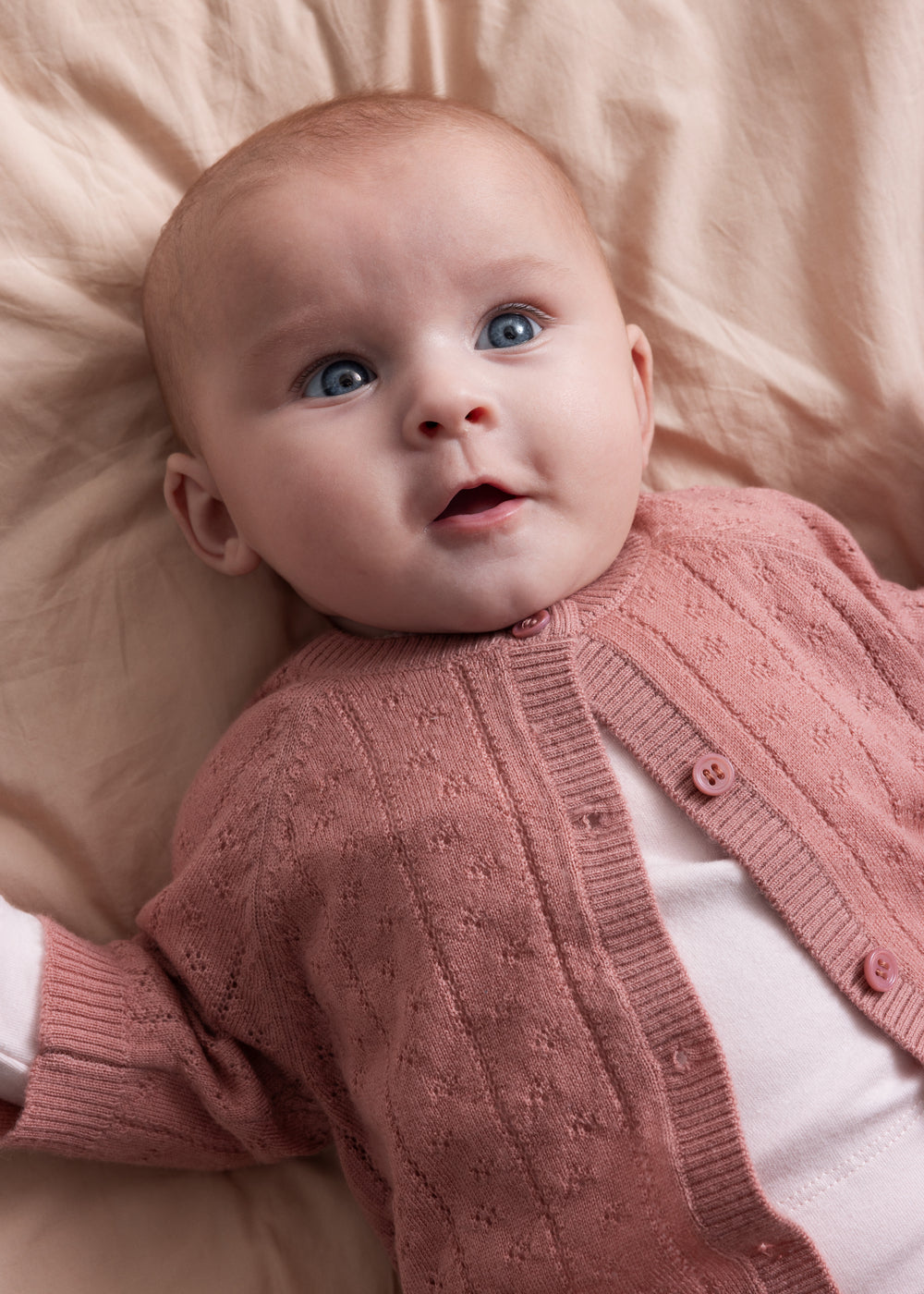 Strik cardigan med knaplukning, pointelle detaljer og rib detaljer ved hals, ærmer og bund for et behageligt fit. Cardiganen er i merinould og er både varm, blød og behagelig at have på.