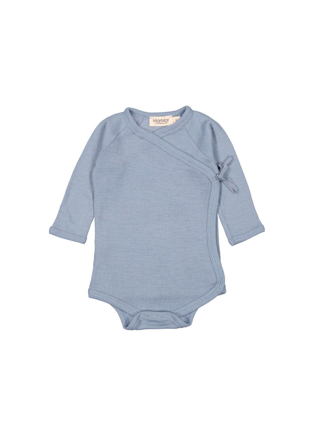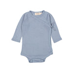 Langærmet bodystocking til nyfødte med slå-om-lukning. Lukkes med trykknapper og bindebånd