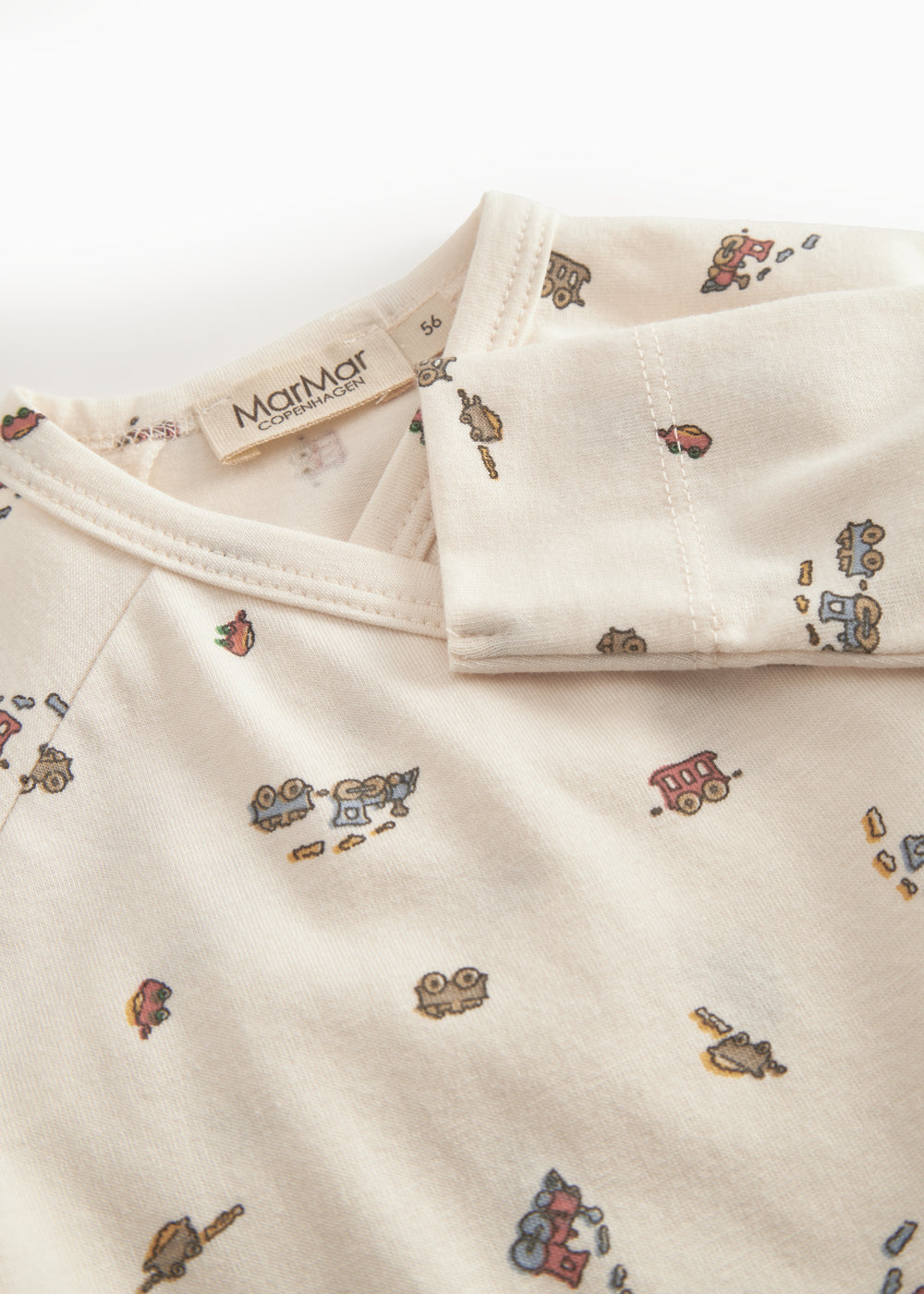 Langærmet bodystocking til nyfødt baby med slå-om-lukning og tog motif