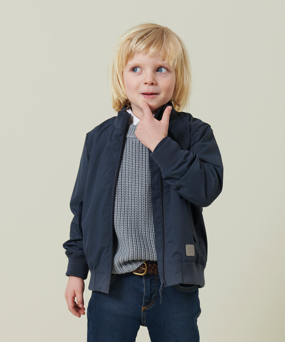 Dreng iført mørkegrøn strikket bluse med ternet mønster og brune bukser til børn