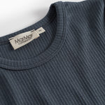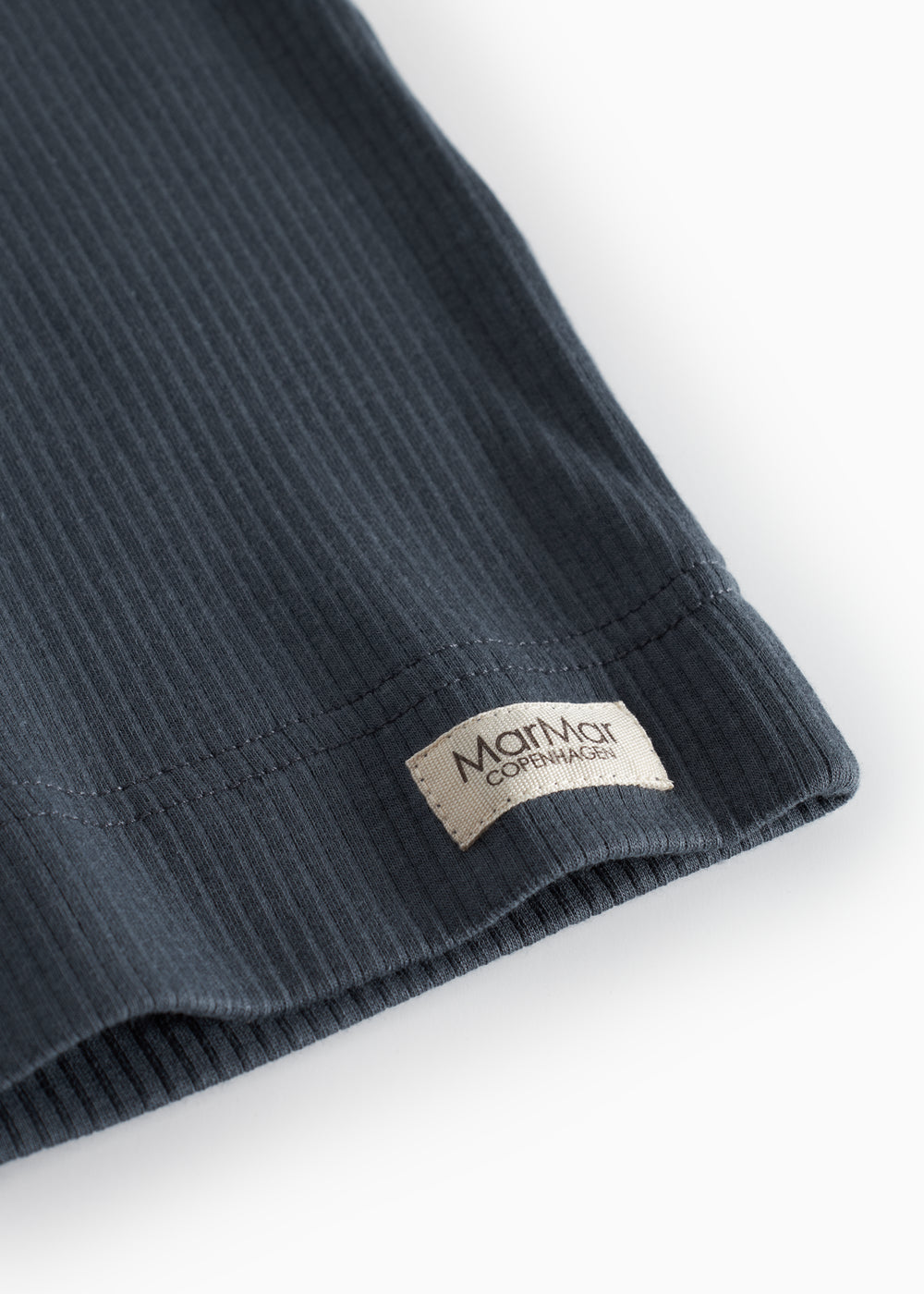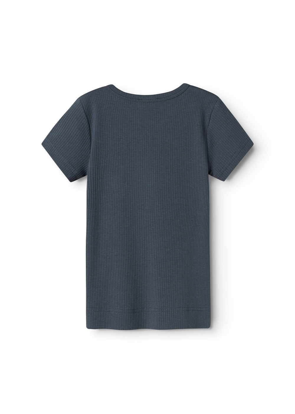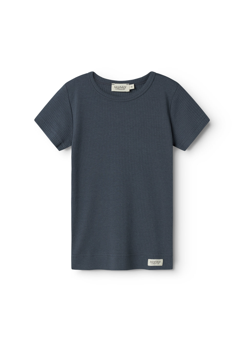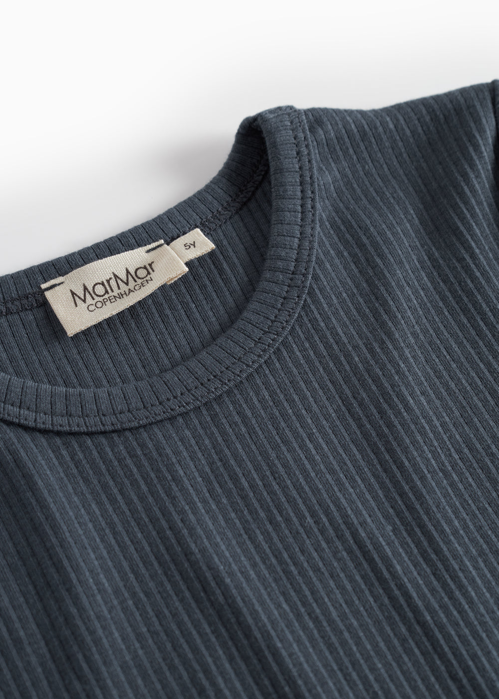 T-shirten er ribstrikket, blød, holder form og farve og har elastan i sig som gør den strækbar og behagelig at have på.