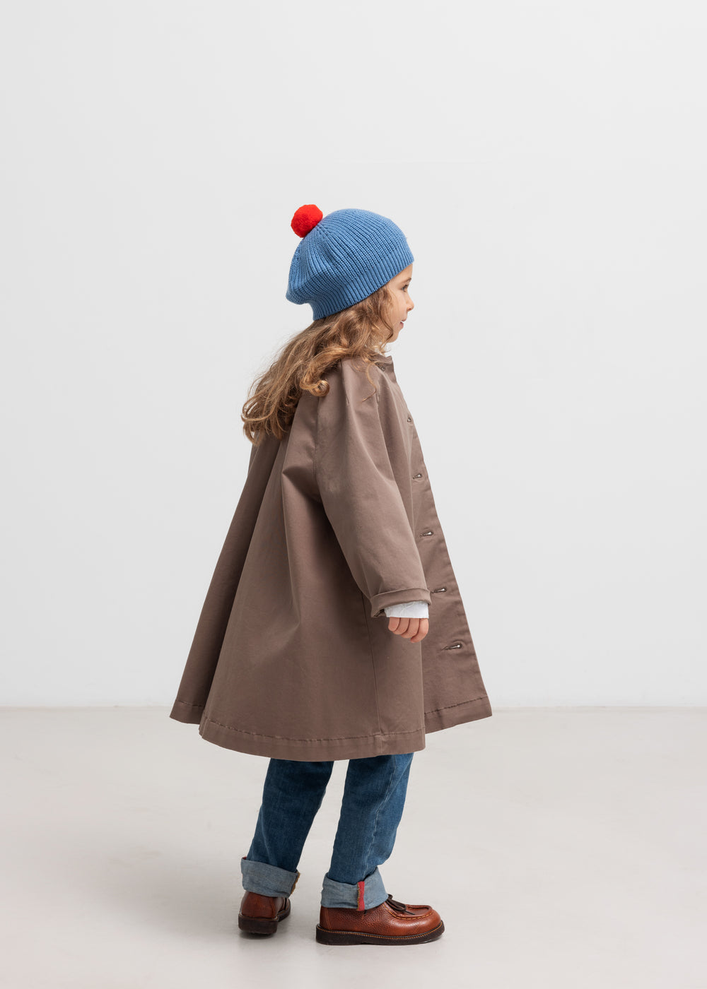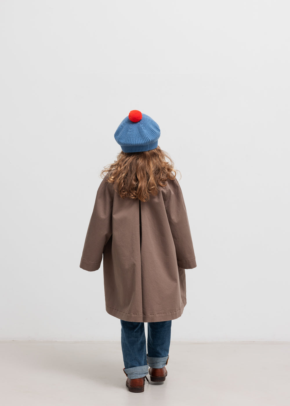Strikket hue med blød pompon på toppen. Huen har en rund, let bølget form og sidder godt på hovedet.