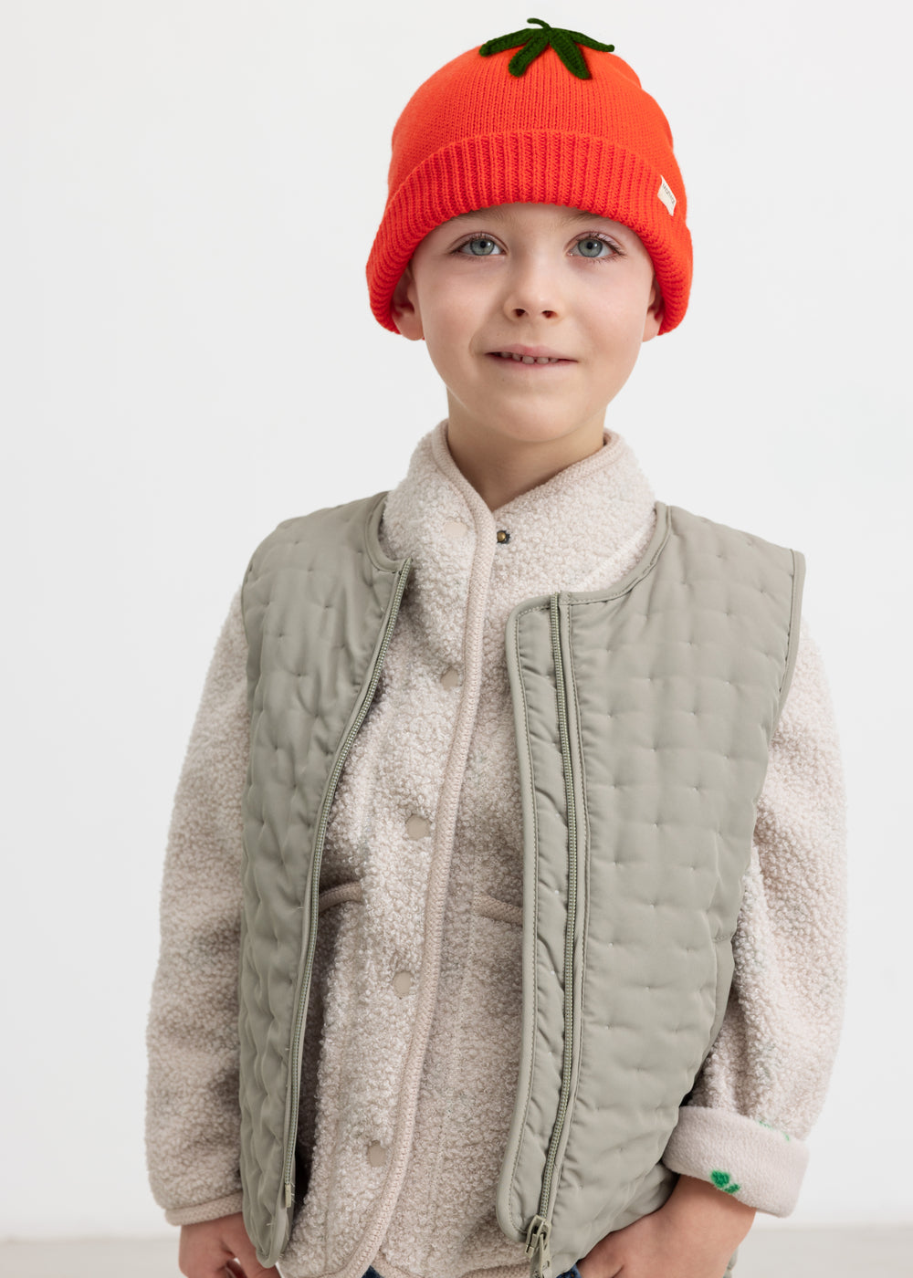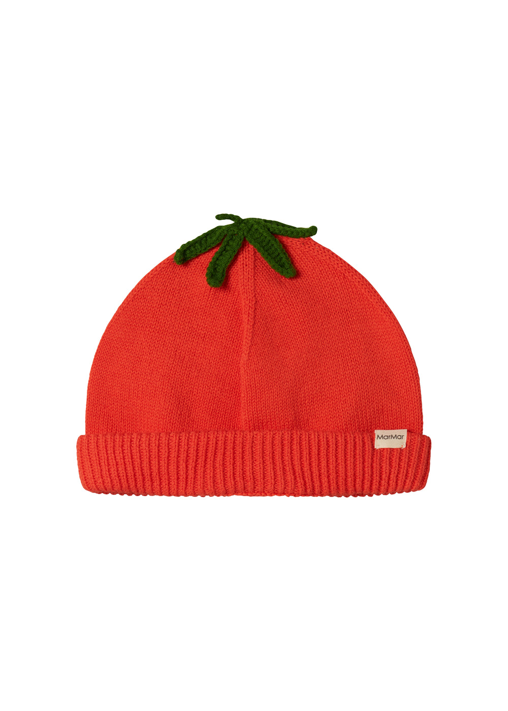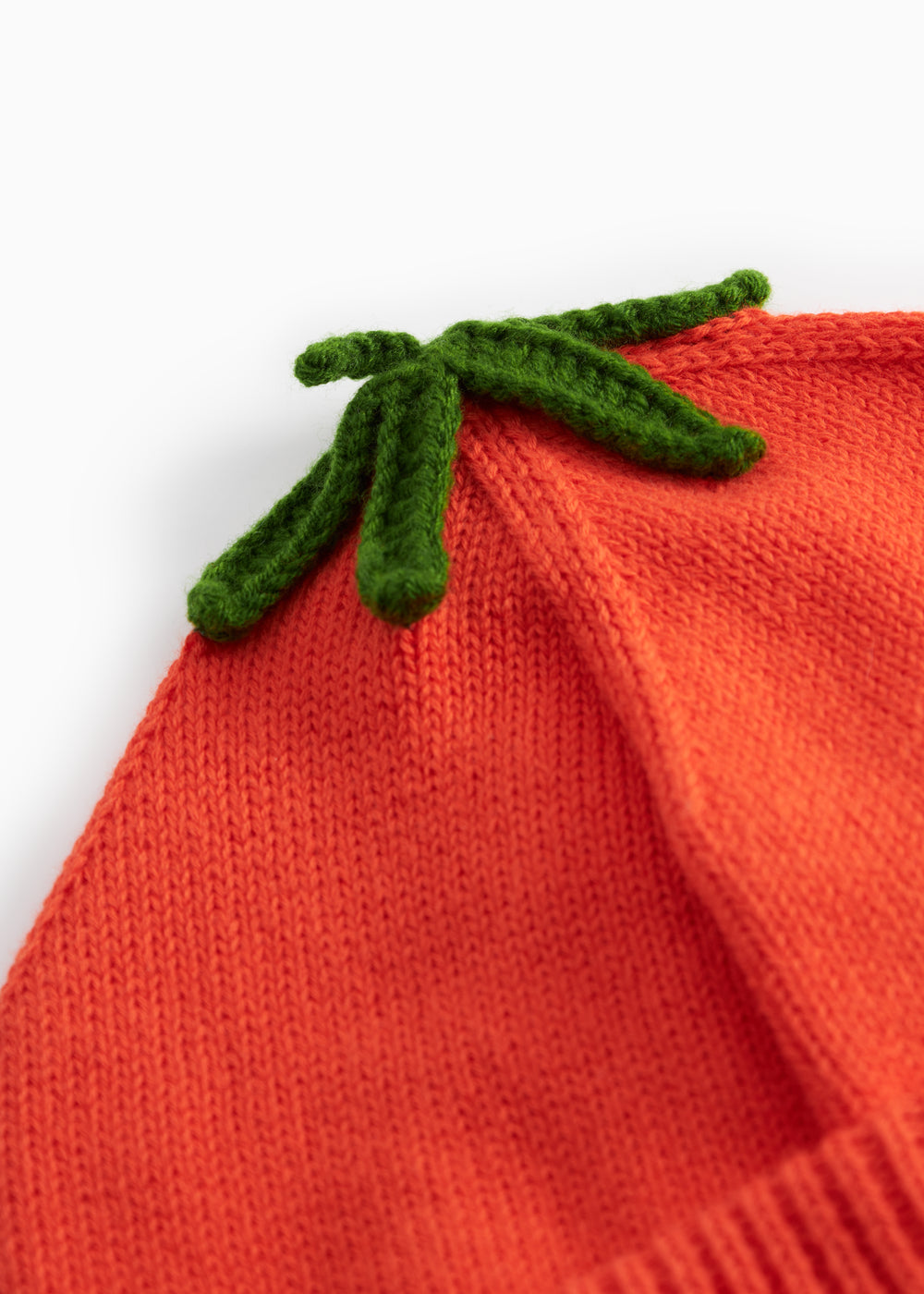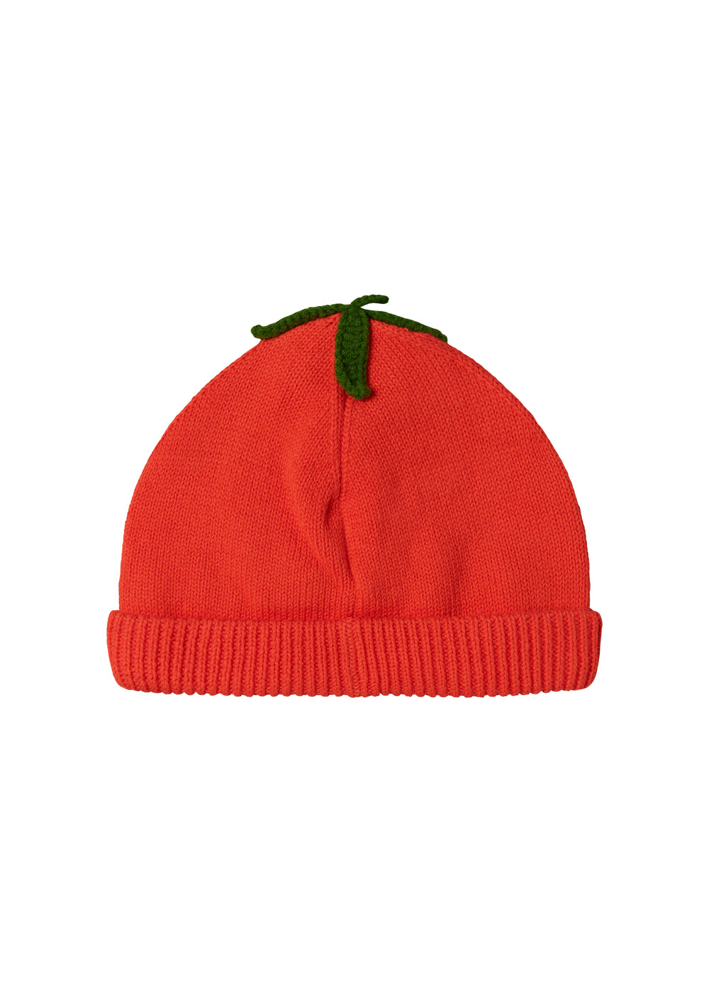 Strikhue til børn formet som en tomat med en lille stilk på toppen. Strikhuen er både blød, varm og behagelig at have på.