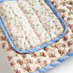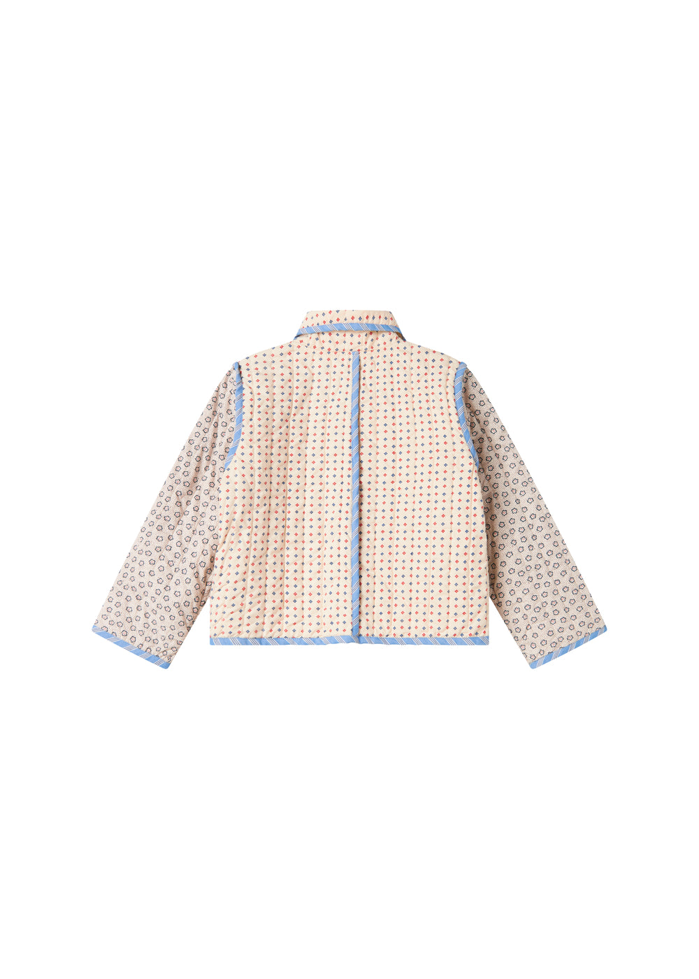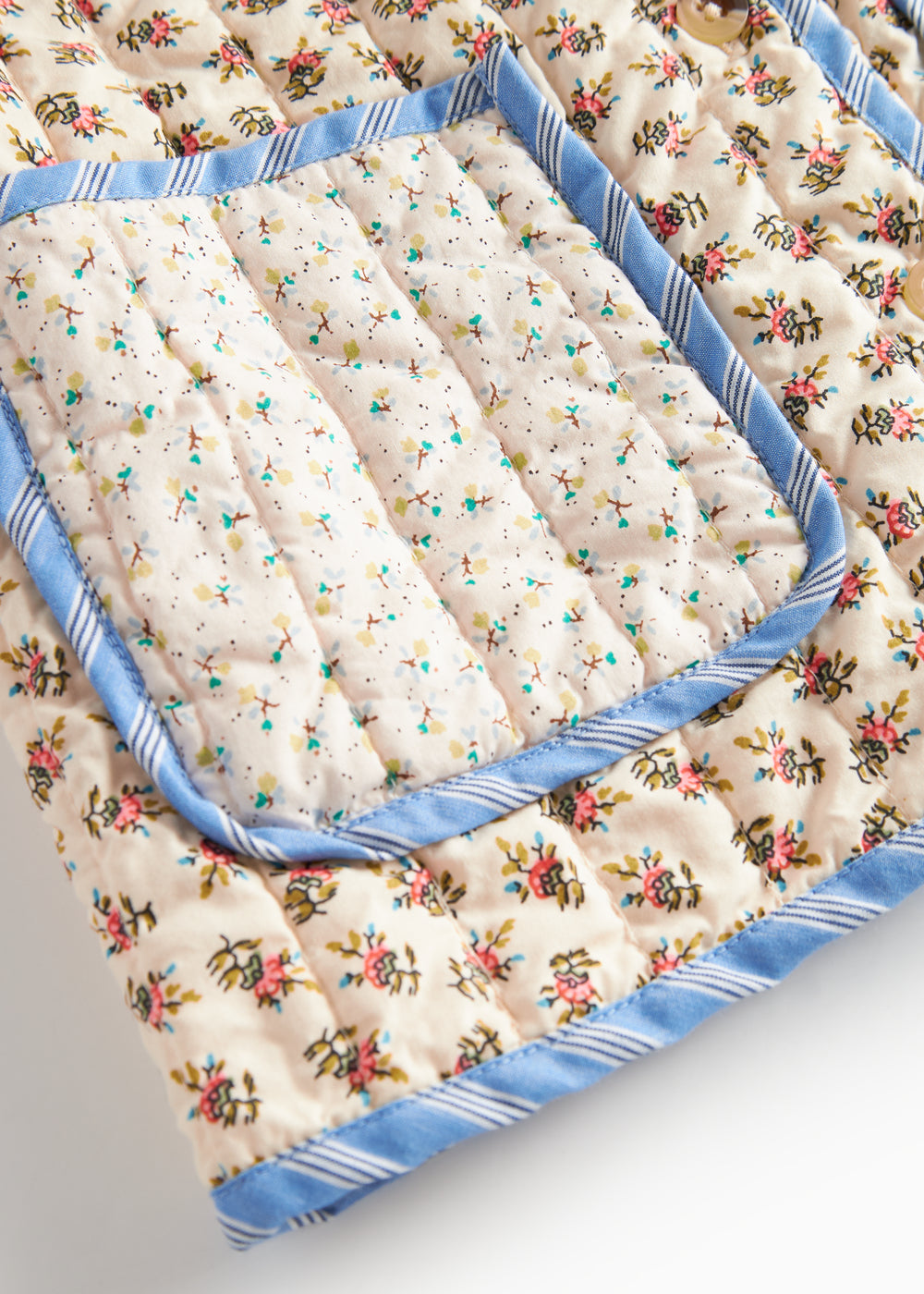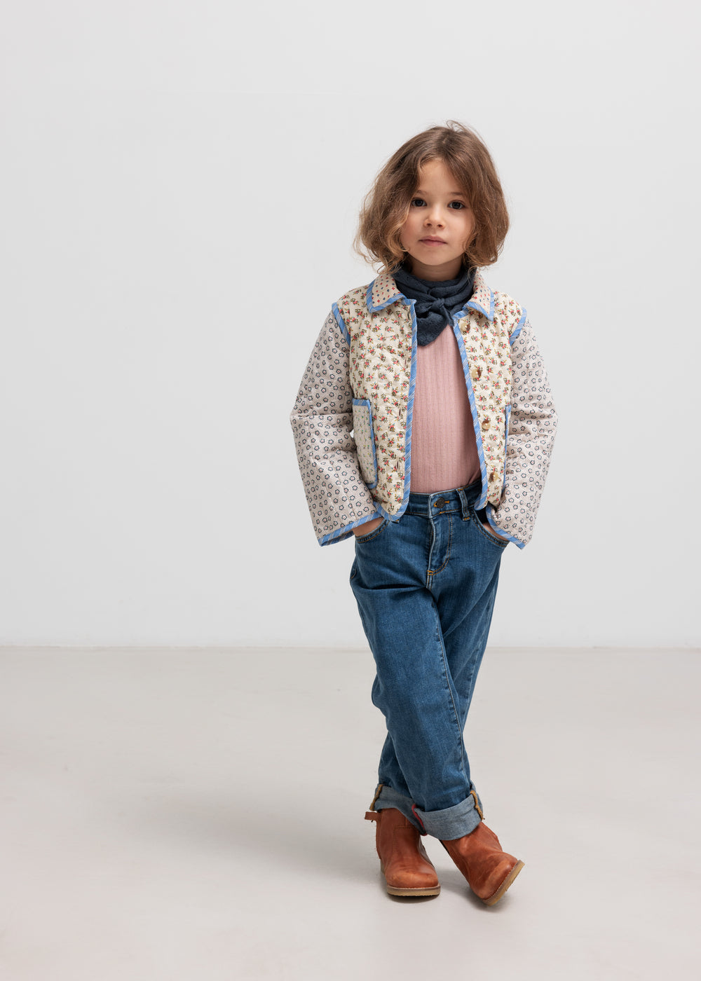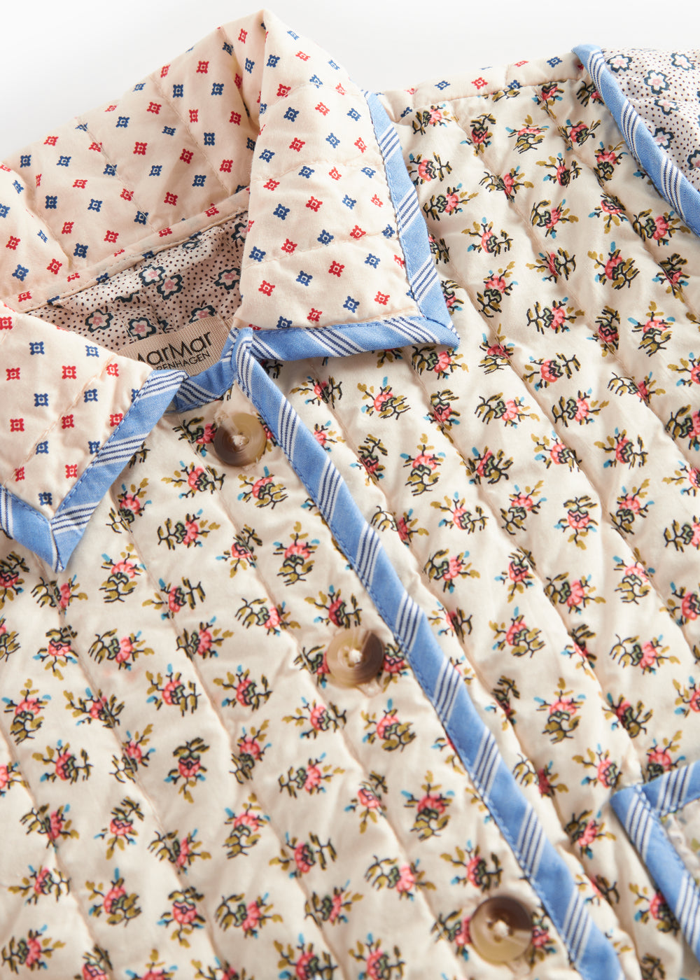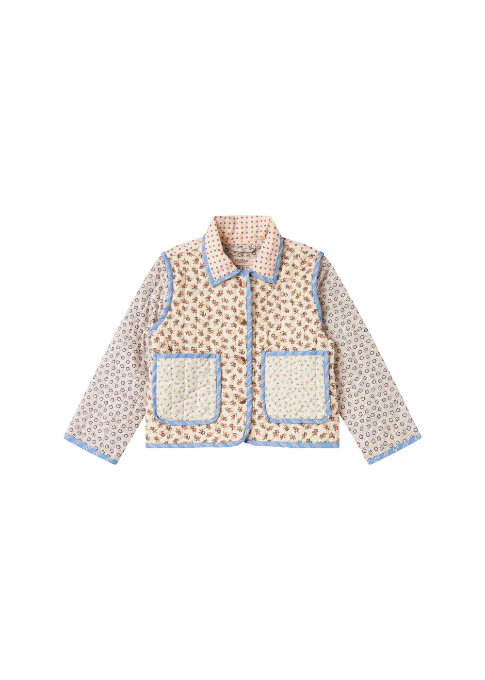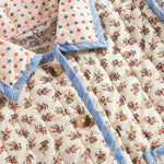 Quiltet jakke til børn med forskellige blomstrede mønstre og kontrastfarvet kantbånd. Jakken har krave, to store rummelige lommer og knaplukning foran. Jakken er perfekt til overgangsvejret.
