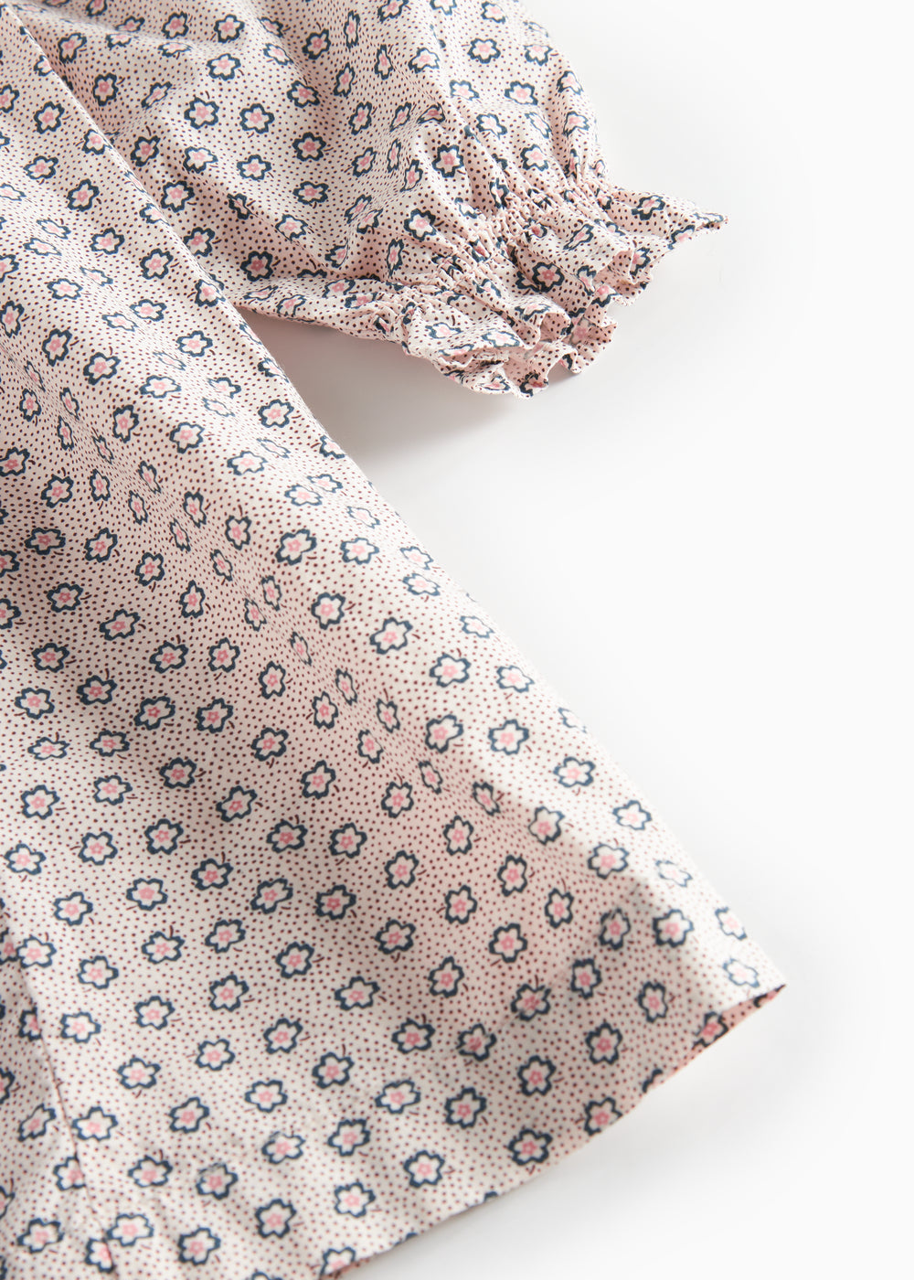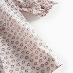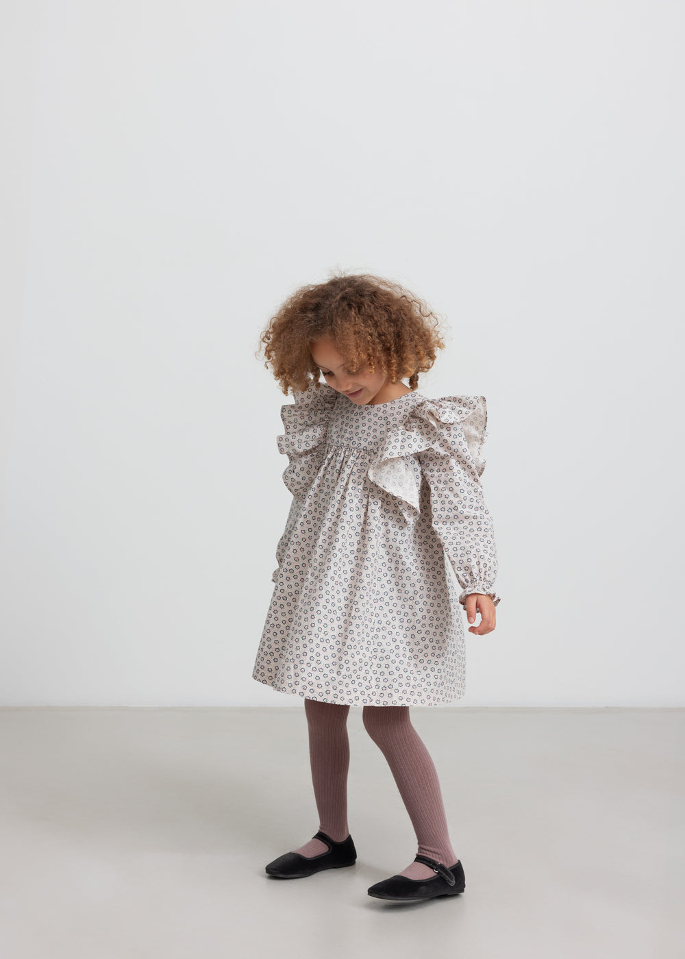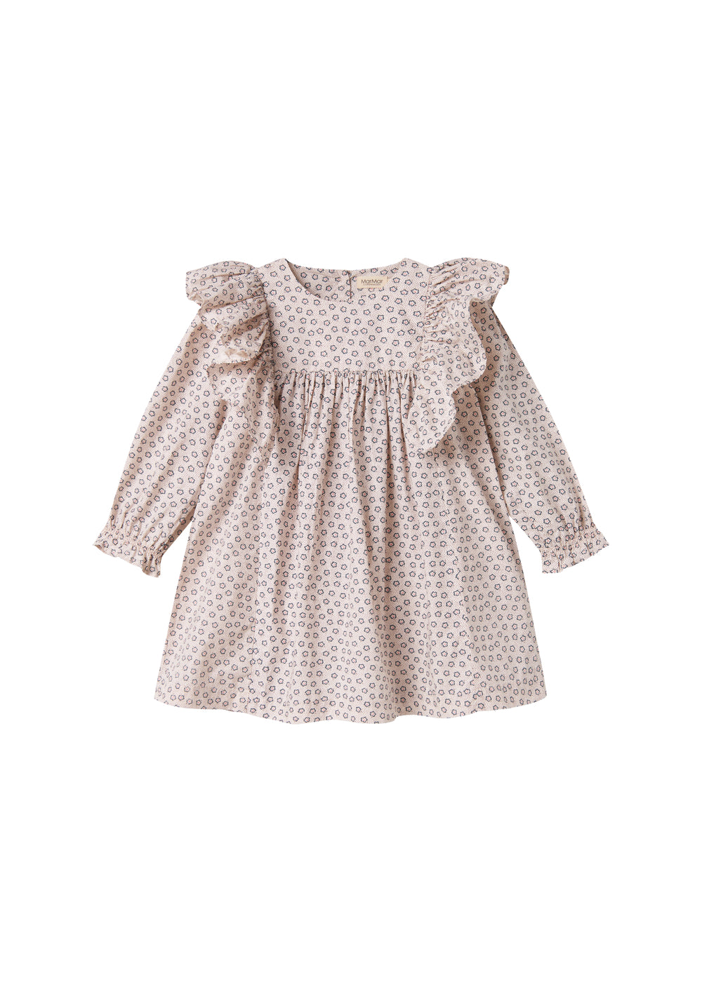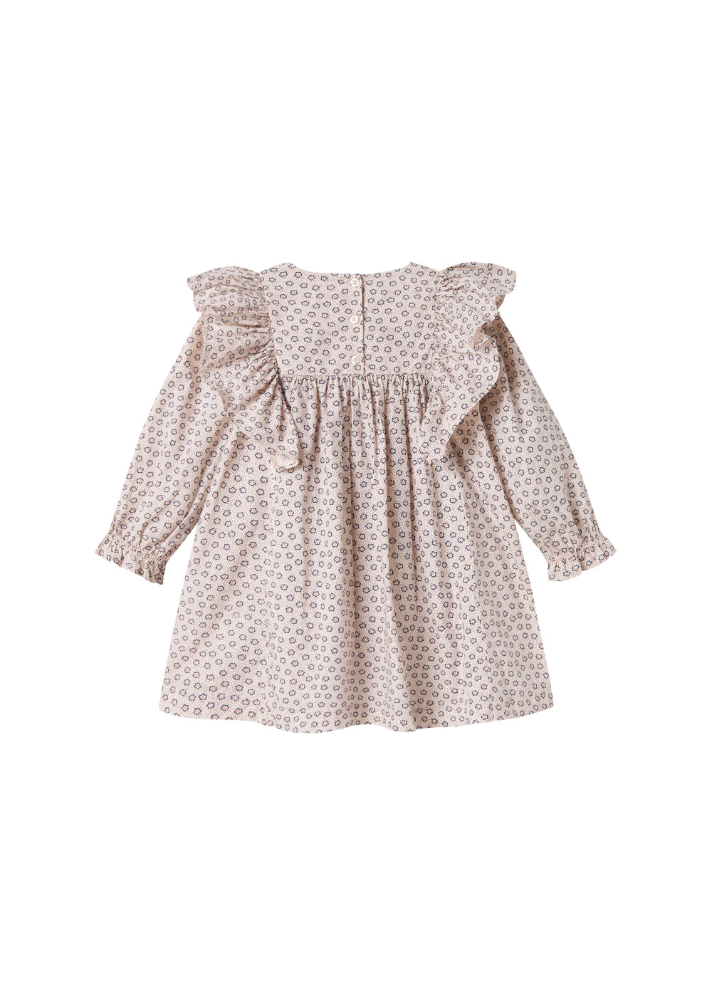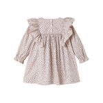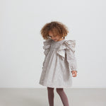 Langærmet og løstsiddende kjole til børn med håndtegnet blomster print og fine flæsedetaljer. Kjolen har knaplukning bagpå og kjolens længde går til over knæene. Kjolen er både behagelig, let og luftig at have på.