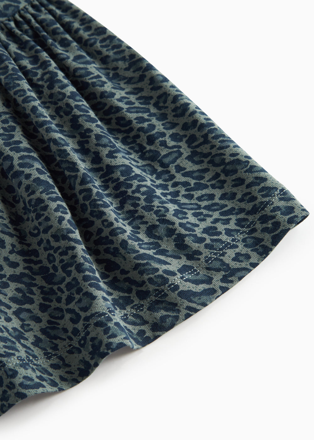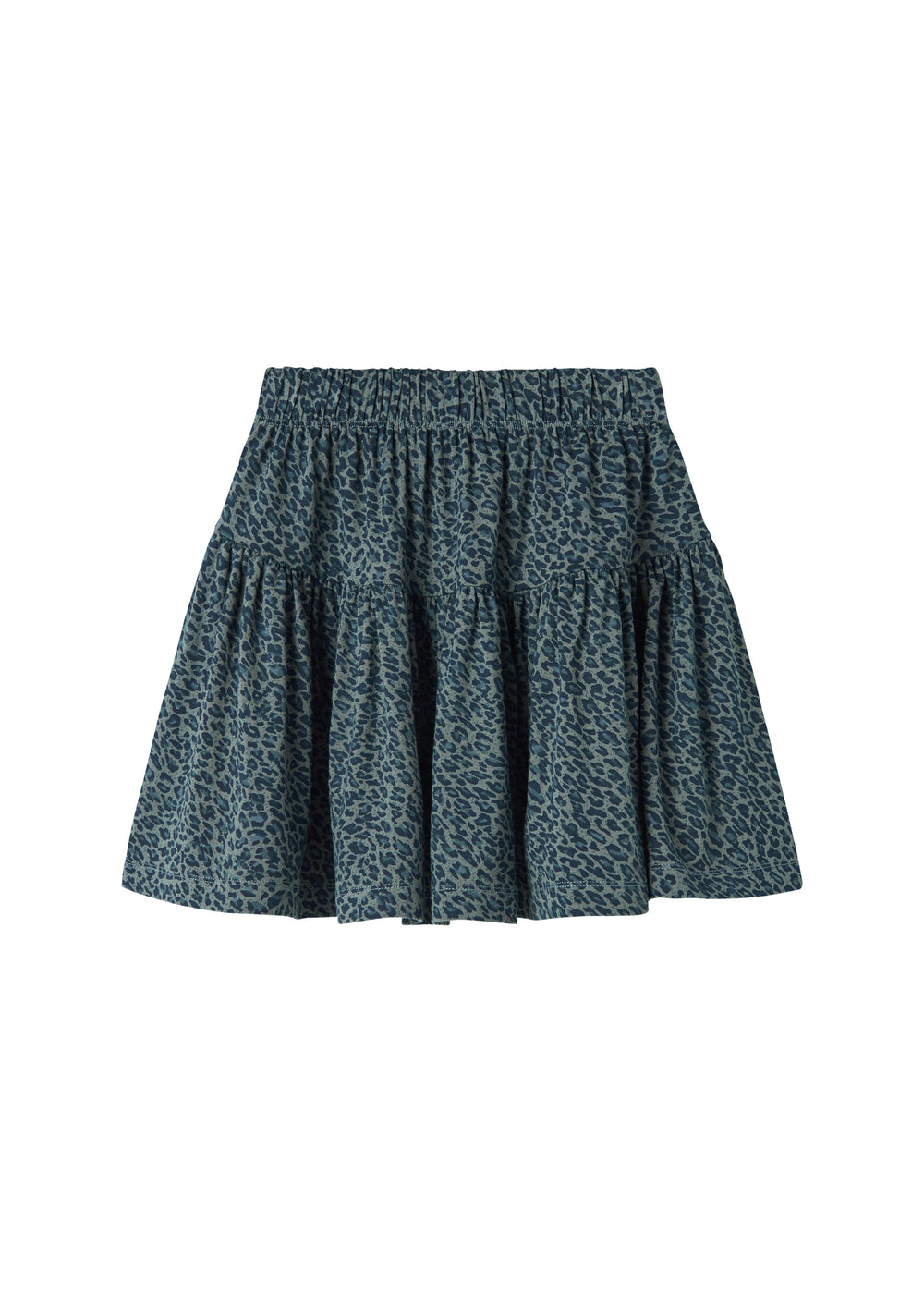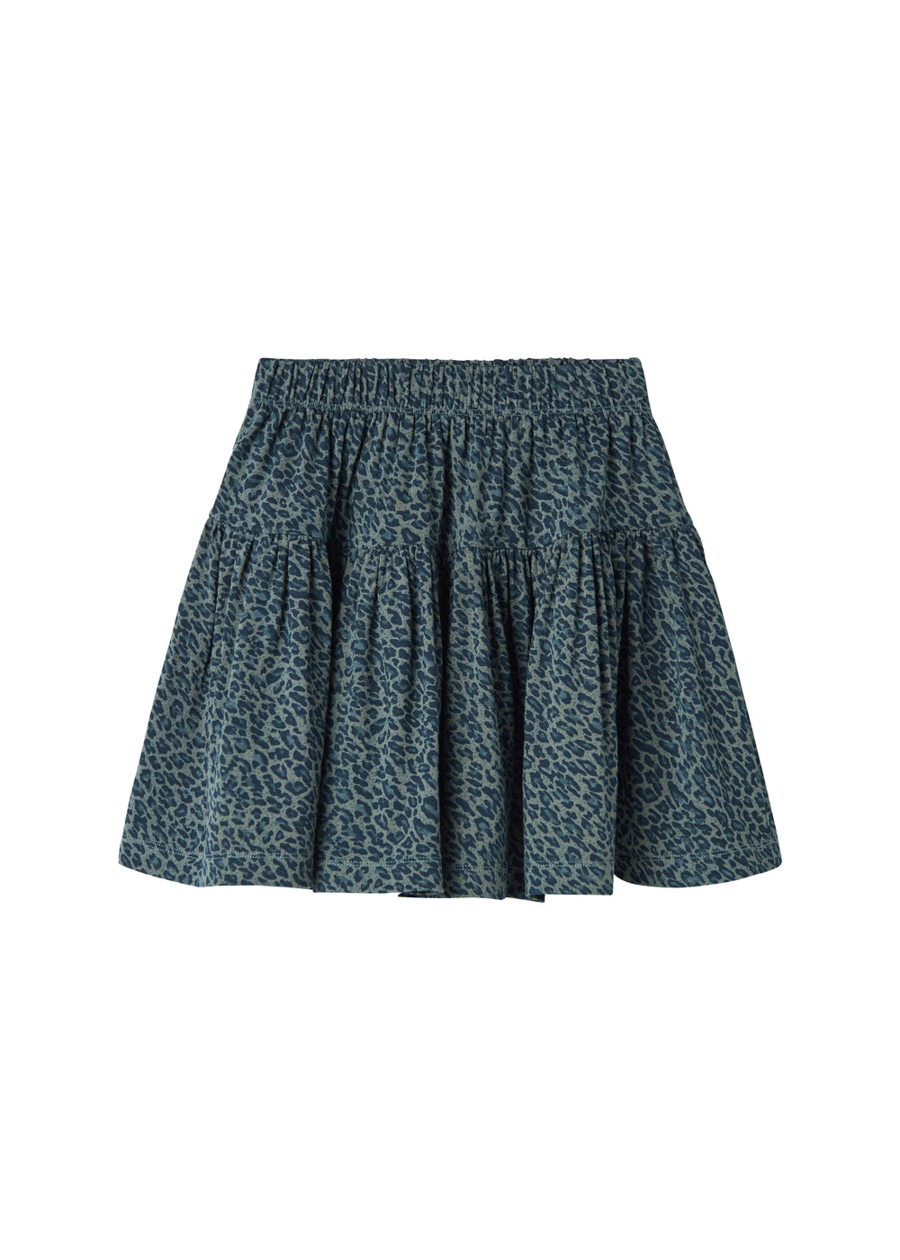 Nederdel i leopard med vidde og elastik i taljen samt et bærestykke, der skaber en fin form. Nederdelens længde går til over knæet. Nederdelen er både meget blød, strækbar og behagelig at have på.