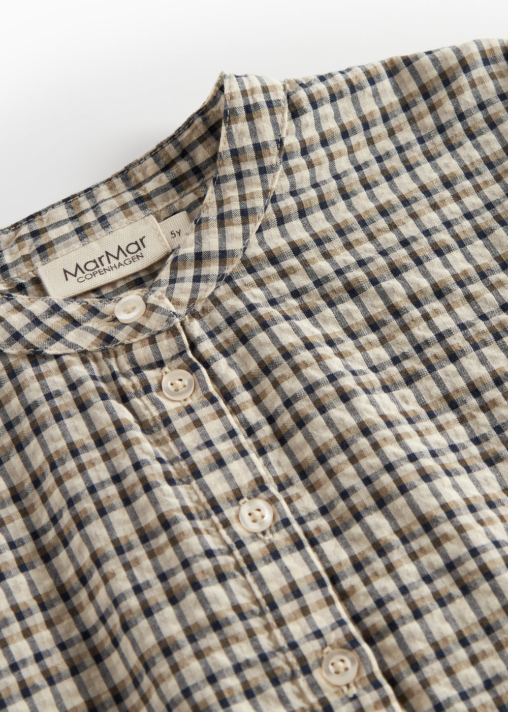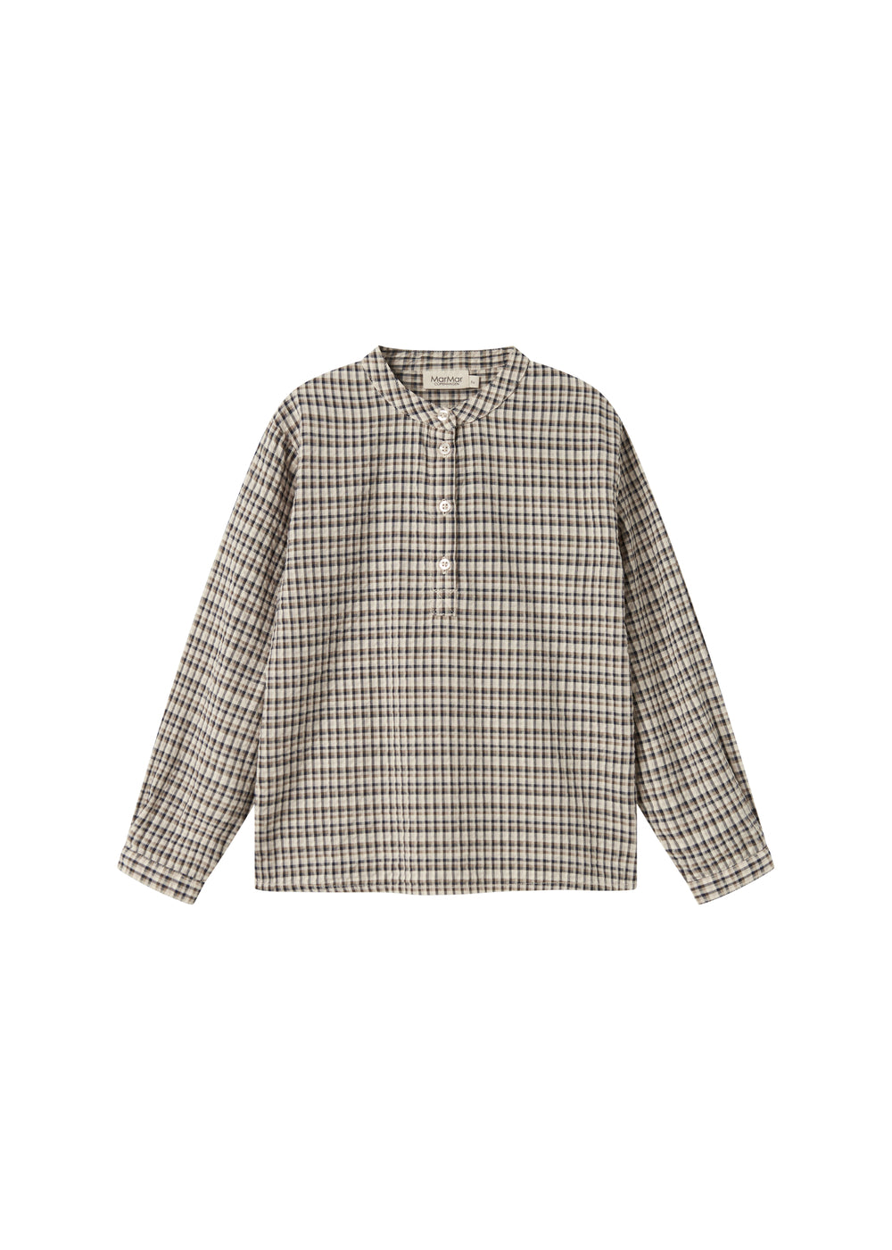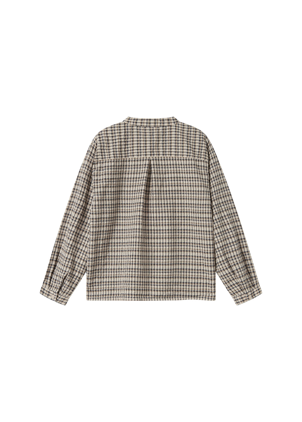 Langærmet skjorte i crepet bomuld med kinakrave og knaplukning foran. Skjorten har et behageligt fit.
