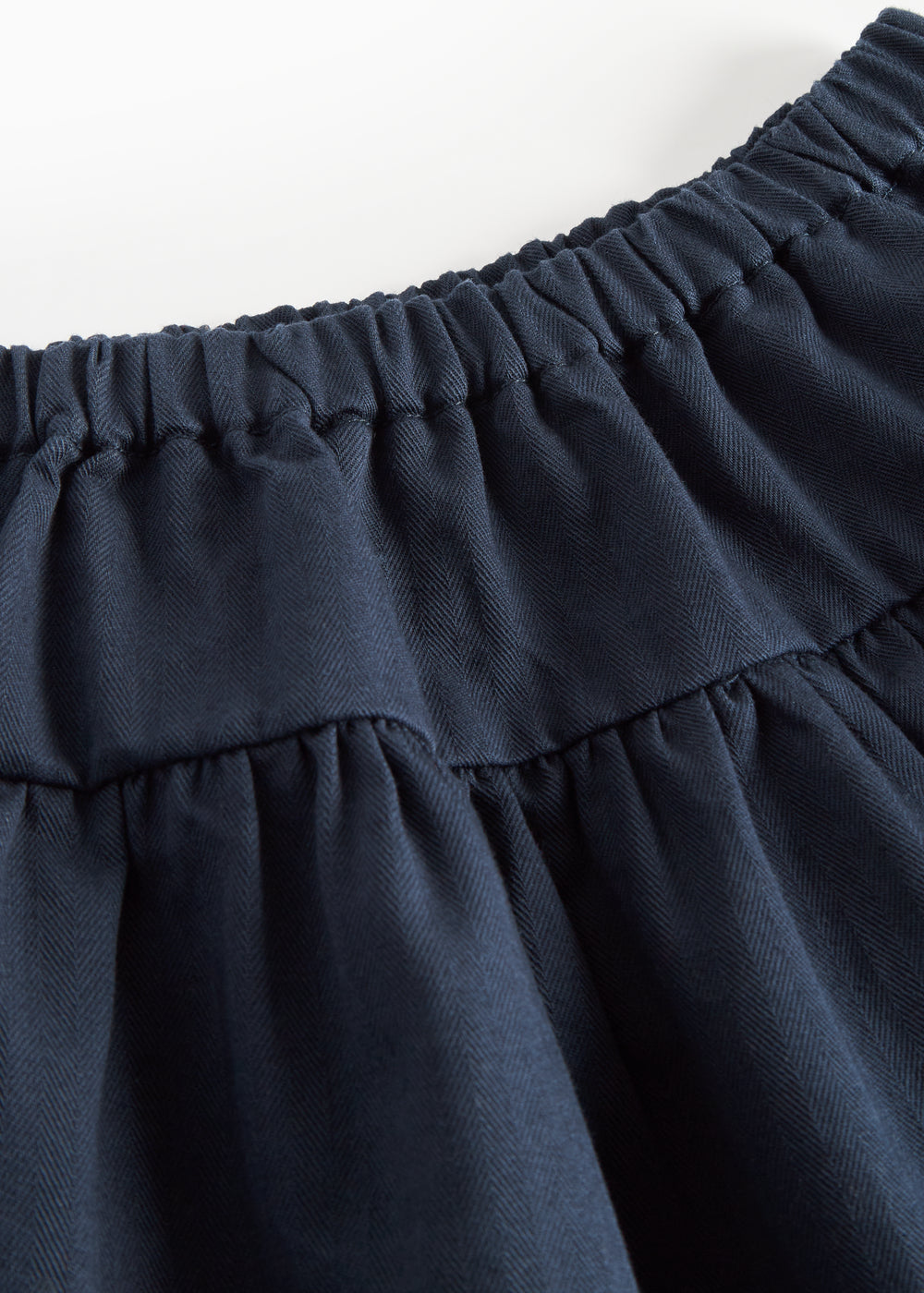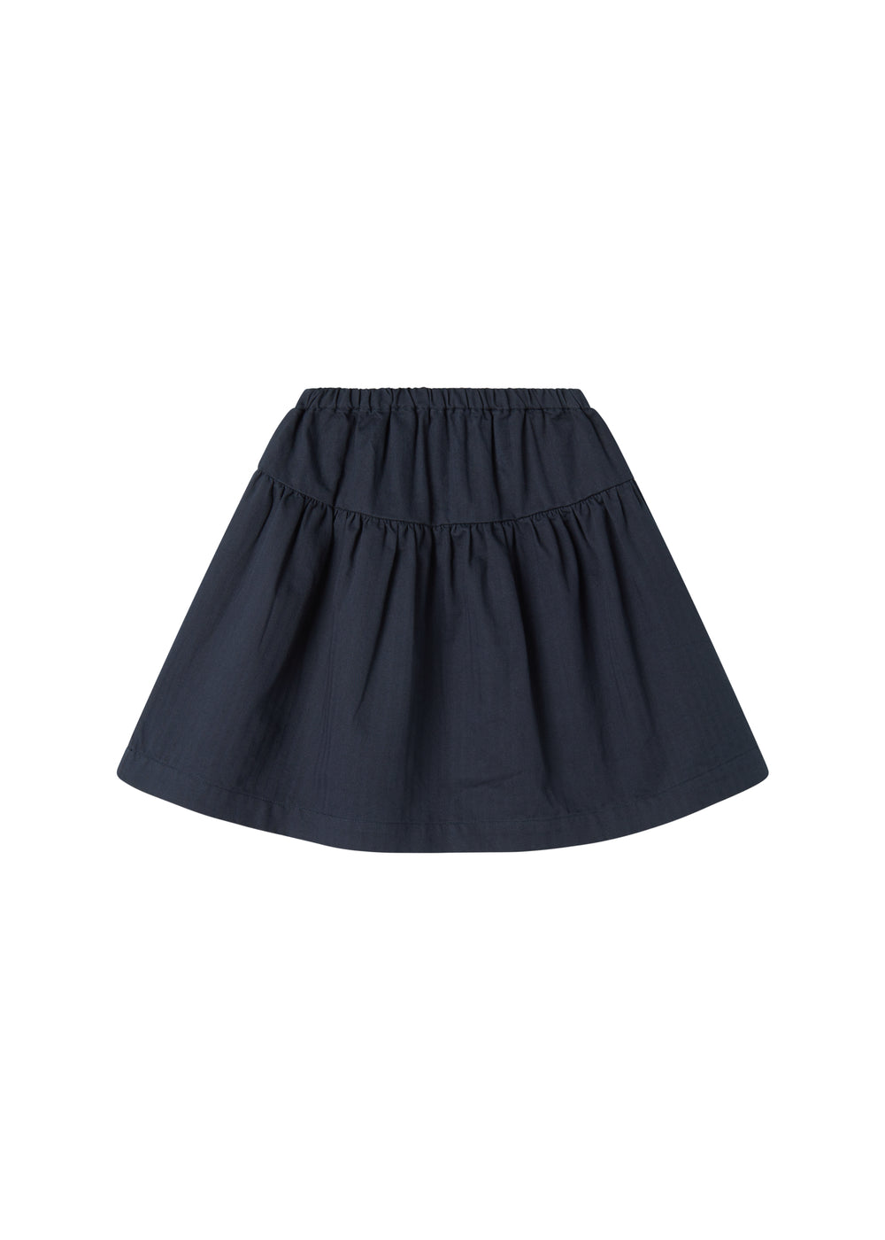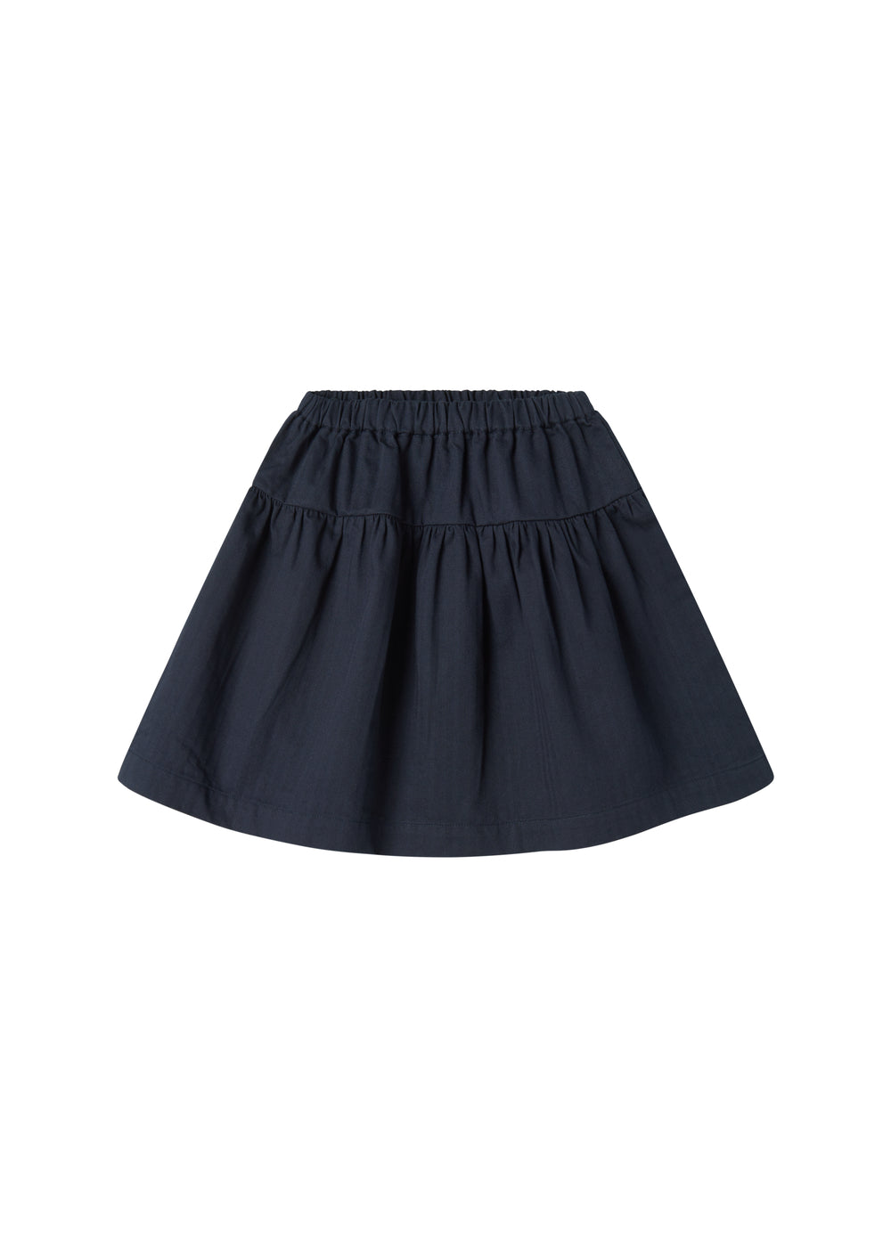 Lang nederdel med vidde, elastik i taljen samt et bærestykke, der skaber en fin form. Nederdelens længde går under knæet. Nederdelen er både cool og klassisk til fest og hverdag.