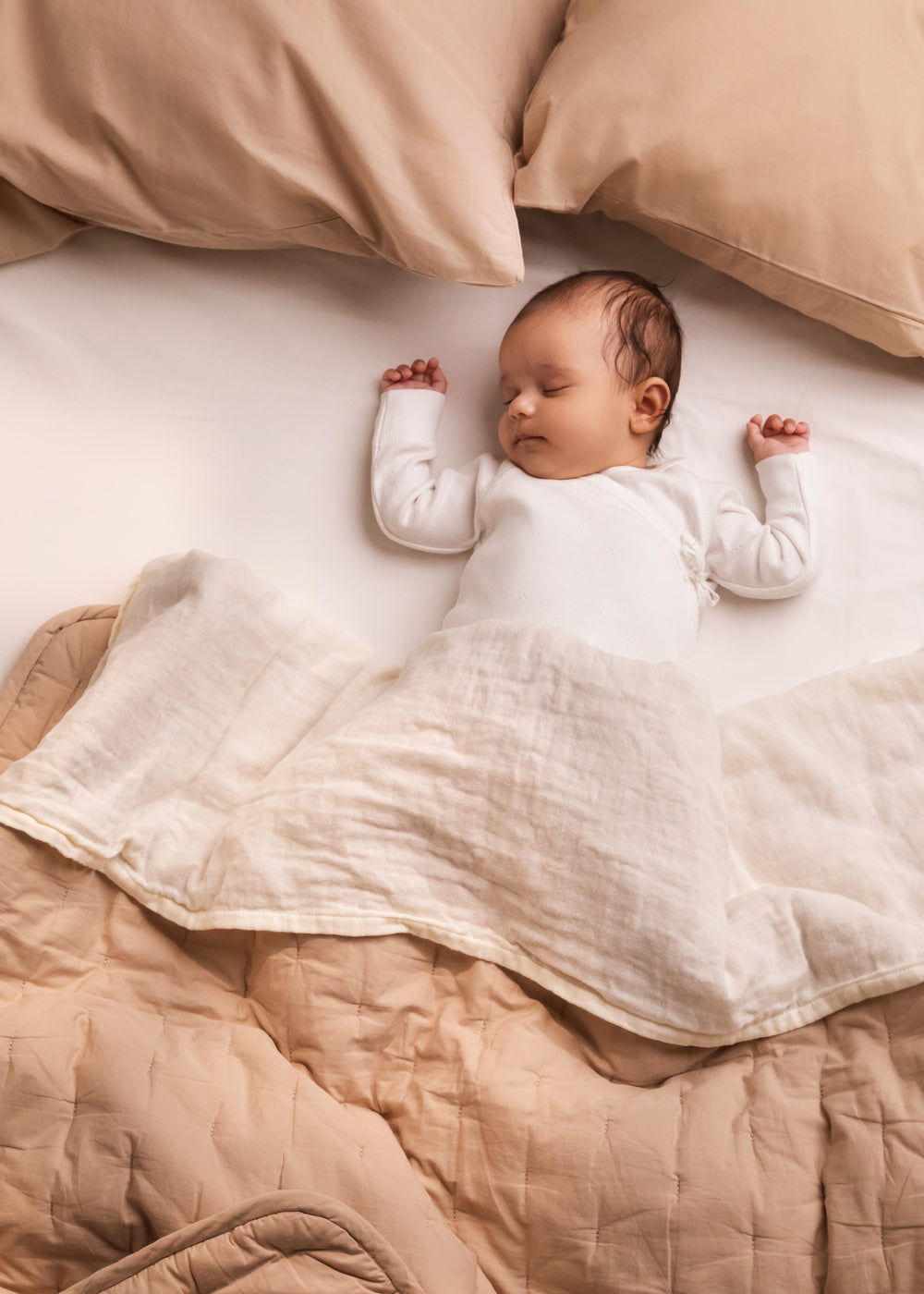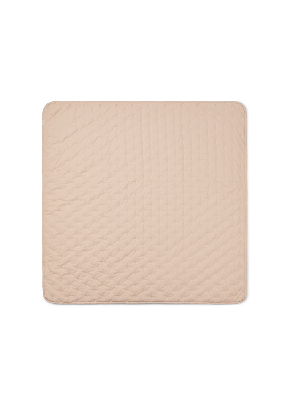 Quiltet tæppe med afrundede hjørner. Tæppet kommer i en pose med hank, så det er nemt at tage med på tur. Måler 120 cm x 120 cm