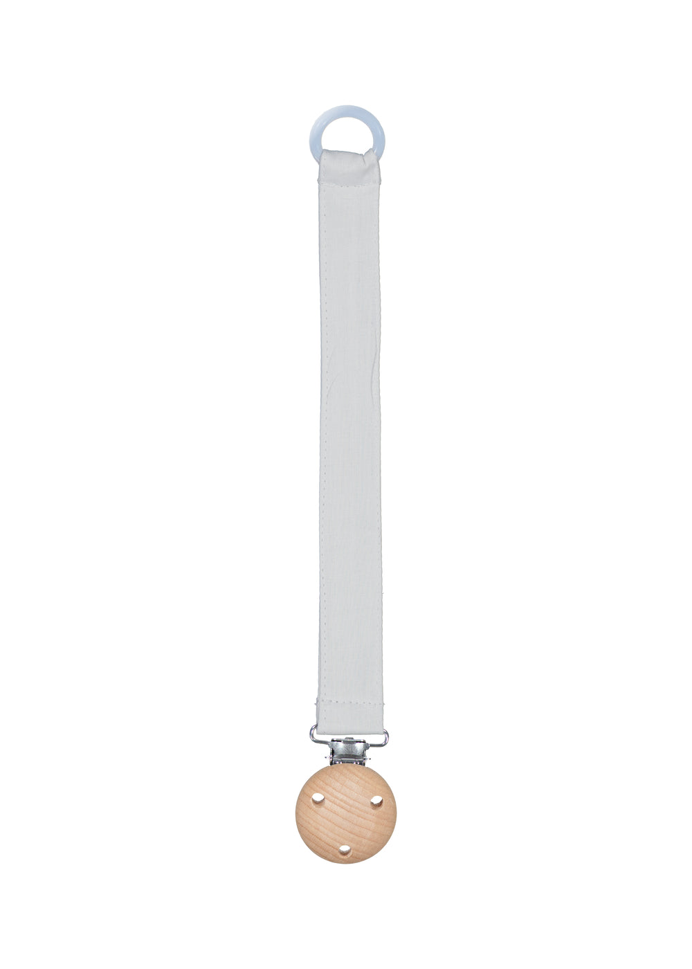 Suttesnor med gummiring og træ/metalklips. Længde på snor 19,5 cm