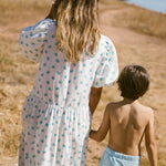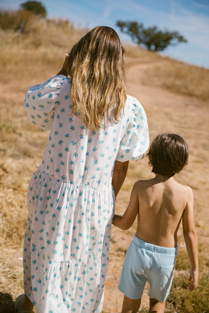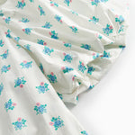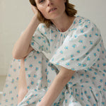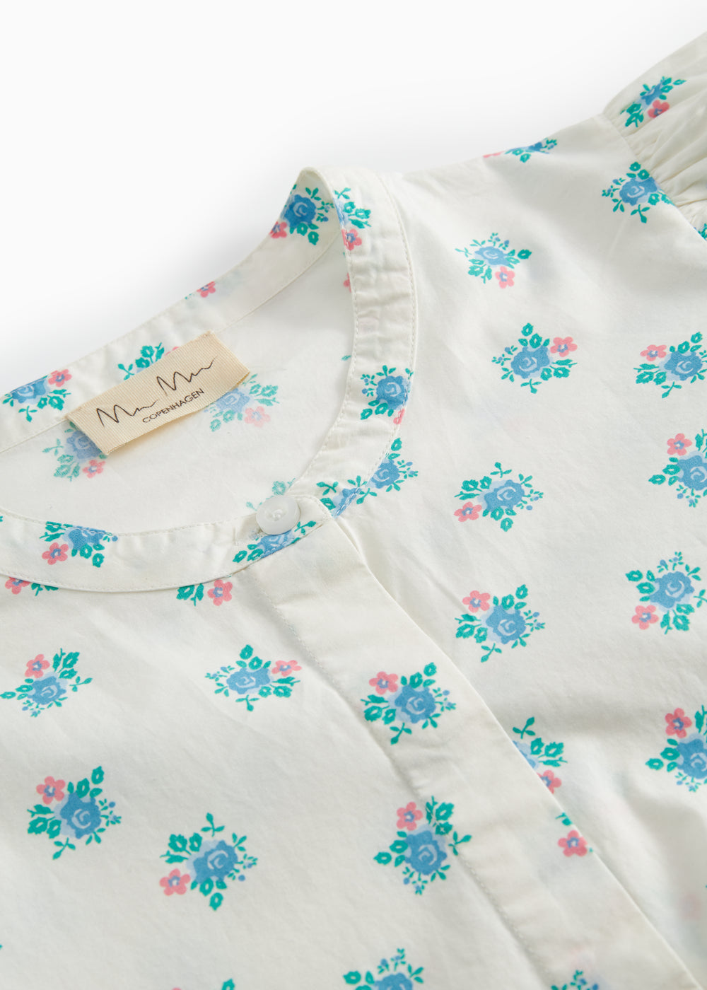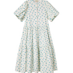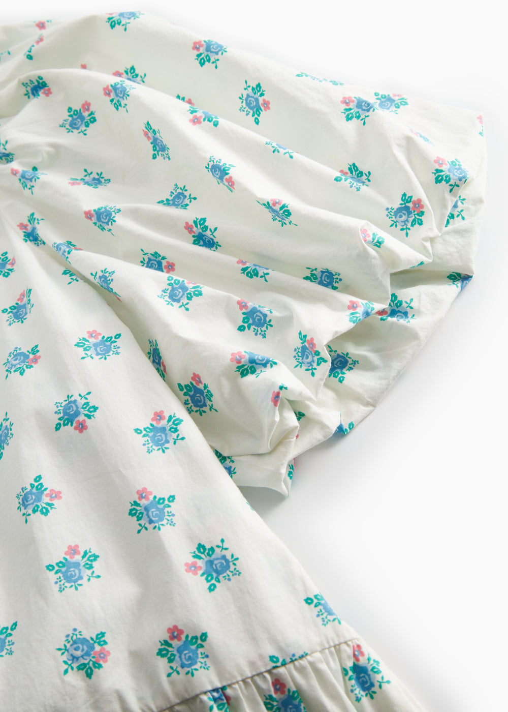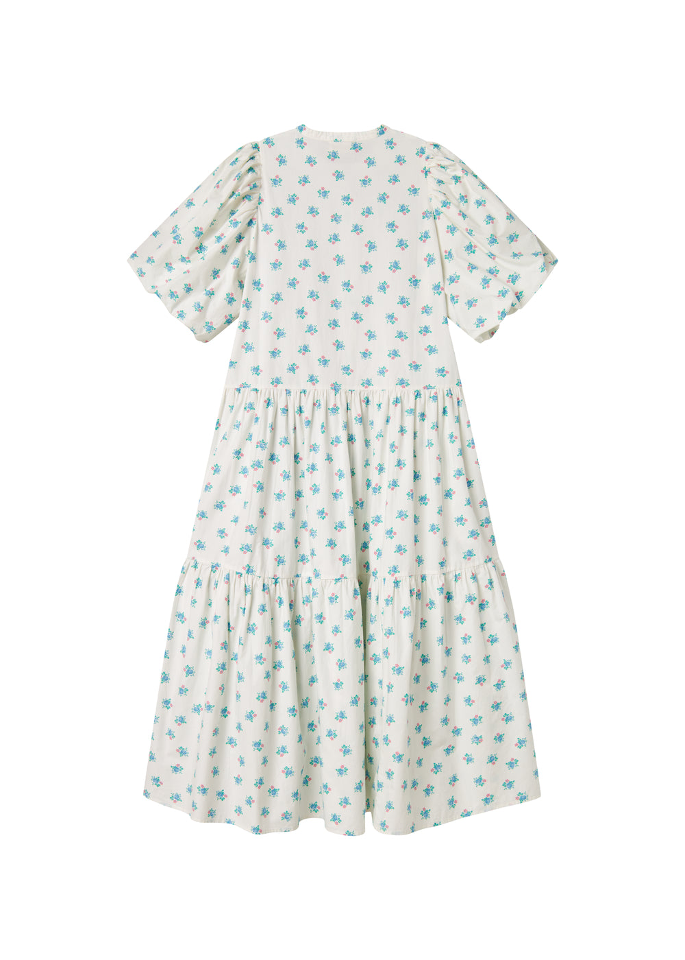 Kortærmet lagdelt kjole med pufærmer og fint blomster print til kvinder. Kjolen har knaplukning foran og kjolens længde går til under knæene. Kjolen er i en let og crispy bomulds kvalitet som gør den behagelig og luftig at have på