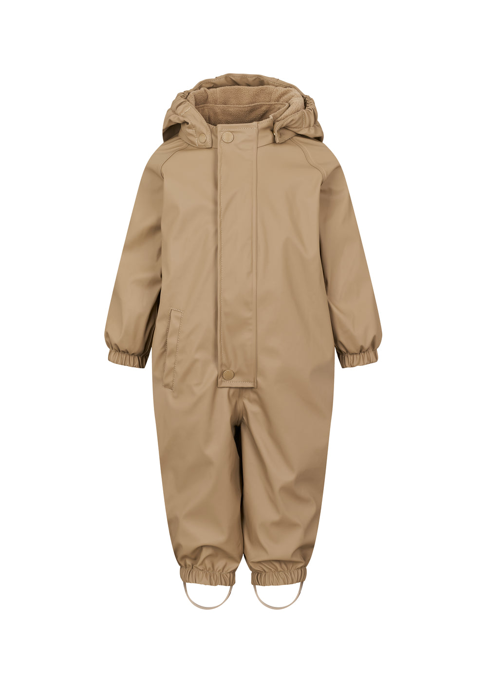 Praktisk og funktionel regndragt med fleecefor, perfekt til at holde barnet varmt og tørt på de regnfulde og kølige dage. Regndragten lukkes med en praktisk lynlås samt trykknapper foran, hvilket forhindrer vind og vand i at trænge ind. Både ærmer og ben har elastiske manchetter, der sikrer en tæt pasform og holder kulden ude. Dragten har en aftagelig hætte, som kan tages af efter behov samt justerbare fodstropper der holder dragten på plads over støvlerne og forhindrer vand i at trænge ind. Regndragten har en smart og praktisk sidelomme til småting og dragten er perfekt til udendørs leg og hverdagsbrug.
