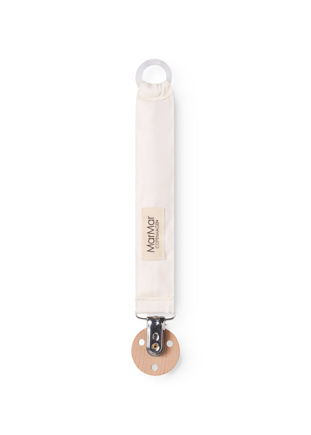 Suttesnor med gummiring og træ/metalklips. Længde på snor 18,8 cm.