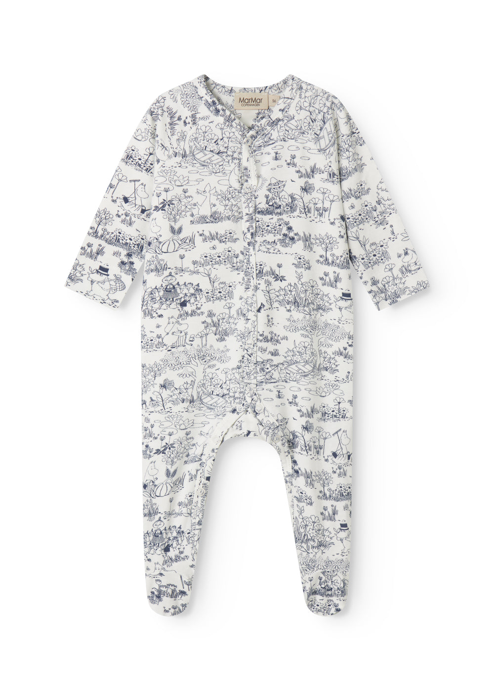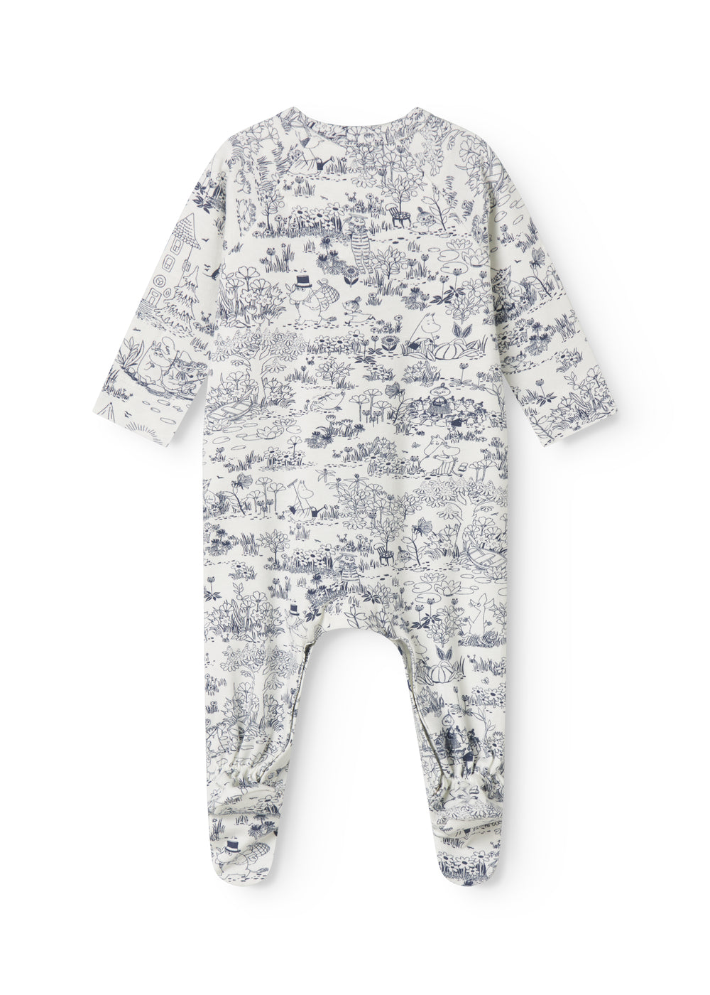 Enkel langærmet heldragt med fødder der kan knappes helt fra hals og ned langs begge ben med trykknapper for nem bleskiftning. Heldragten har et sødt Moomin print og er både blød, holder form og farve og har elastan i sig som gør den strækbar og behagelig at have på.