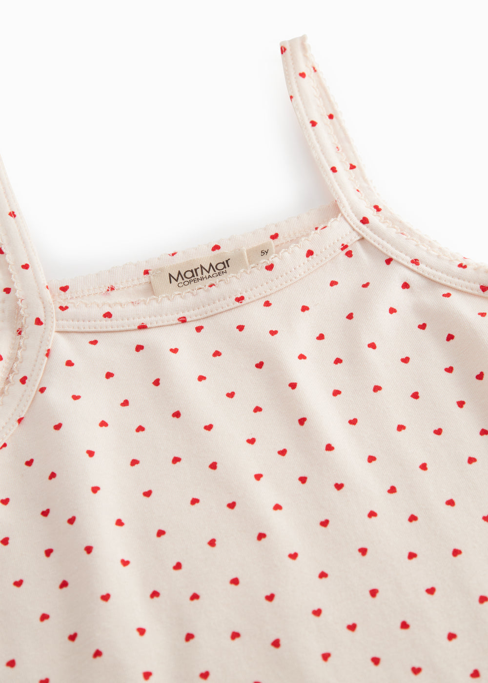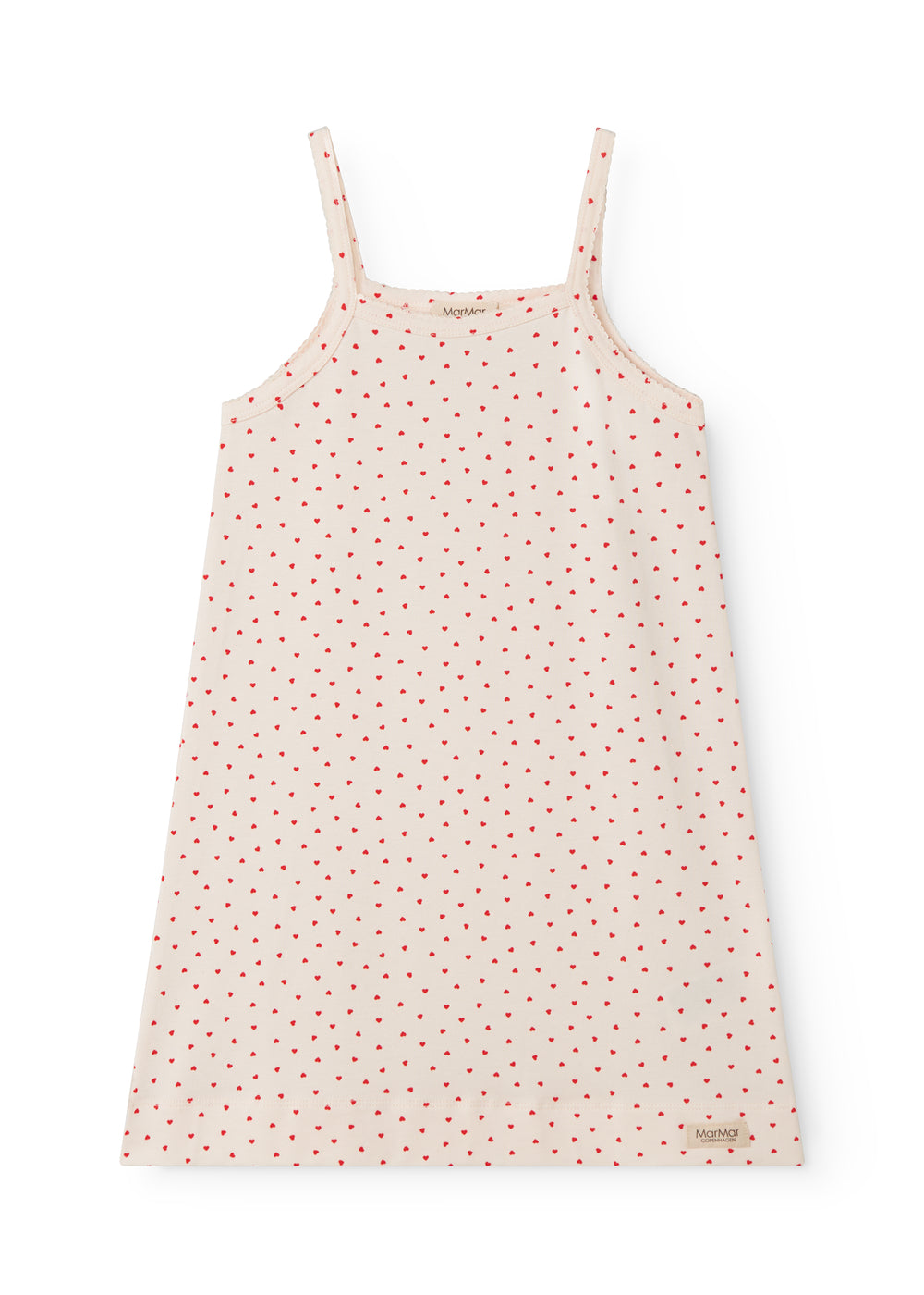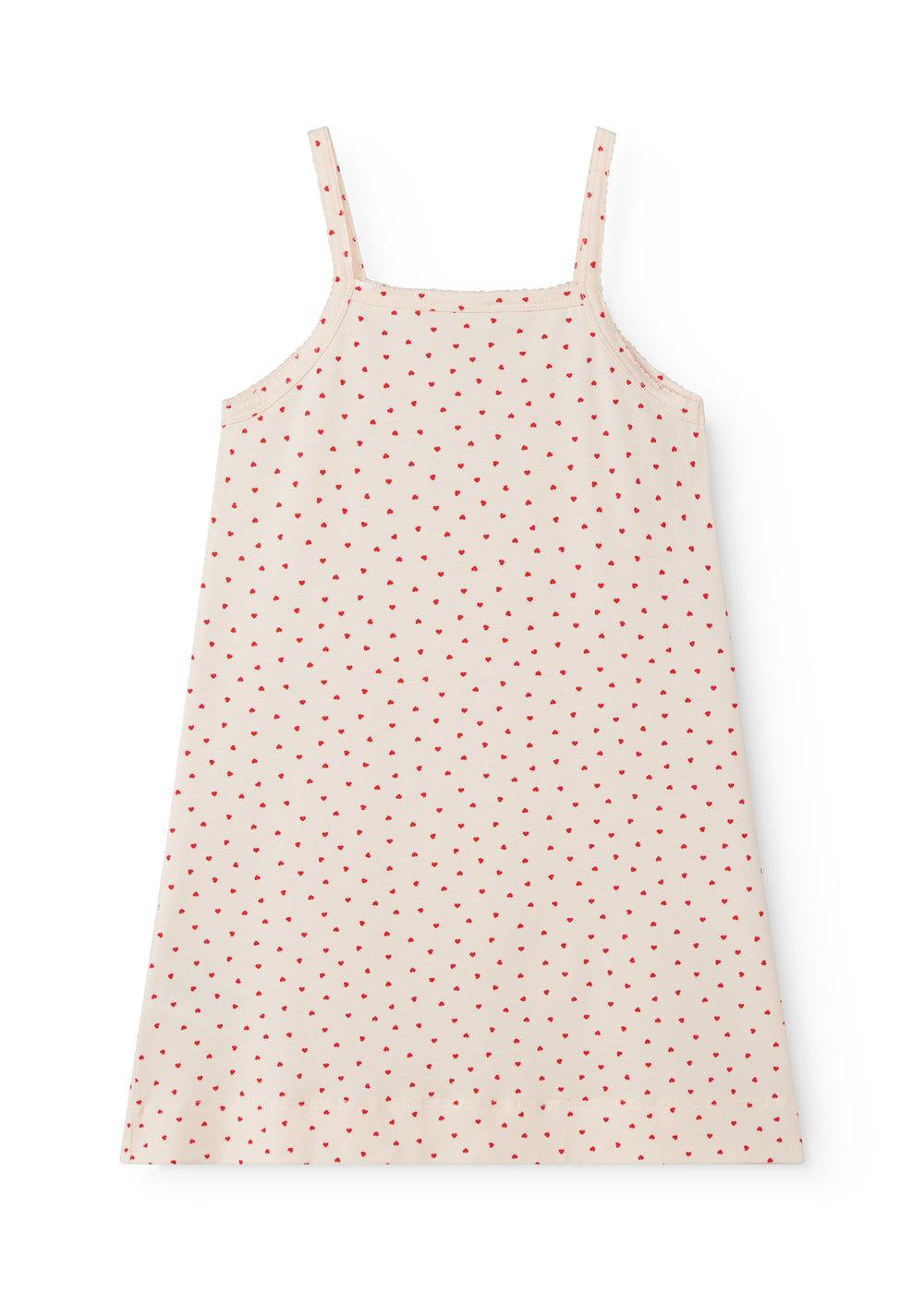 Stropkjole uden ærmer og med et fint hjerte print. Kjolens længde går til over knæet. Kjolen er både blød, strækbar og behageligt at have på.