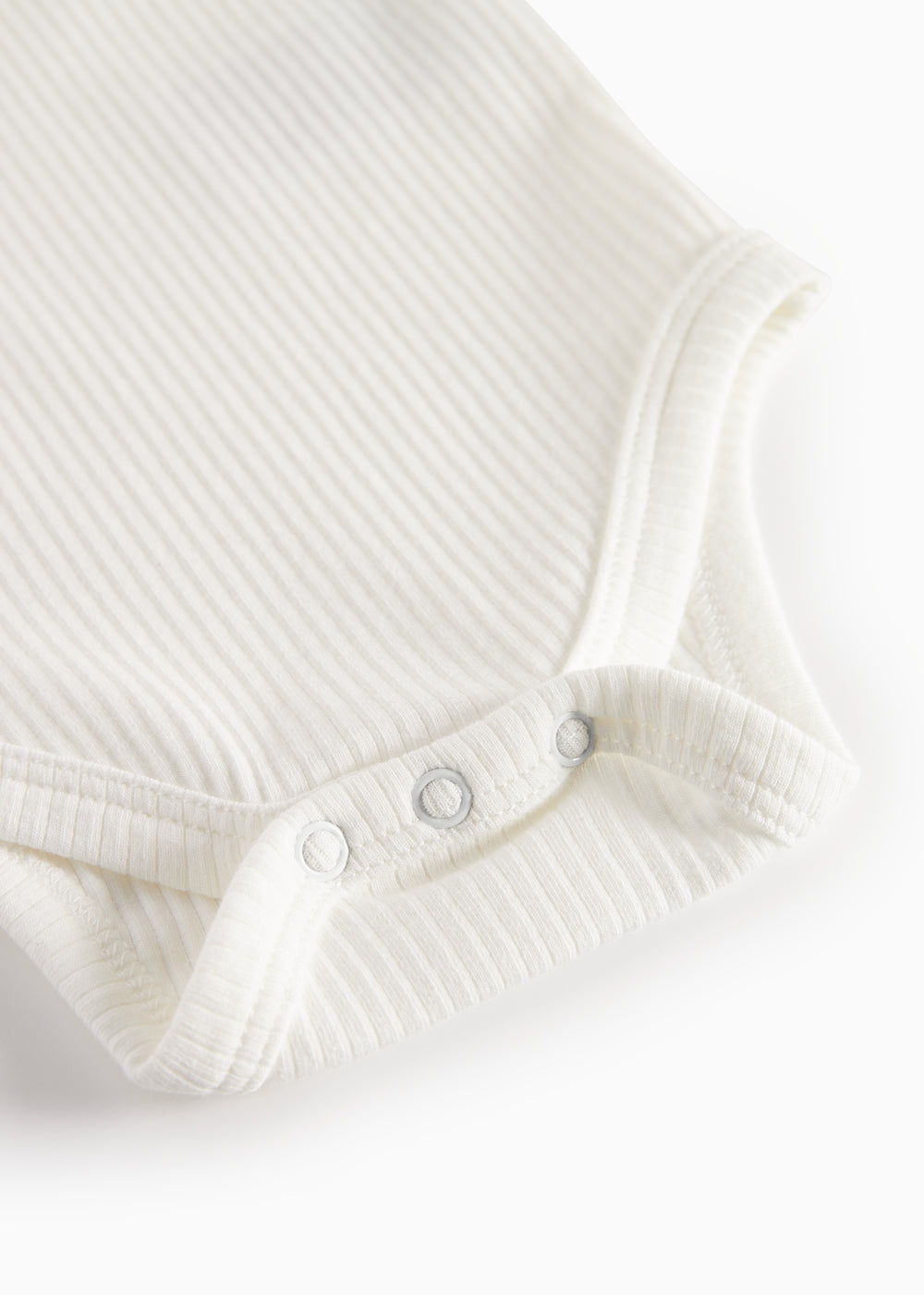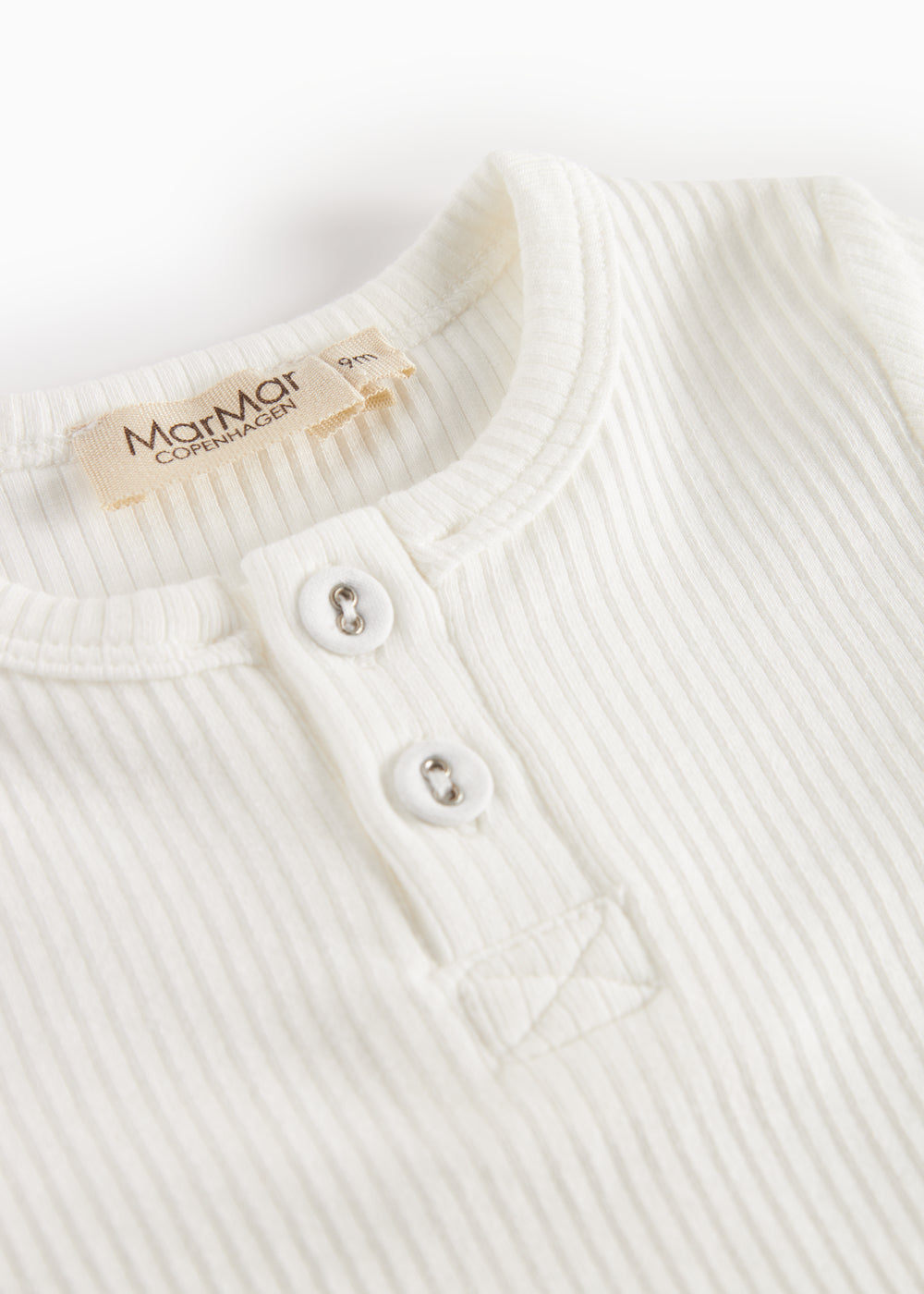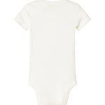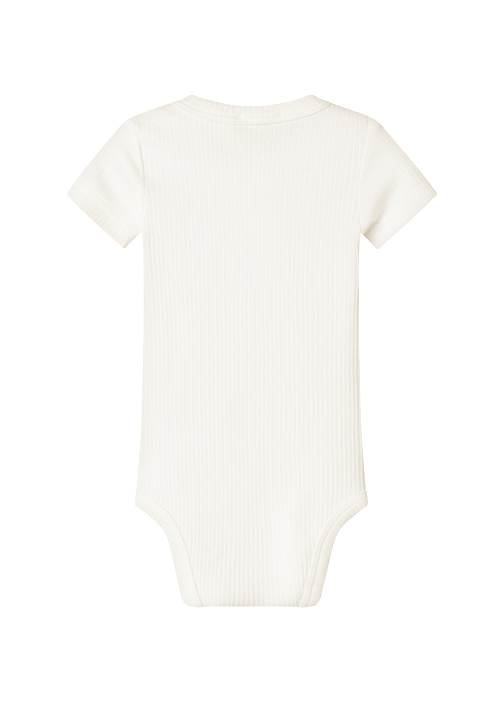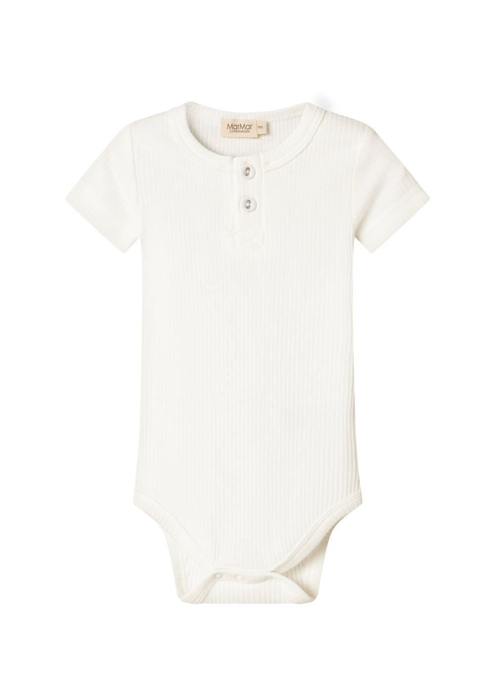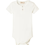 Kortærmet baby modal bodystocking med stolpe knaplukning, der bliver lukket med trykknapper mellem benene for nem bleskiftning.