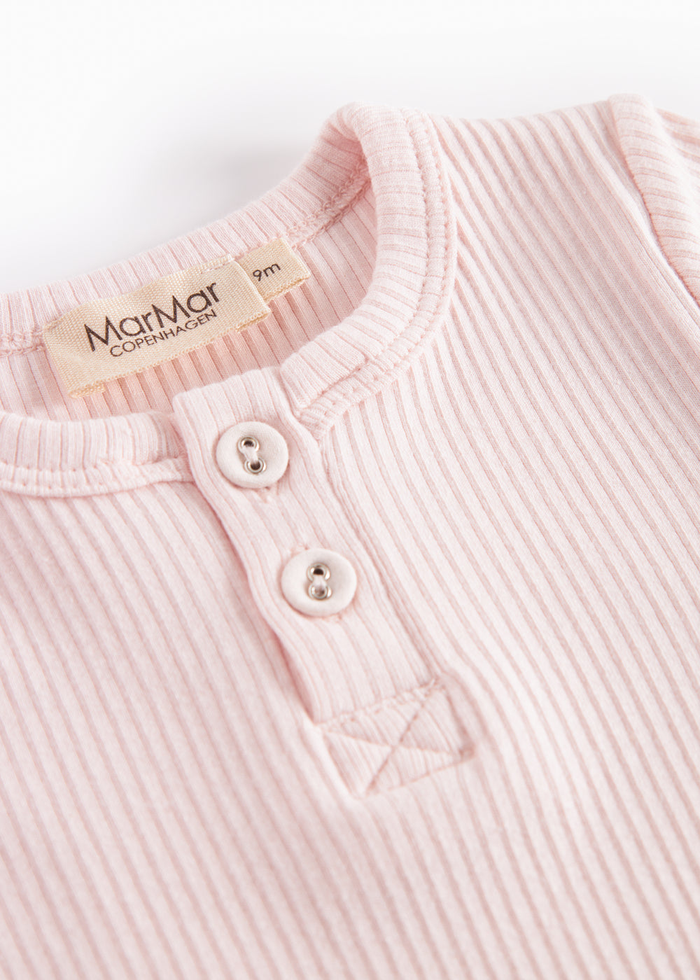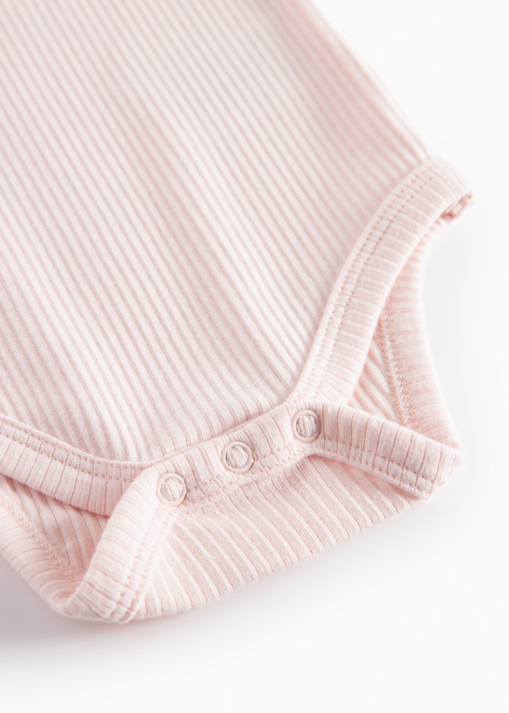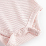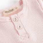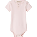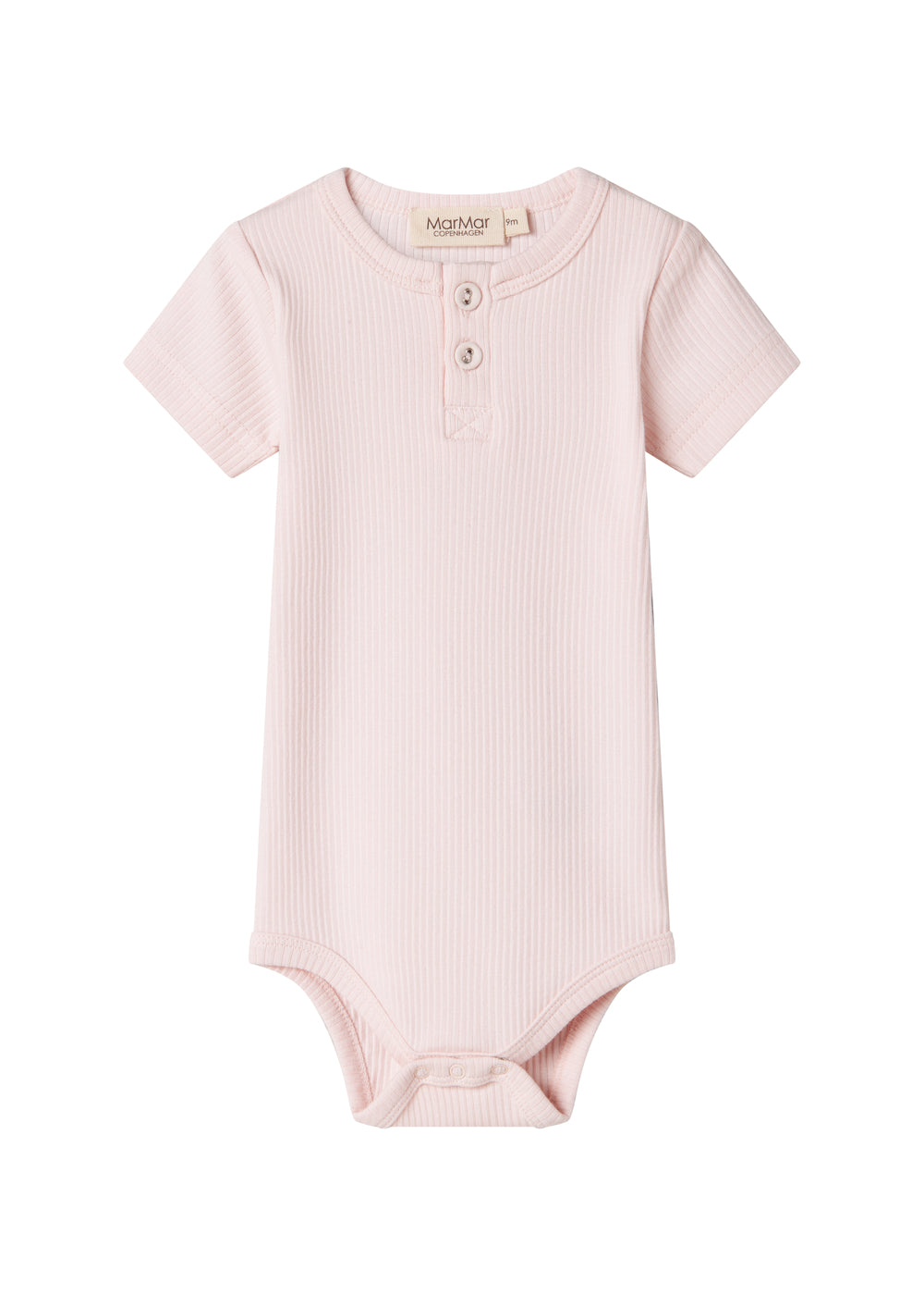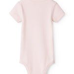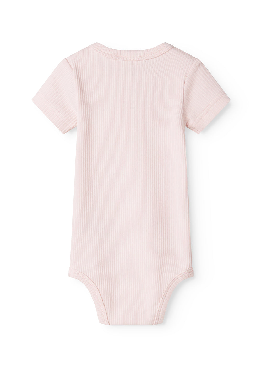 Kortærmet baby modal bodystocking med stolpe knaplukning, der bliver lukket med trykknapper mellem benene for nem bleskiftning.