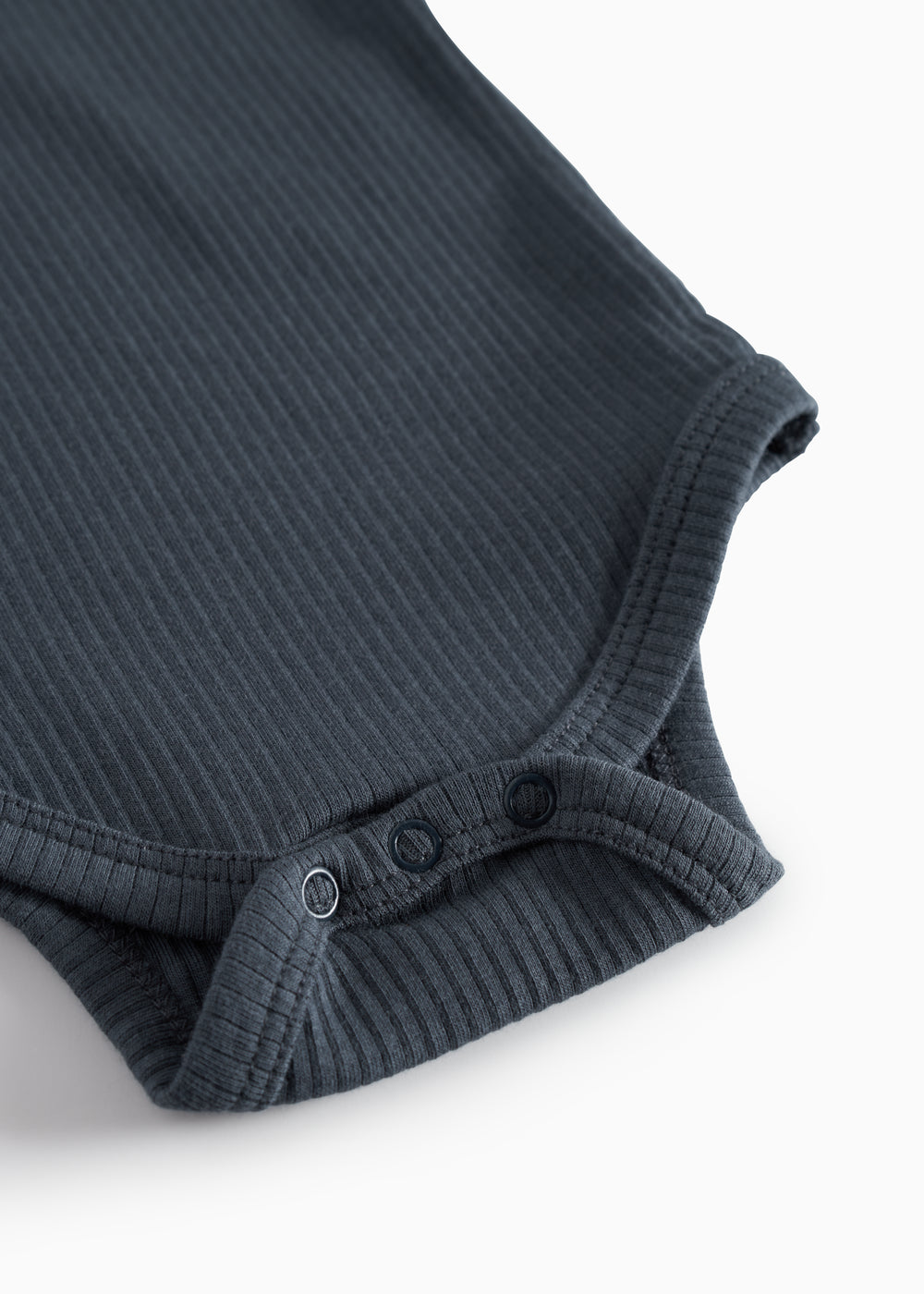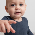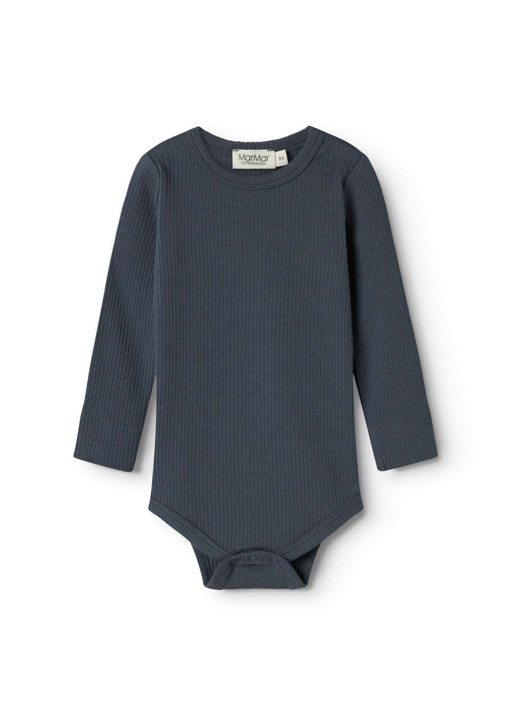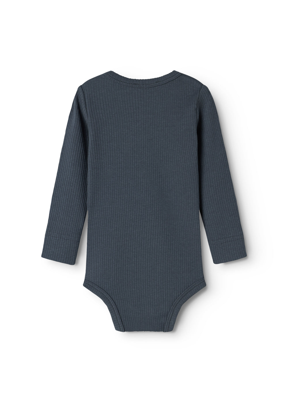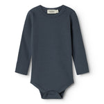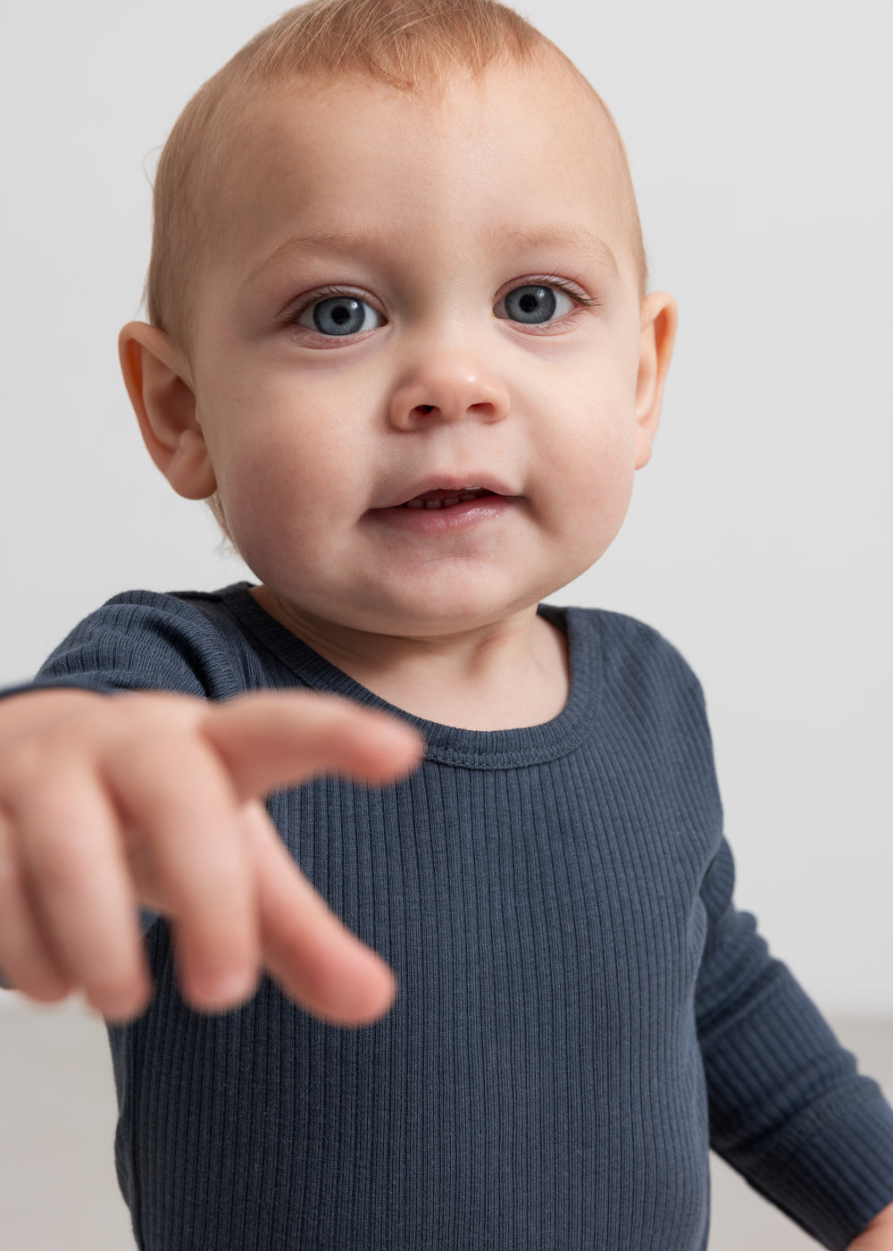 Enkel langærmet baby modal bodystocking, der bliver lukket mellem benene for nem bleskiftning.