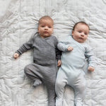 Langærmet heldragt med fødder til nyfødte. Heldragten har slå-om-lukning og lukkes med trykknapper og bindebånd