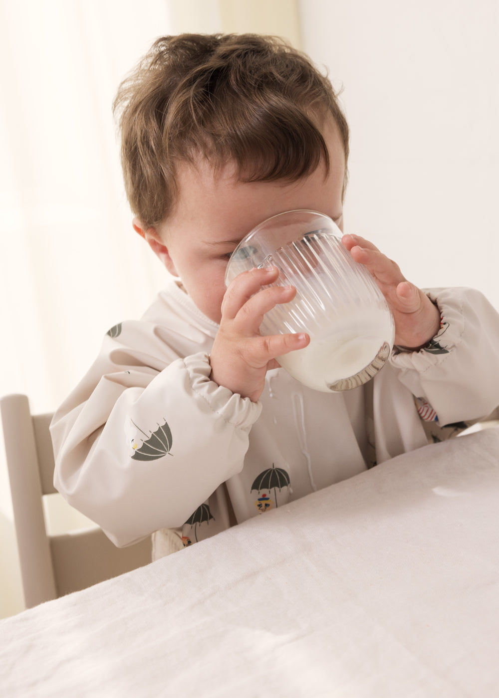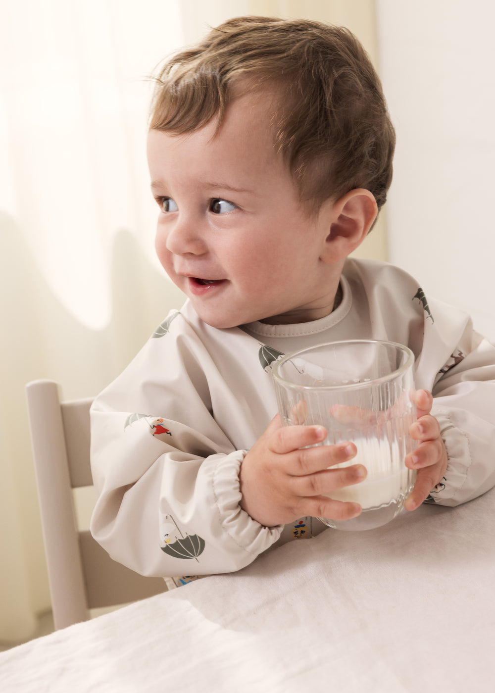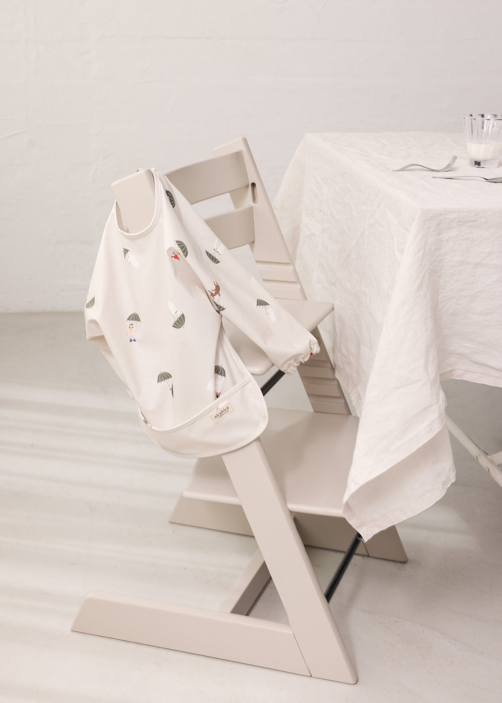 Langærmet spiseforklæde med Moomin print, en praktisk lomme foran, elastik ved håndleddene og lukning med trykknapper i nakken. Spiseforklædet er i et vandafvisende materiale, der er nemt at tørre af.